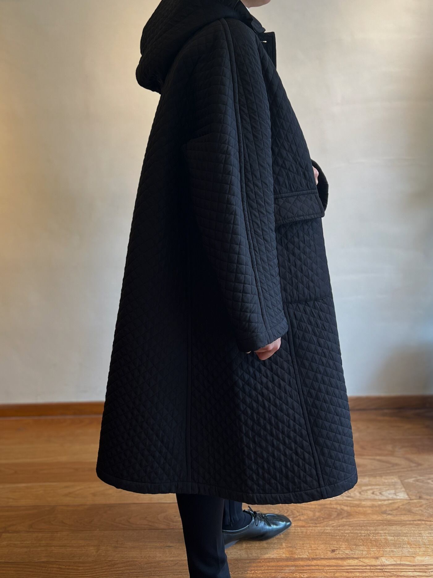ハリとしなやかさのあるキルティングで仕立てた、カジュアルすぎないモダンな模様が大人の装いにぴったりのコート。取り外し可能なフード付きに加え、マットな質感で上品な風合いがデイリーからオンシーンまで馴染む秘訣。ボリュームのあるゆったりとしたシルエットだから、厚手のニットやインナーの上にも気兼ねなく羽織れる1枚です。