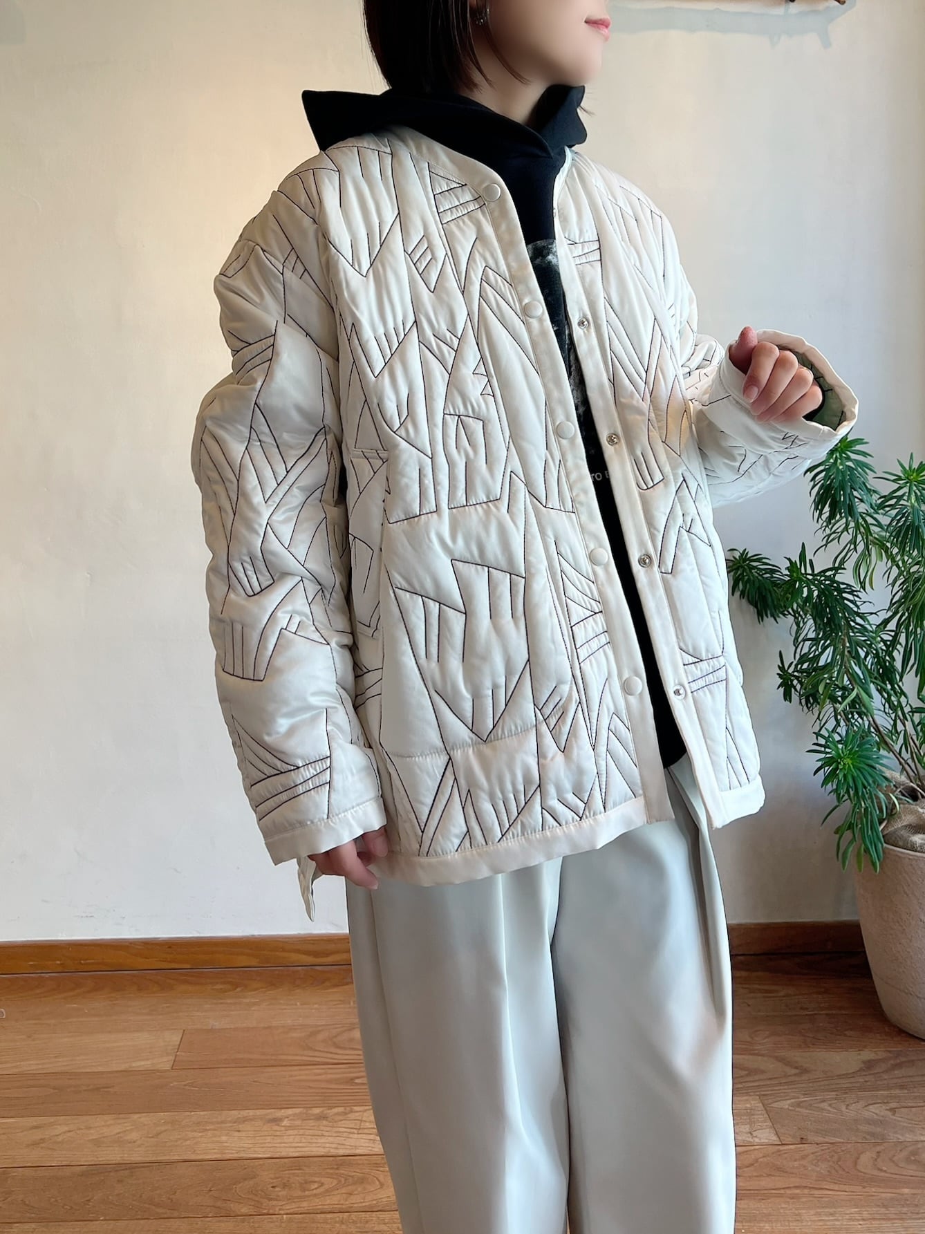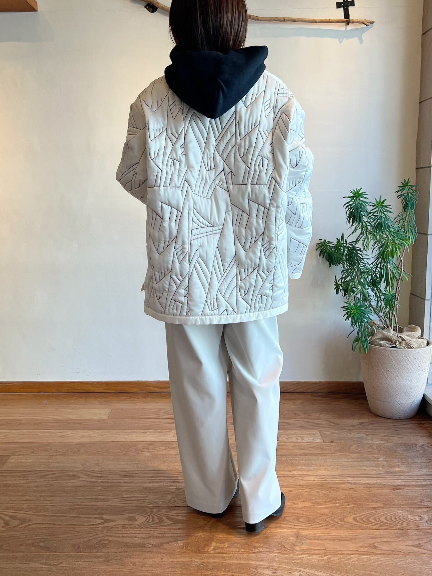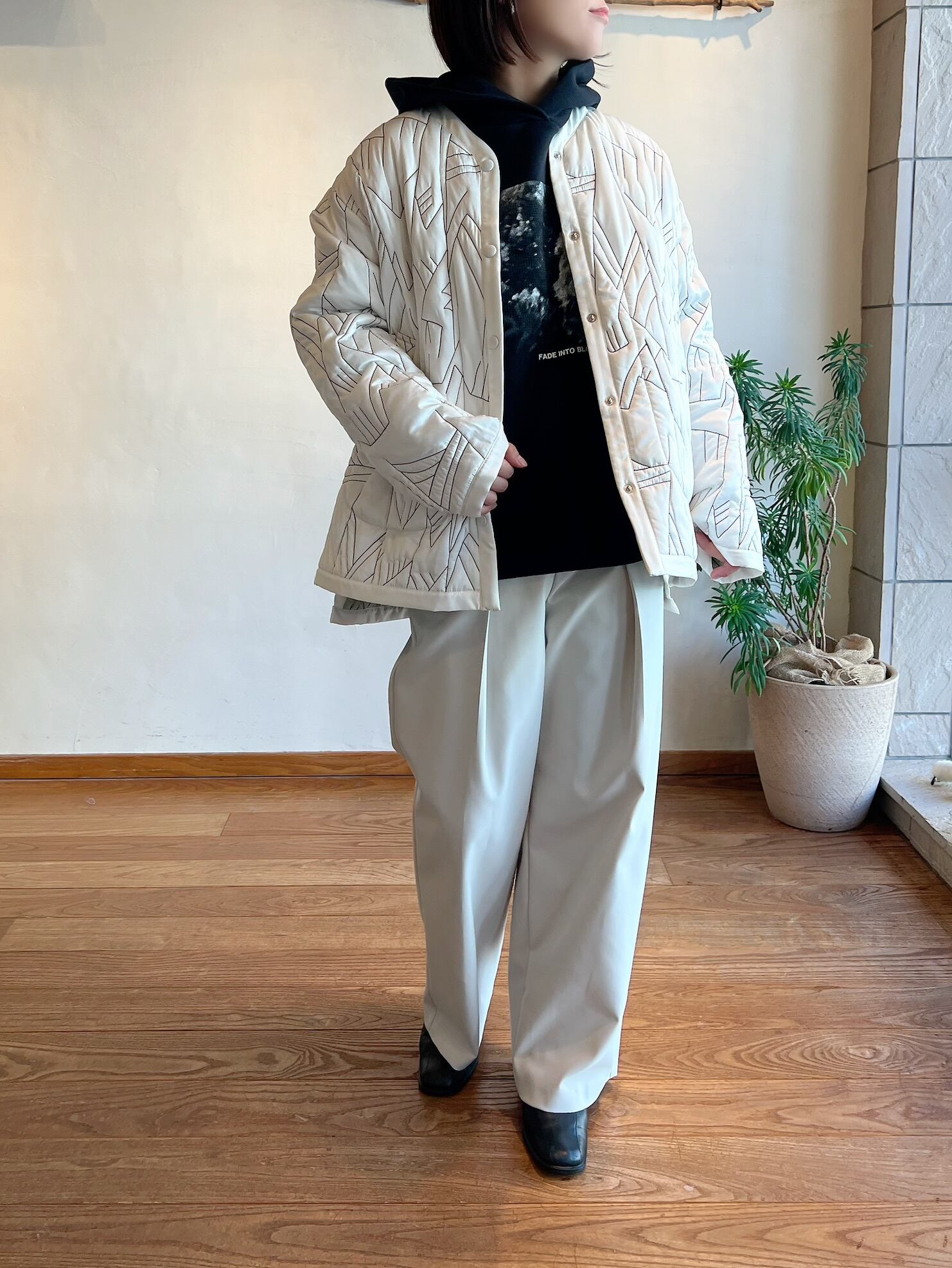 ミリタリーコートのライナーをイメージソースにしたデザイン。クルーネックにすることで上品なデザインに。ノーカラーで首元はすっきりしているのでタートルネックのアイテムとも相性抜群。細かいステッチが入ったハンドウォームポケットがアクセントに。ショート丈がコーディネートするときに合わせるアイテムとのバランスをとりやすく、ウエスト位置が高く見えるためスタイルアップして見えます。