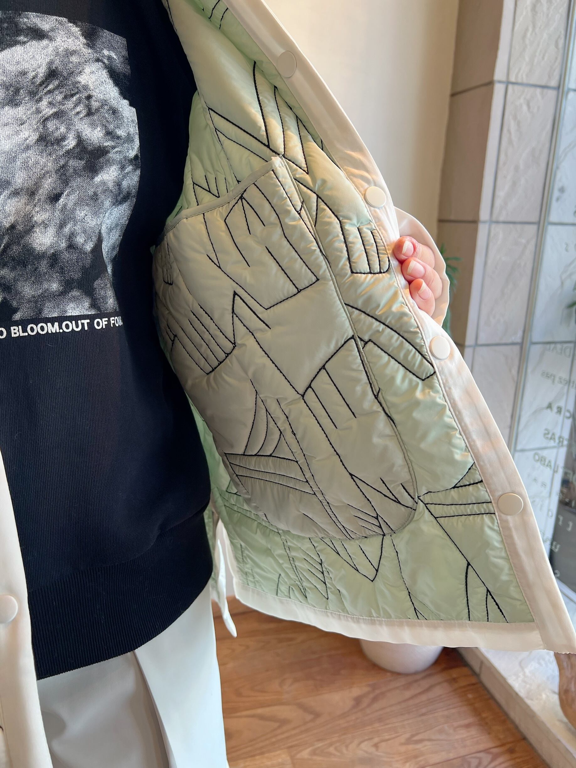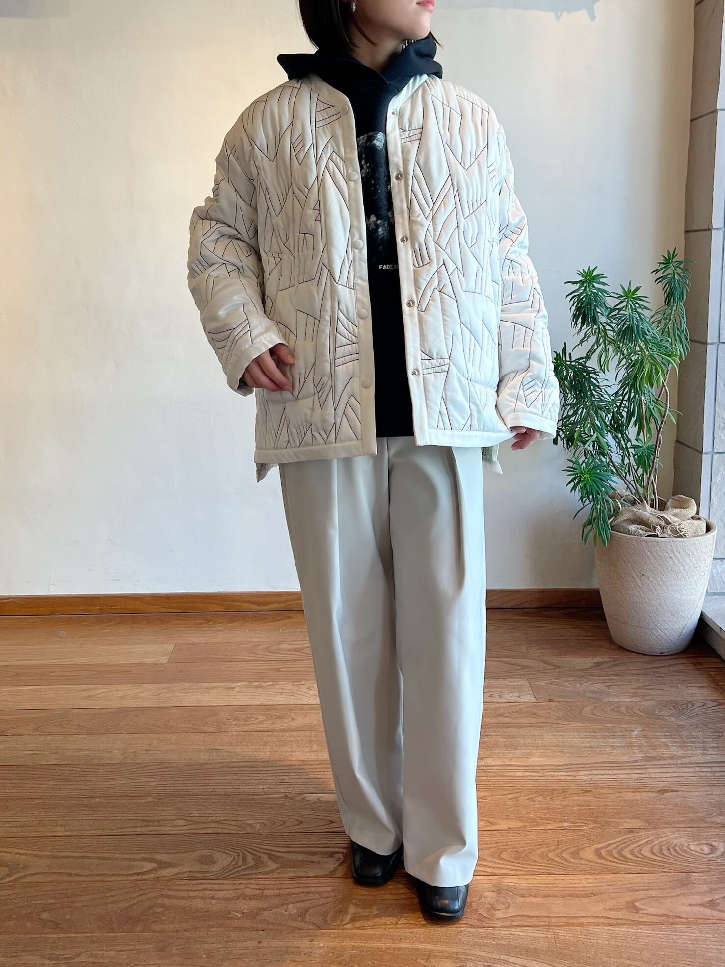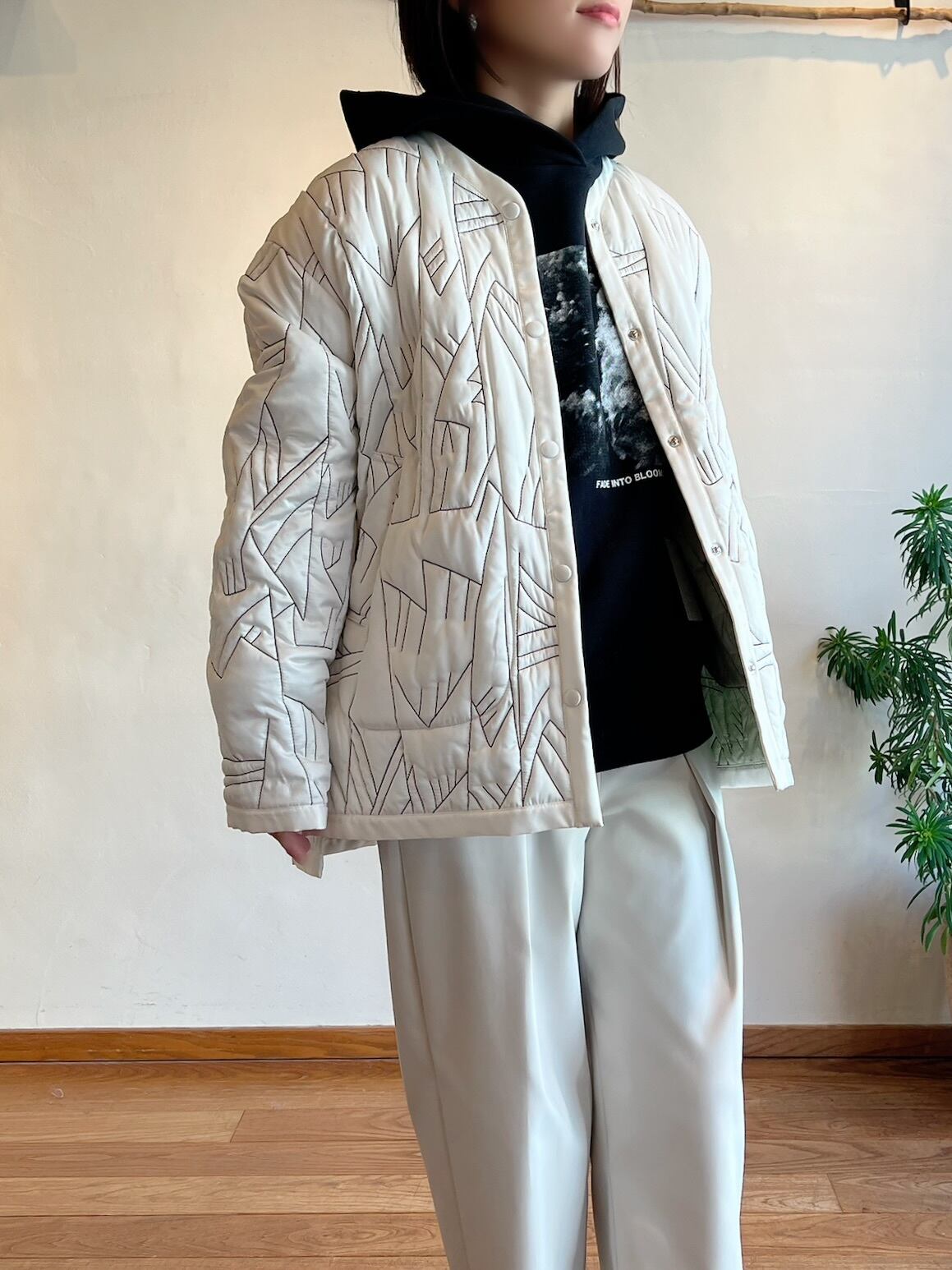 ミリタリーコートのライナーをイメージソースにしたデザイン。クルーネックにすることで上品なデザインに。ノーカラーで首元はすっきりしているのでタートルネックのアイテムとも相性抜群。細かいステッチが入ったハンドウォームポケットがアクセントに。ショート丈がコーディネートするときに合わせるアイテムとのバランスをとりやすく、ウエスト位置が高く見えるためスタイルアップして見えます。
