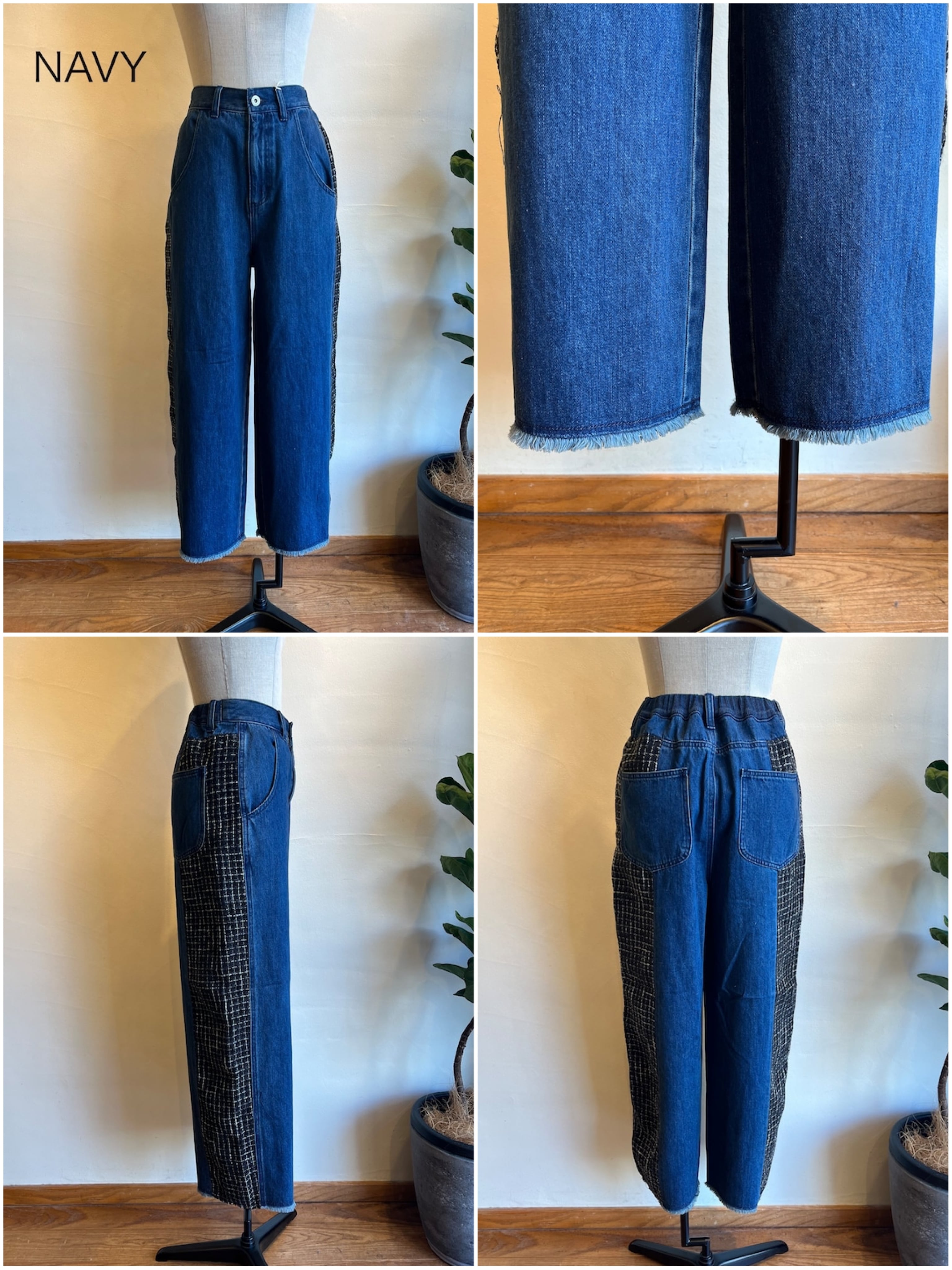 デニムなのにただのデニムじゃない。ツイードが華やかさと女性らしさを演出して、他の人とは被らないコーディネートを楽しんでいただけます。