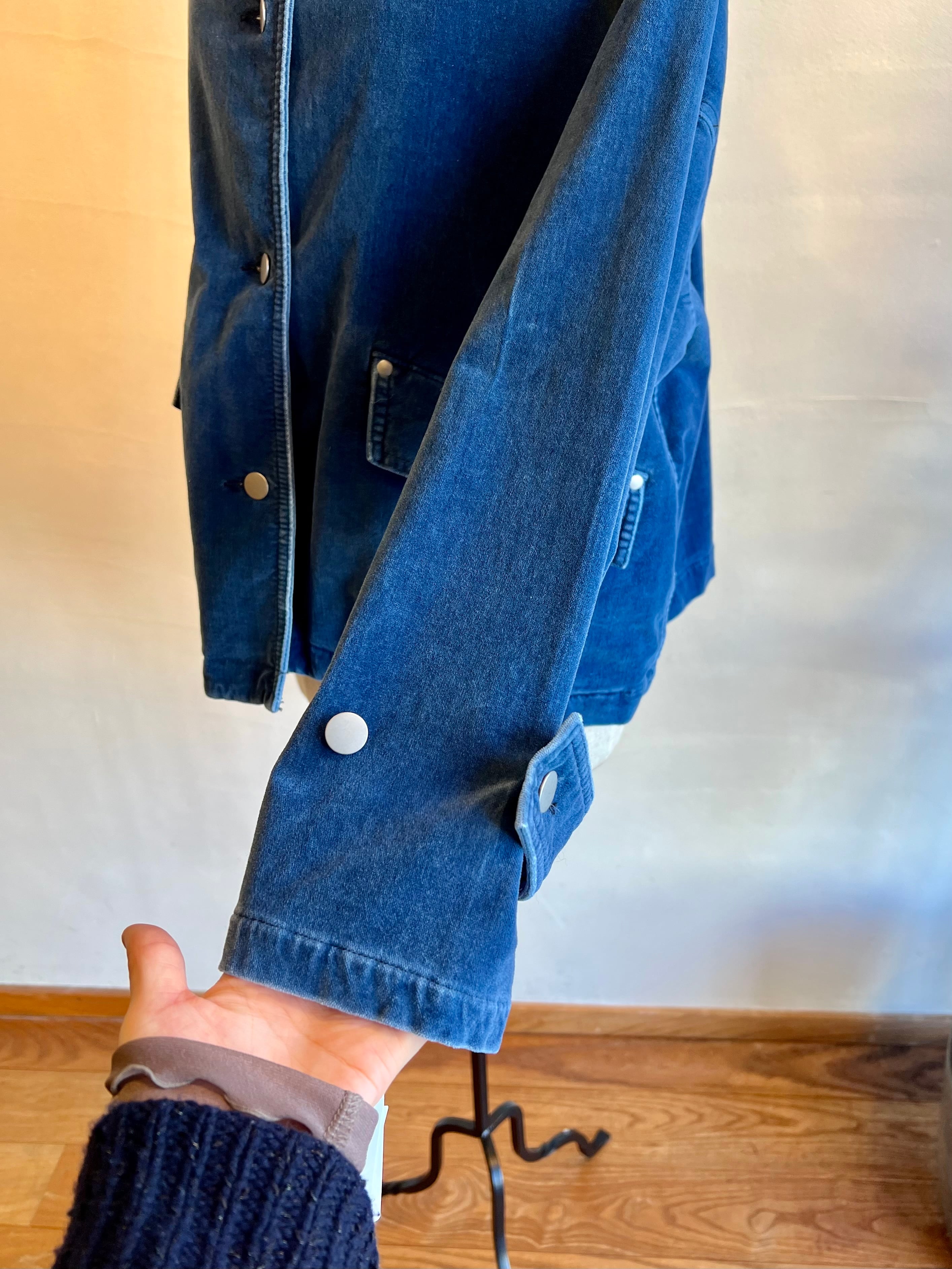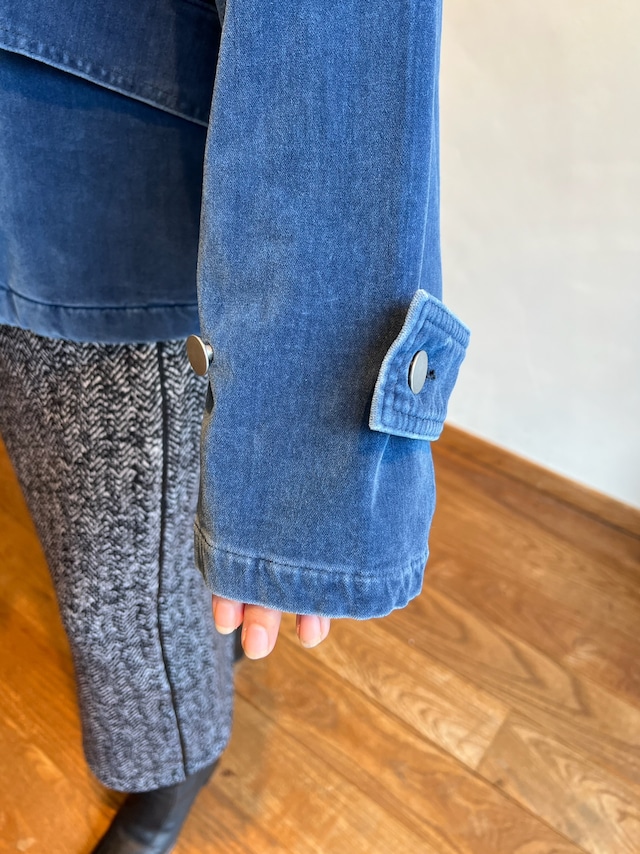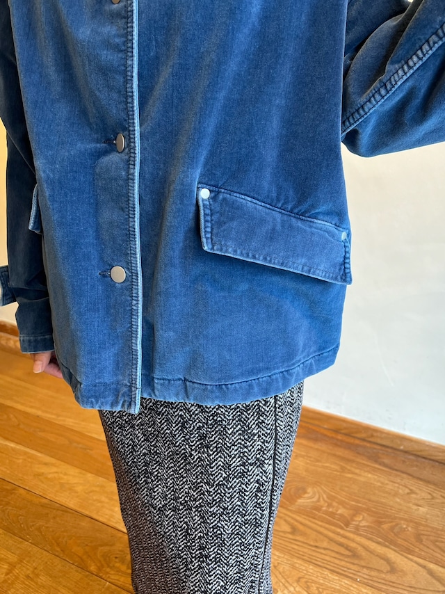 デニムGジャン風なカジュアルな風合いを残しつつ別珍素材の光沢感と上品さをプラスした女性らしいジャケットです。スッキリとしたノーカラーネックでタートルや衿つきのお洋服ともコーディネートしやすいです。別珍素材なのでデニム素材特有の重さや窮屈感もなく、ストレスフリーな着用感。Gジャン感覚でどんなお洋服とも合わせられる万能アイテム。