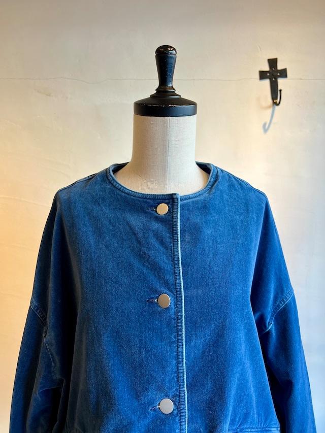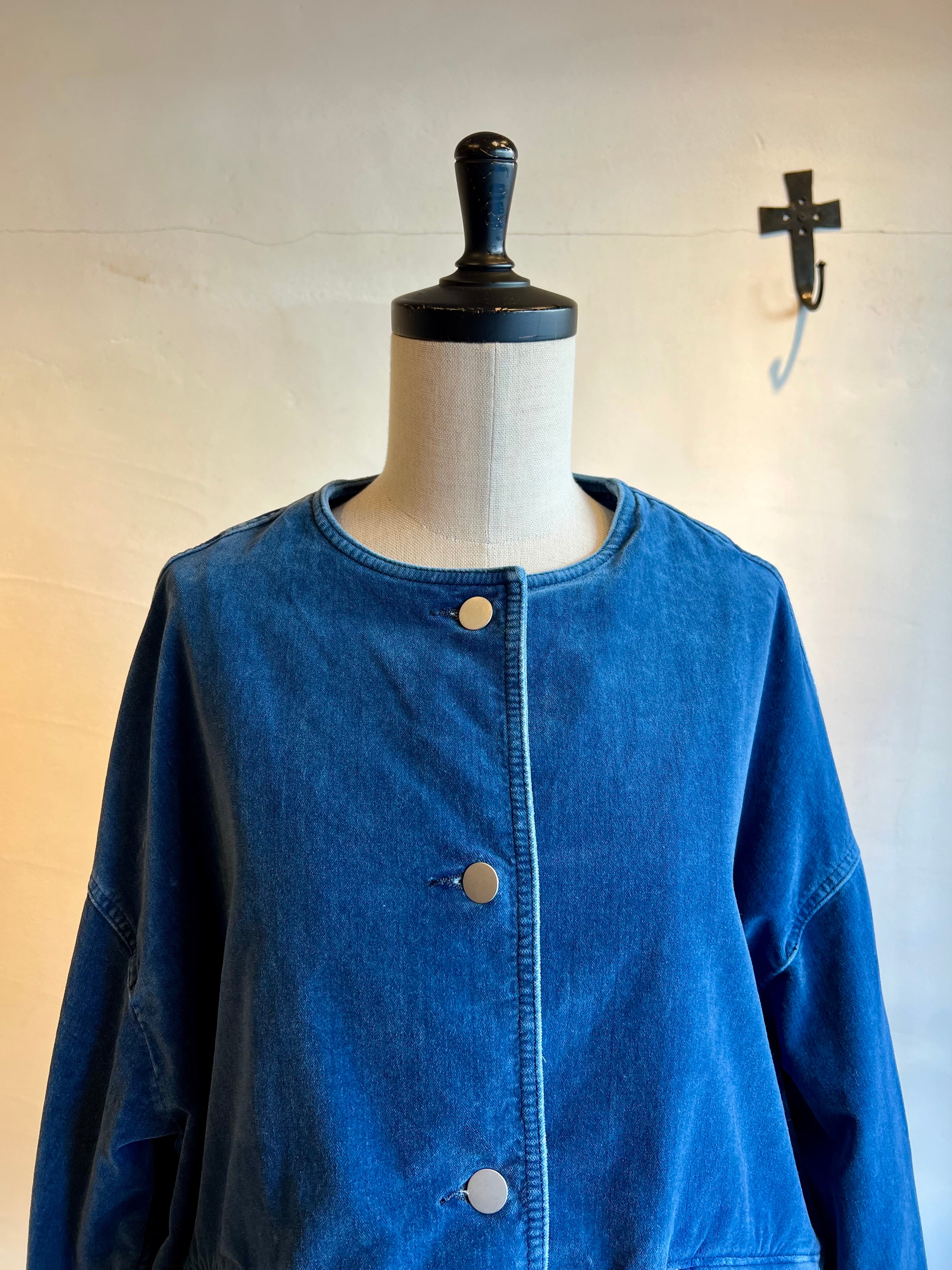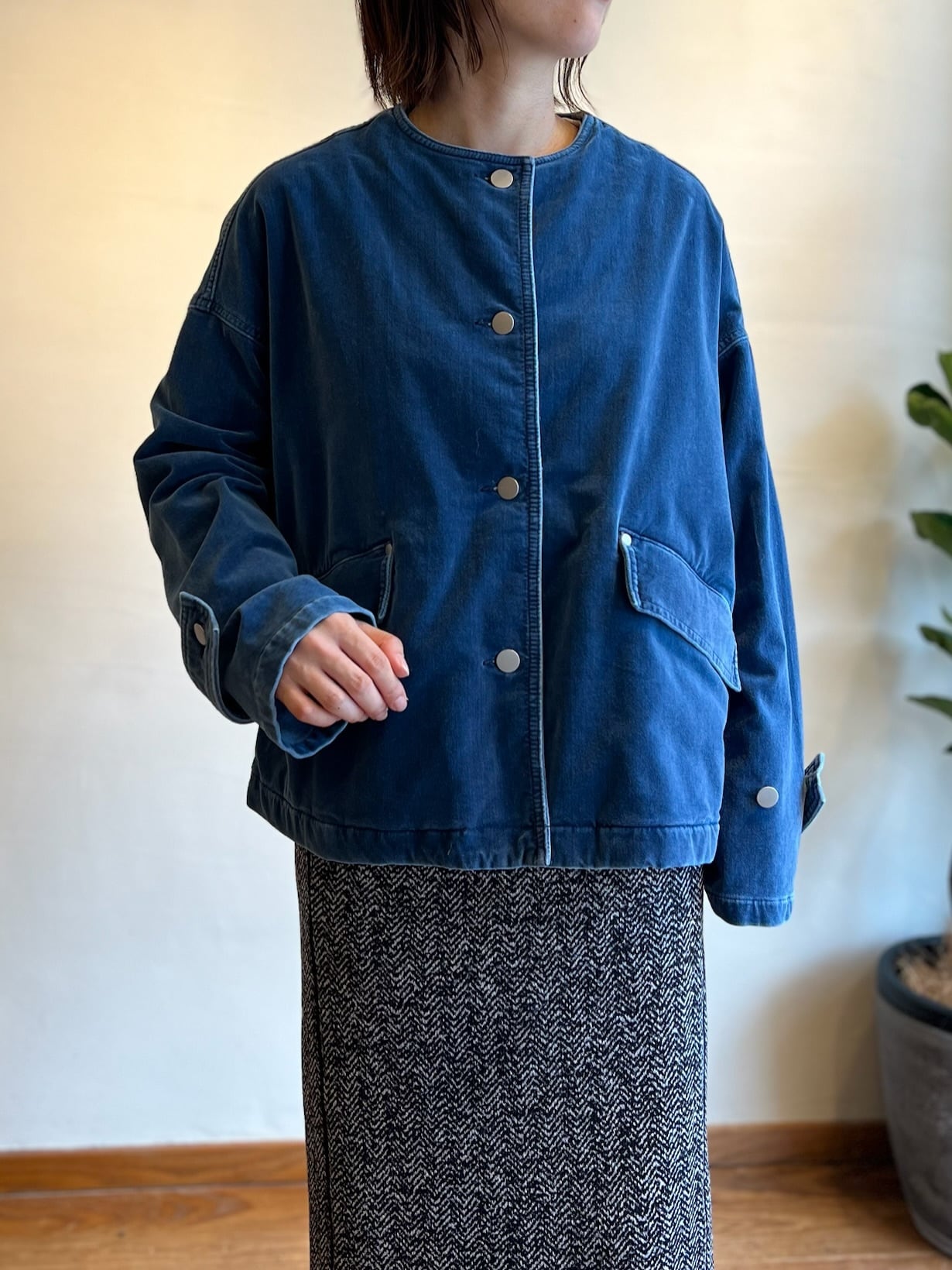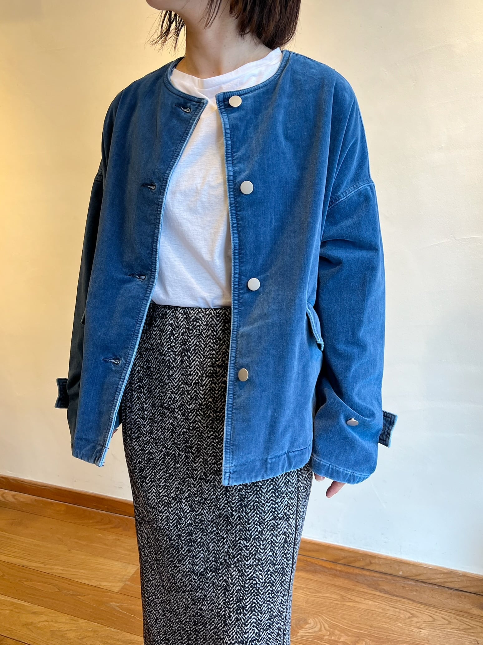 とても温かい!と好評なDignite collier(ディニテコリエ)の別珍デニムシリーズから、ノーカラージャケットが登場です。