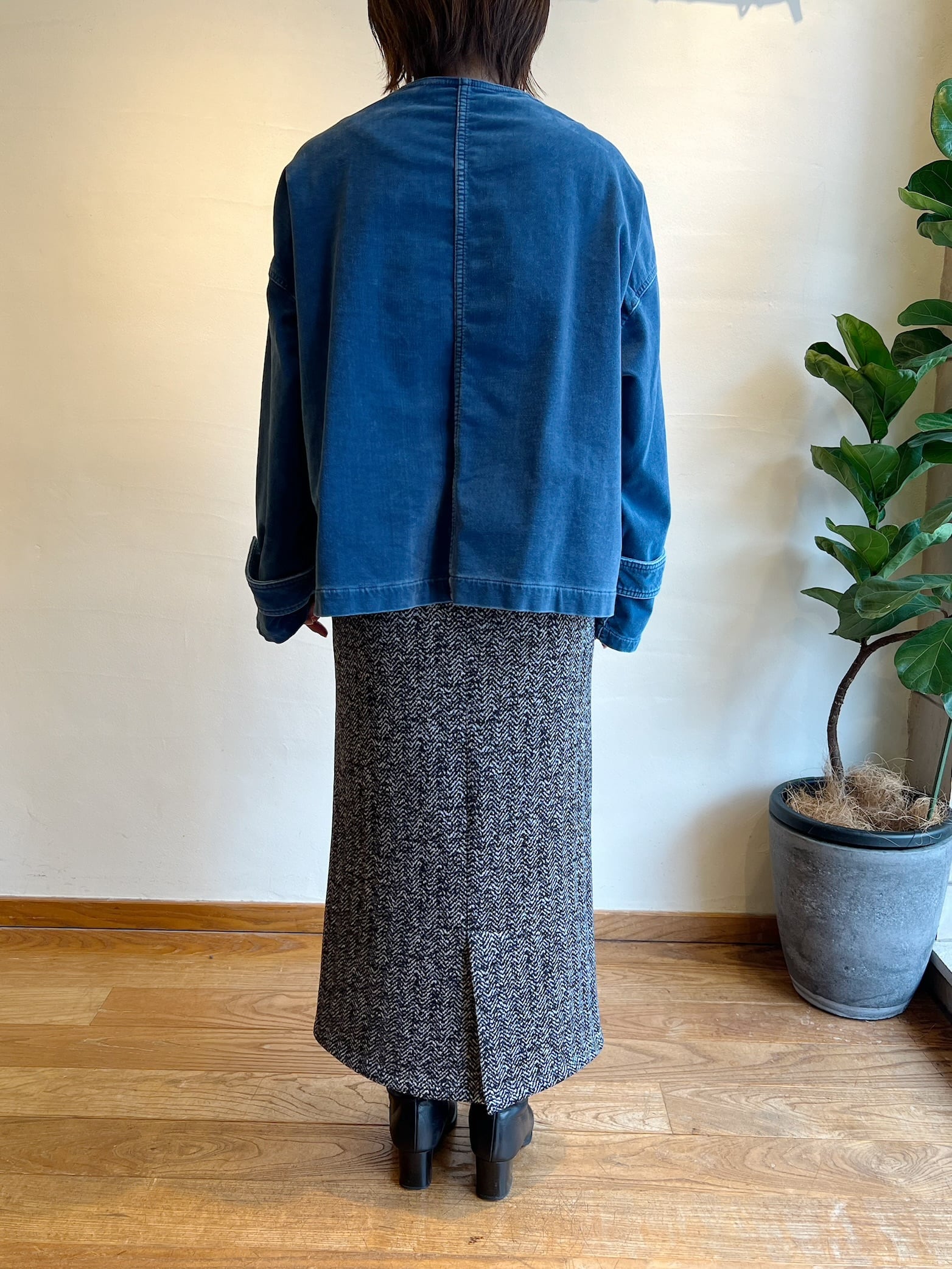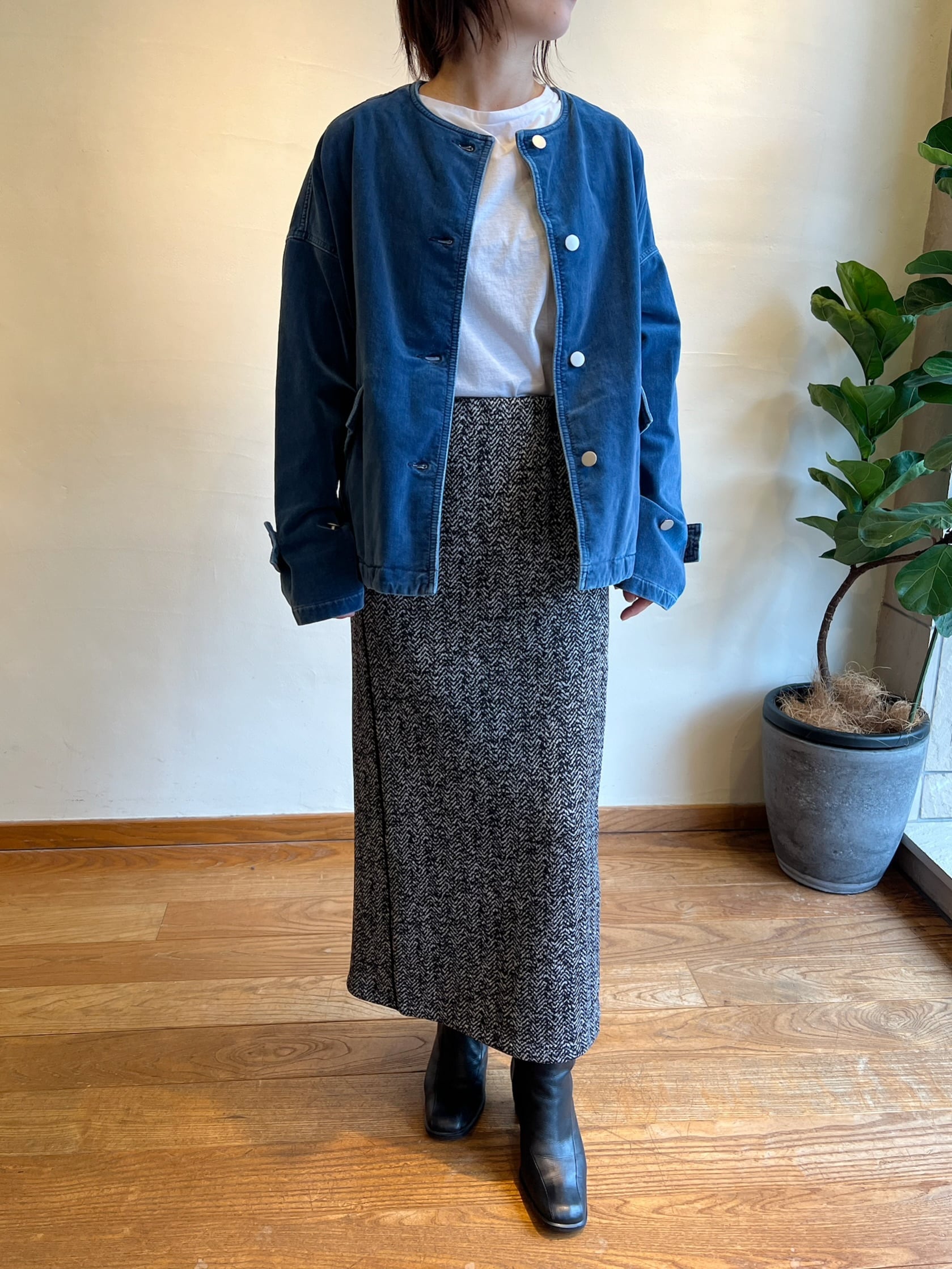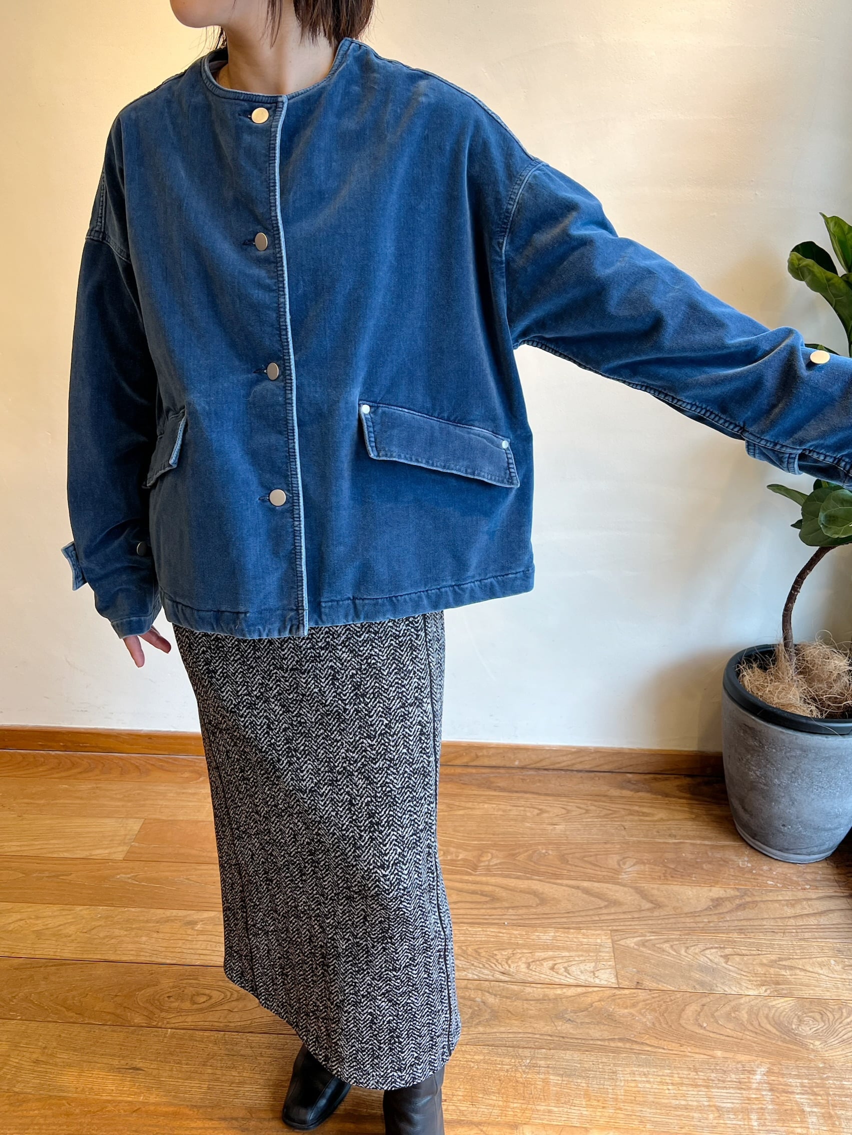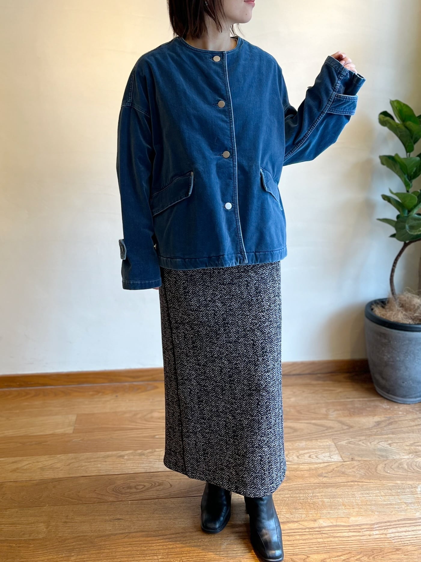 とても温かい!と好評なDignite collier(ディニテコリエ)の別珍デニムシリーズから、ノーカラージャケットが登場です。