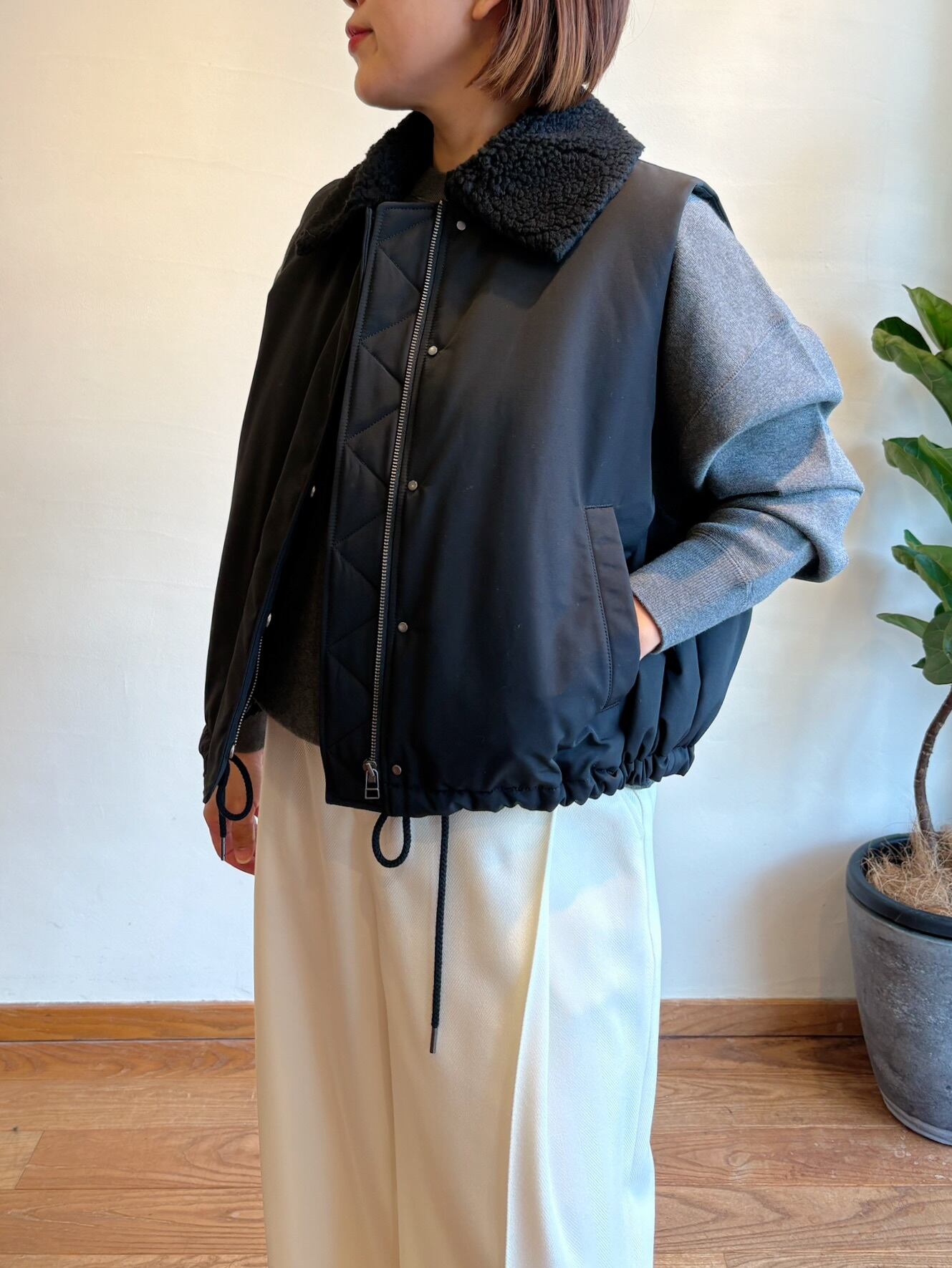 SOLD OUT アウター素材の名門イタリアOLMETEX社の上質な生地を使用したジレ。高密度に織られたよこ畝が特徴のタッサー素材は上品な光沢とハリ感が特徴です。膨らみとハリを併せ持った中綿を内蔵し、ドローストリングで結ぶことで丸みを帯びたフォルムが際立ちます。ウール混ボア素材を使用した大きめの衿もキャッチーなポイント。上質素材でつくり上げた存在感抜群な一着です。
