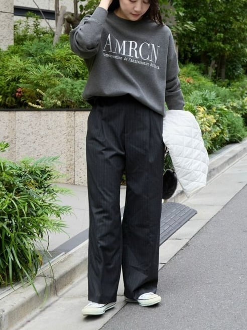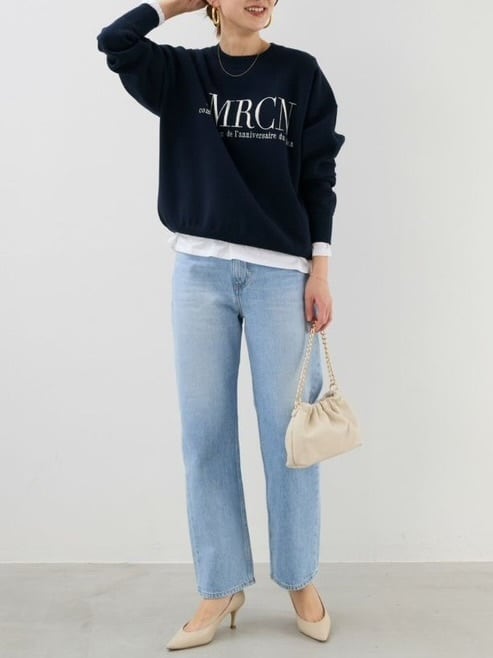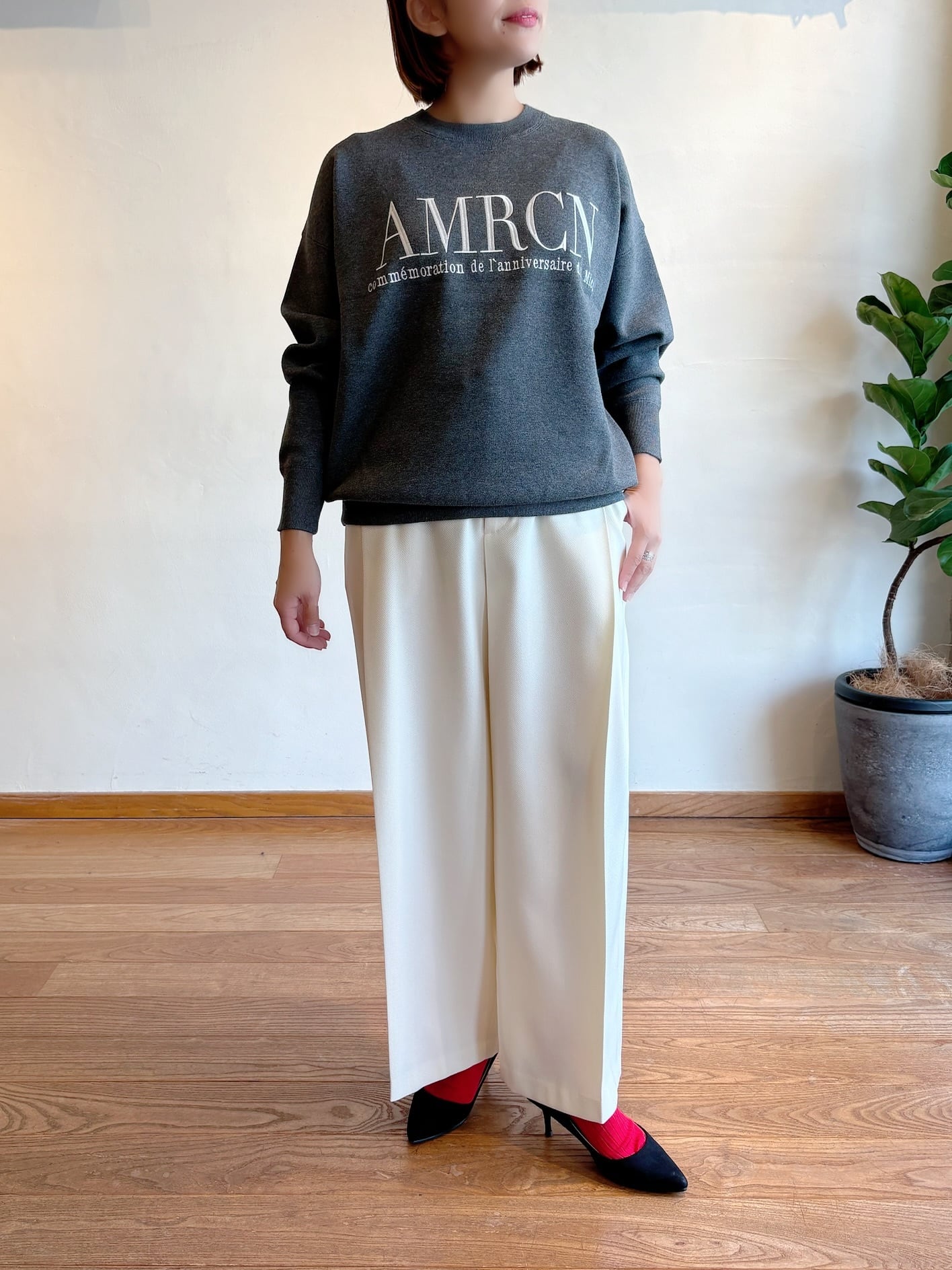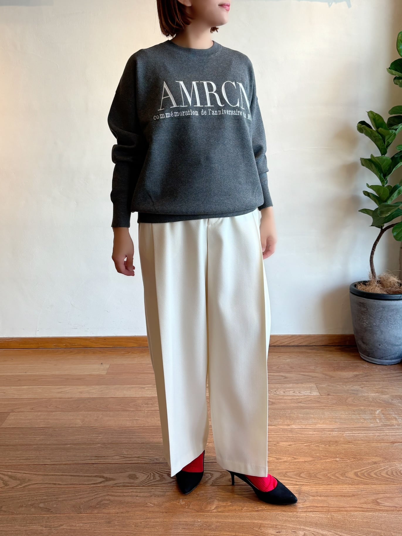AMERICANAとコラボレーションしたニット。程よくゆとりのあるスクエアシルエットで、着心地が魅力のクルーネックニット。胸元に光沢のあるロゴ刺繍を施し、すっきりとした印象に仕上げました。カジュアルなロゴニットも、目面がきれいな素材を使用することで大人っぽく仕上げています。