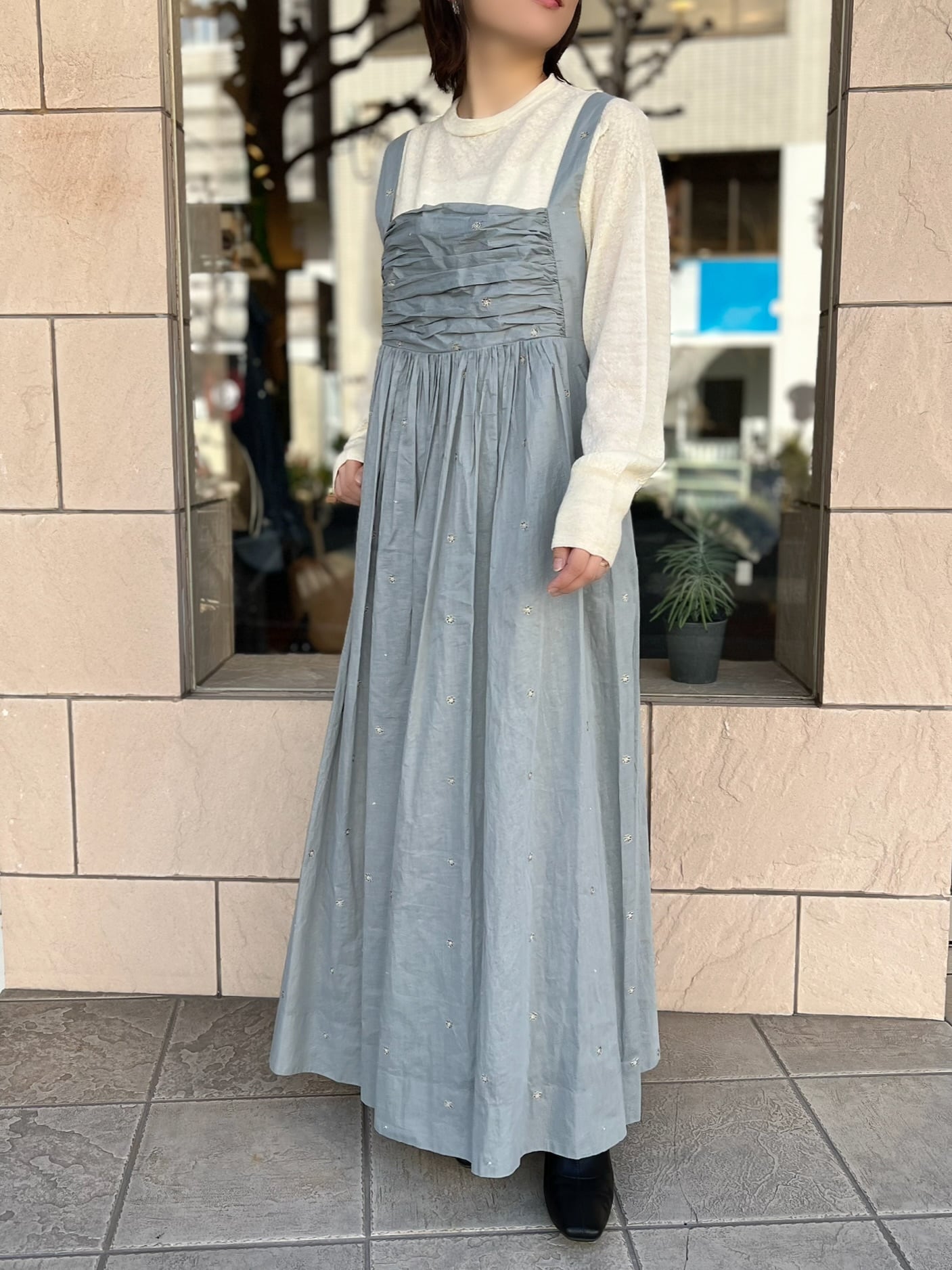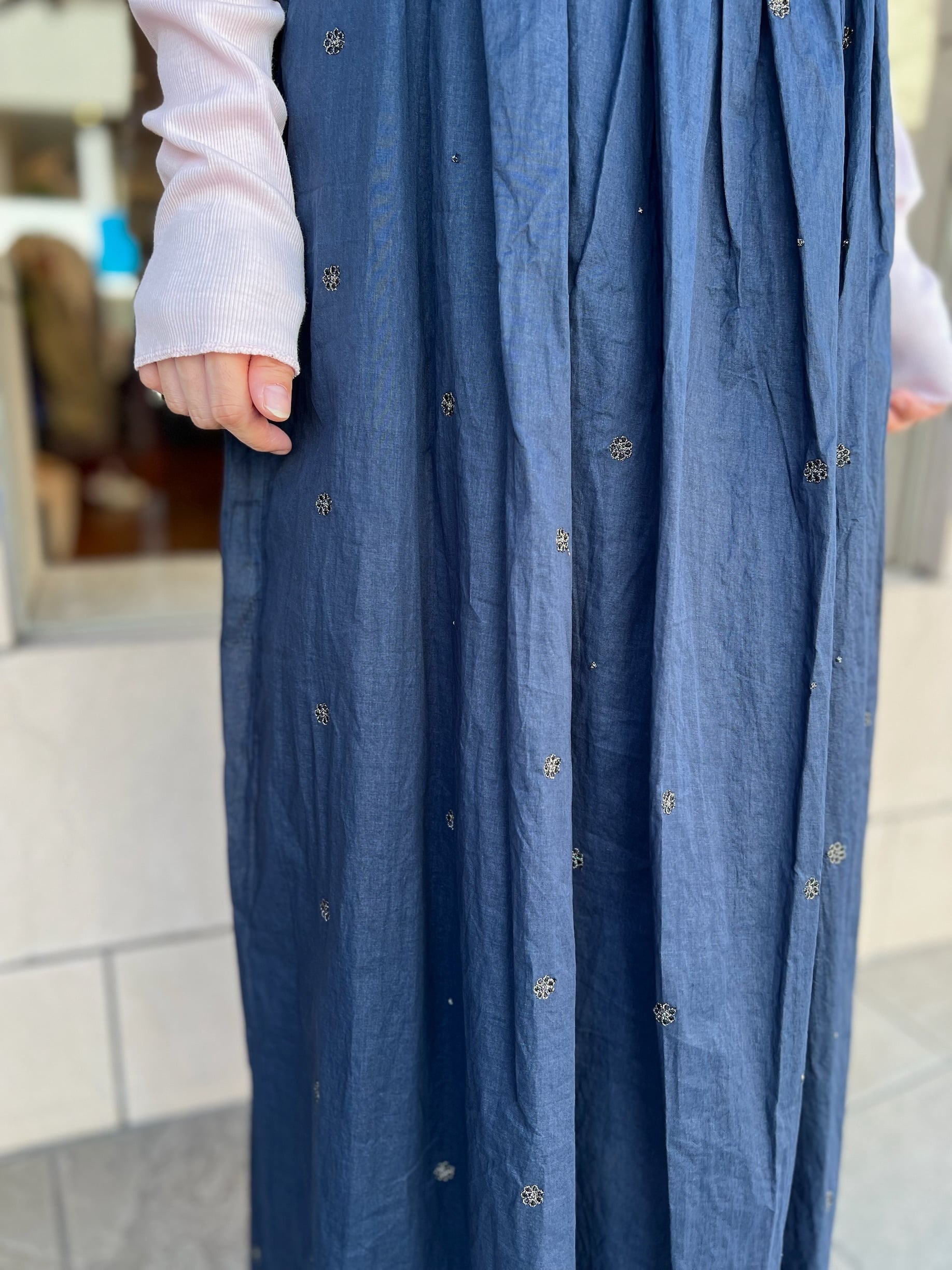 胸元にたっぷりとギャザーを寄せて、フェミニンな魅力を詰め込んだロングドレス。ザリ刺繍と呼ばれるインドのクラフトが、ところどころにきらめきを添えます。薄く繊細なコットンオーガンザの重なりに、裏地のコットンボイルがやさしくエアリーなふくらみをつくりつつ、背のゴムギャザーとサイドのファスナーあきで適度にフィットするつくり。インナーに選ぶ薄手のニットやTシャツ、季節が進めばシアーなトップスに、などと肌見せのバランスを変えてお楽しみください。