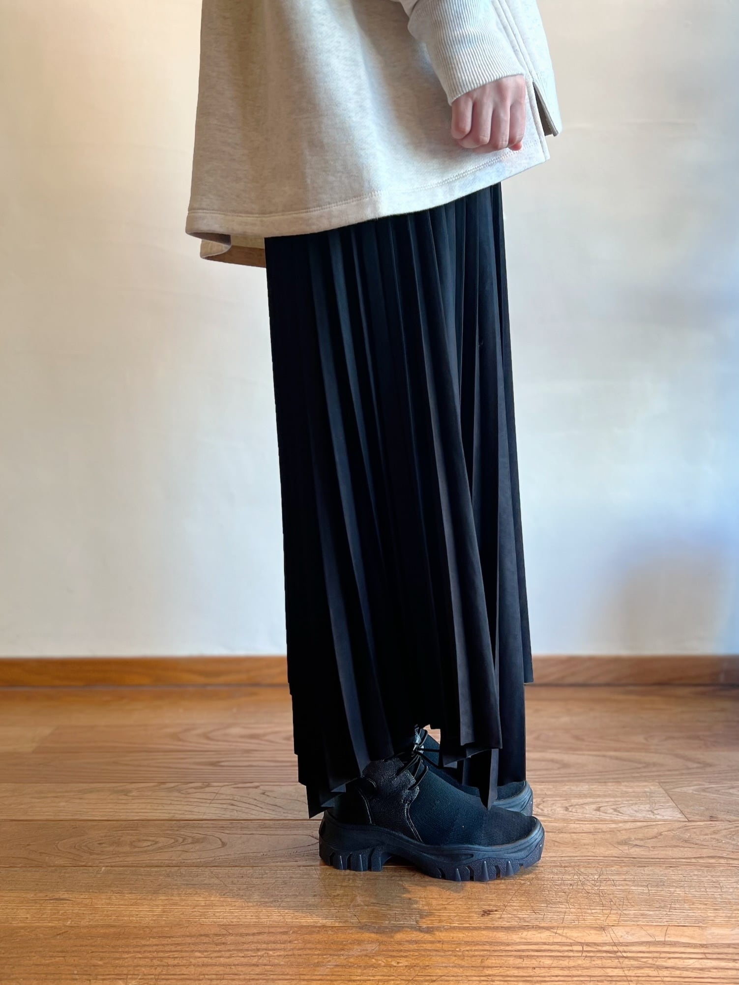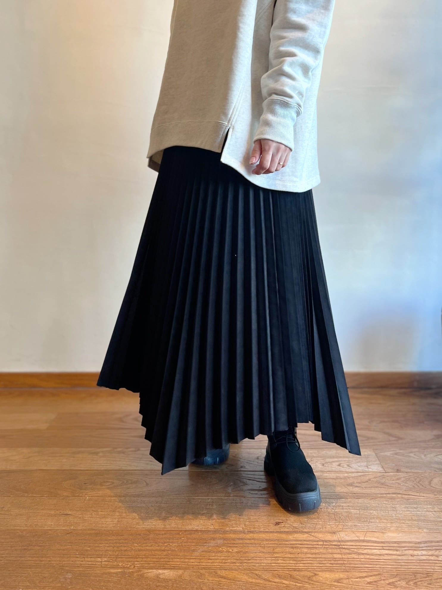 ソフトな柔らかさと滑らかなタッチが特徴のスエードライク素材を使用したプリーツスカート。ランダムなヘムラインがポイントで、軽やかなこなれ感のある足元を演出してくれます。広がりすぎないシルエットも大人な印象。足元次第でカジュアル~きれいめまで様々なスタイリングを楽しめます。