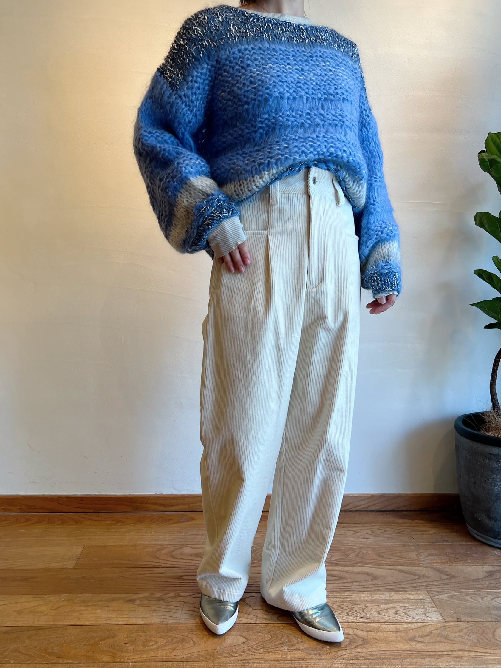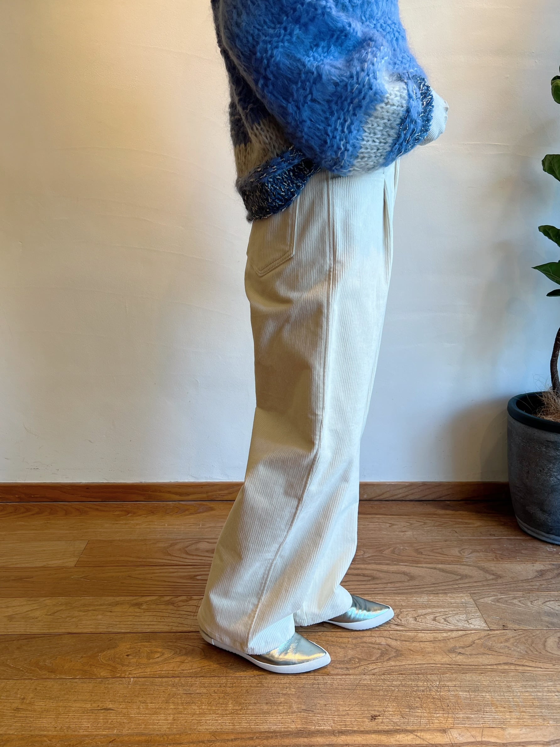 ニットやカットソー、スウェットとマルチにコーディネートしやすく、コーデュロイの質感がシーズンムードを高めてくれます。さりげなく入ったタックもポイント太すぎないワイド感でバランスの取りやすいラインです。