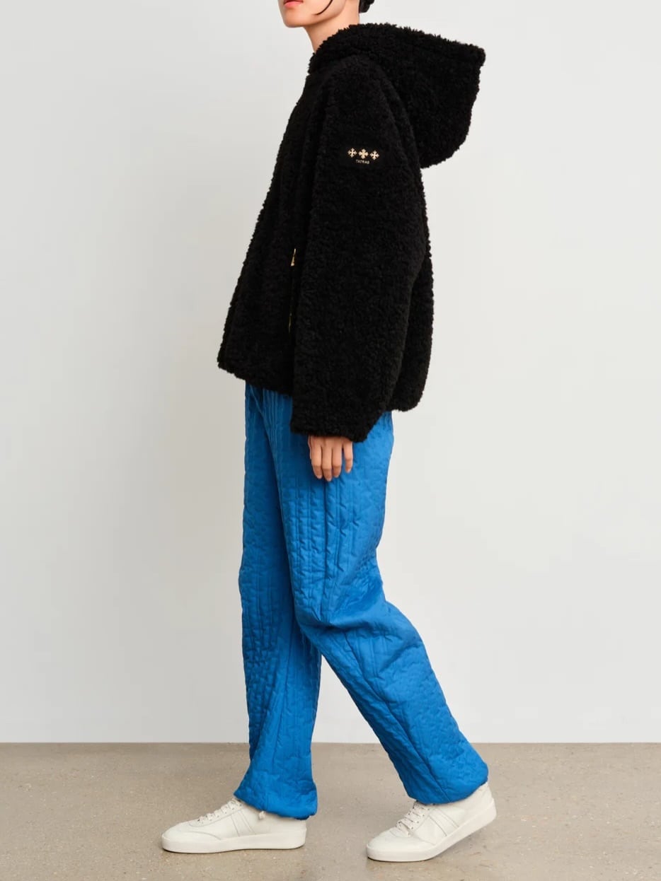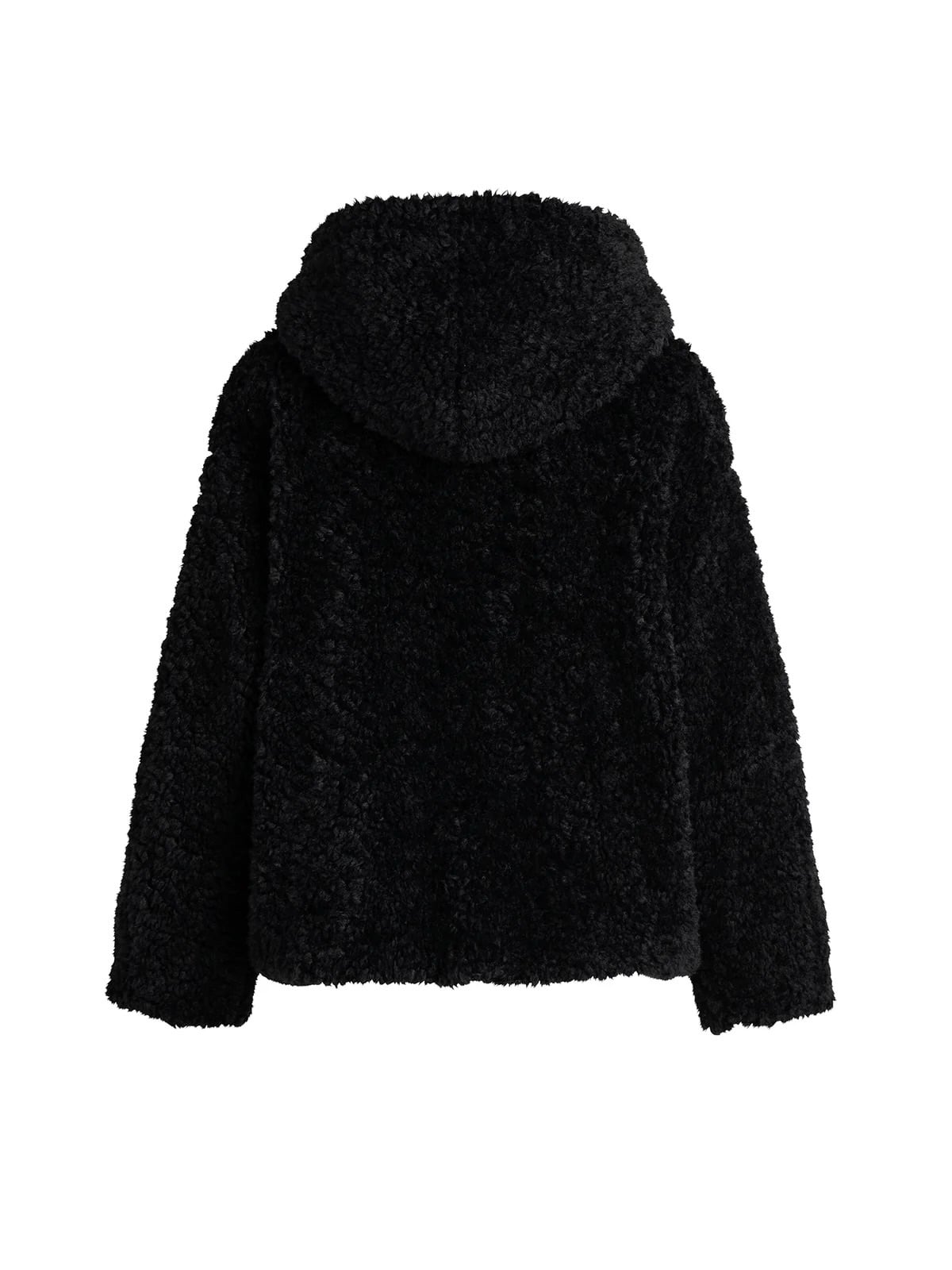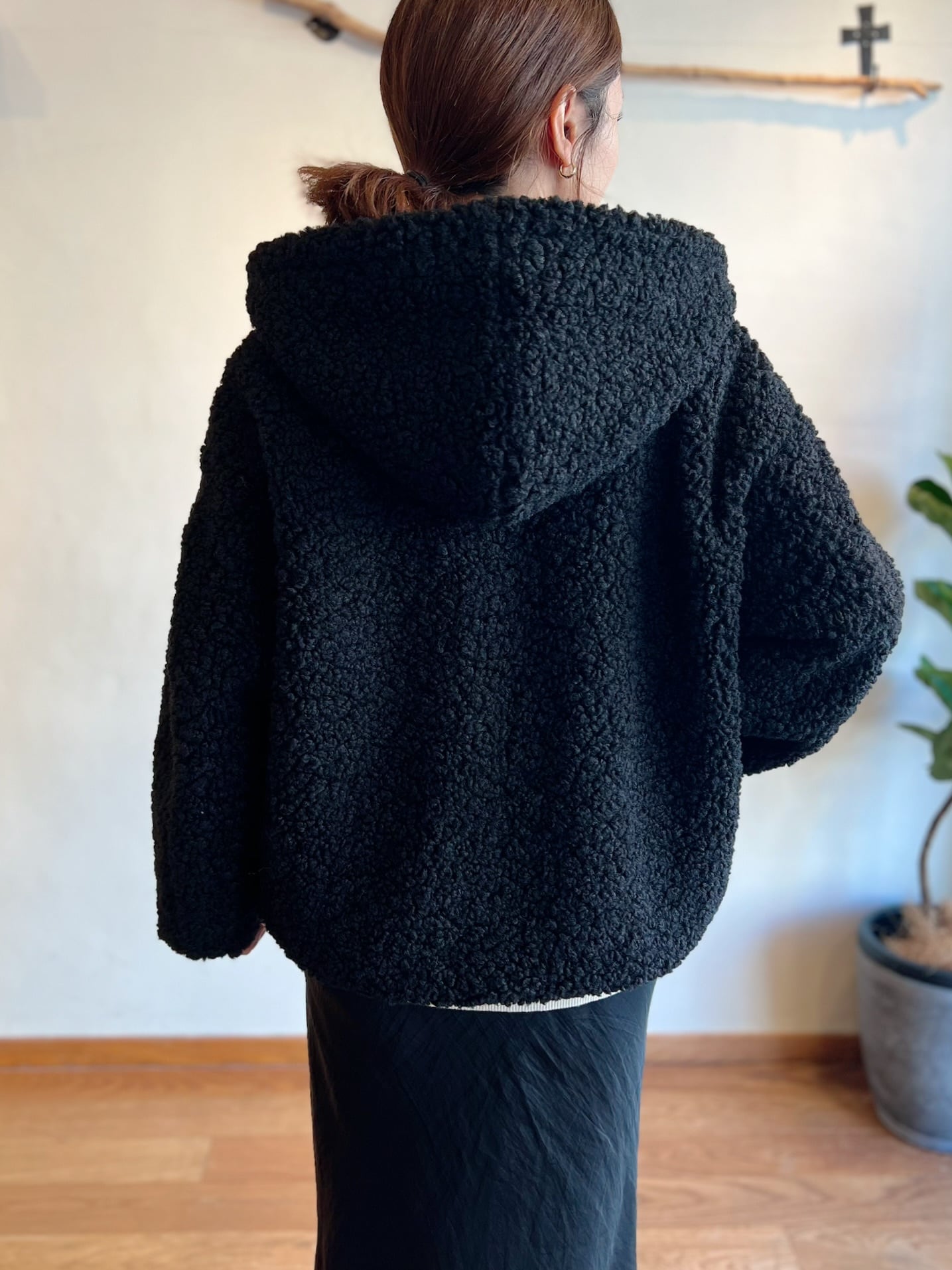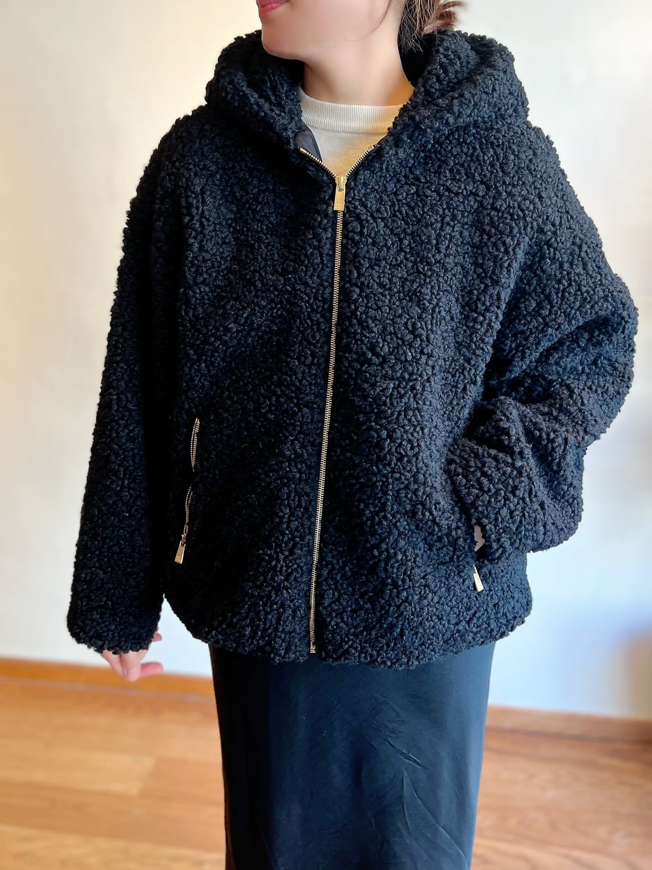 ポリエステル糸でウールライクな質感を実現させた、シープ調ボアのフード付きブルゾン。