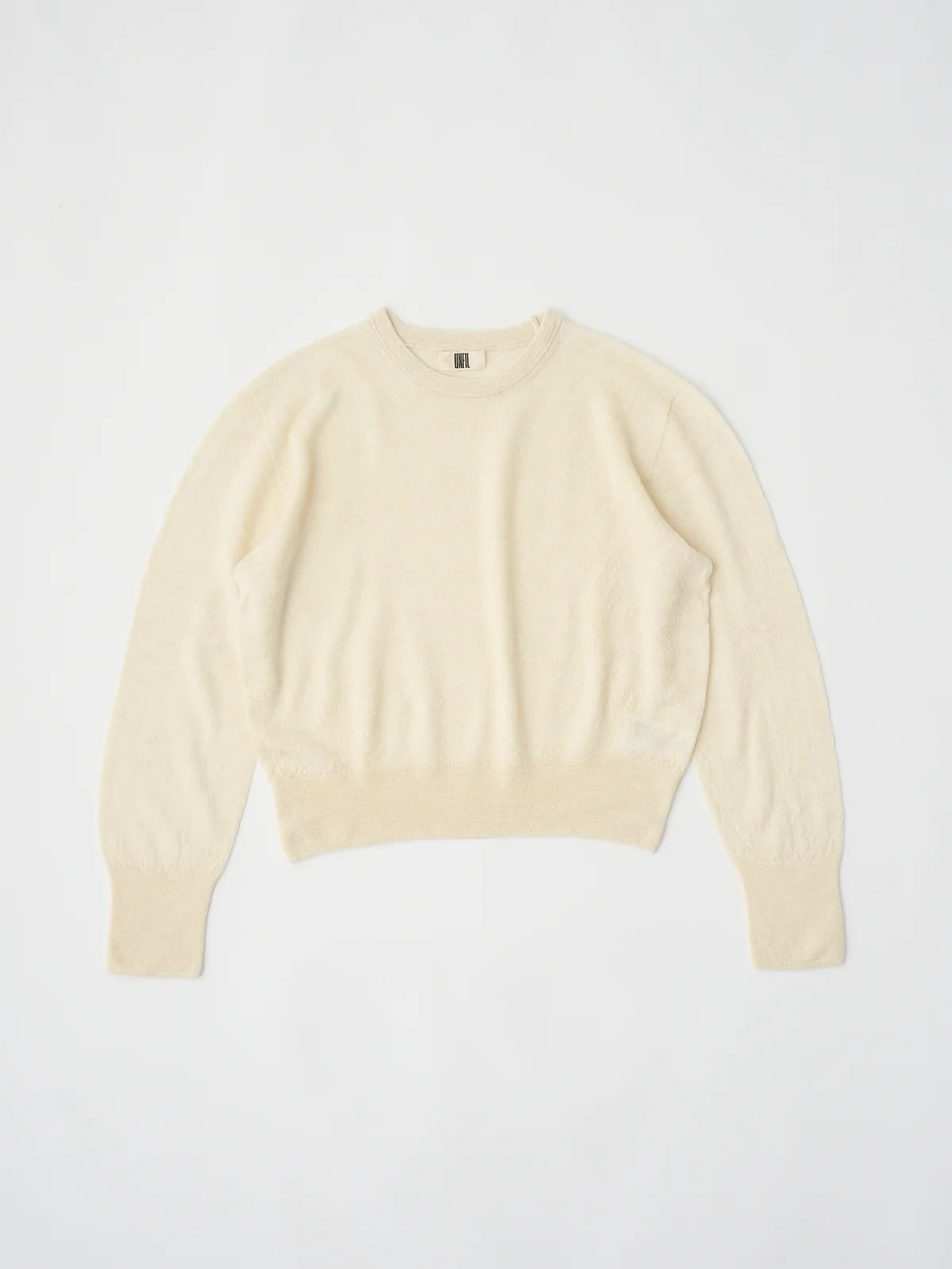 ハイネックや、リブ組織が苦手な方でも着用しやすいベーシックな丸首プルオーバーです。程よい透け感と、アルパカ特有のしぼが良いアクセントになっています。薄手なのにベビーアルパカ100%で暖かく、秋や春は一枚で、真冬はインナーに大活躍。同素材のタートルとの重ね着もおすすめです。