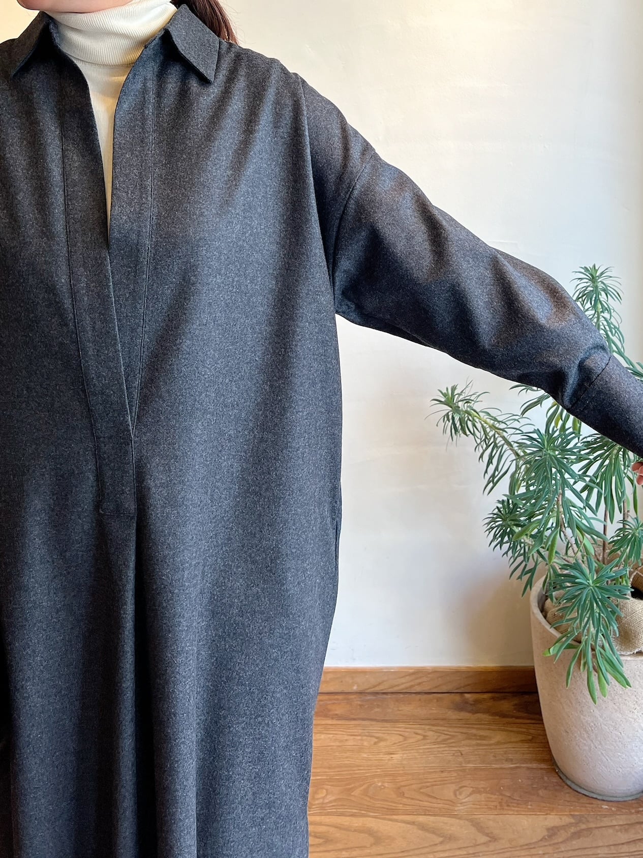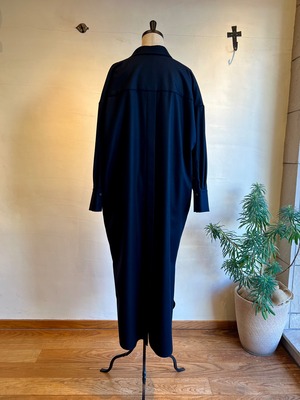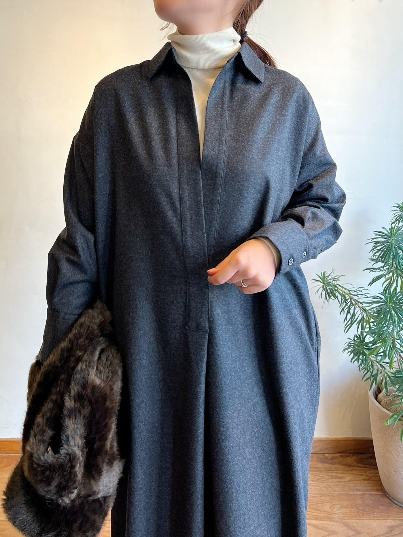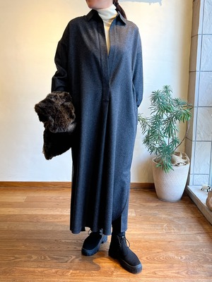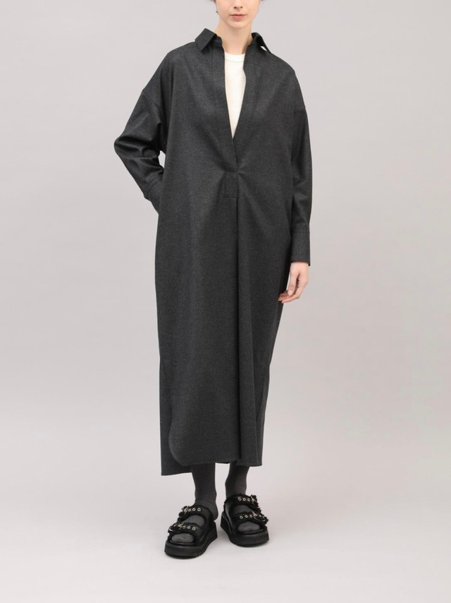 上質なカシミヤ混フラノを使用したシャツワンピース。高密度に織りあげられたフラノは、適度なハリ感があり仕立て映えの良いクラス感のある仕上がりが特徴。フロントの深いスキッパーデザインはインナー次第でカジュアル~きれいめまで様々なレイヤードスタイルをお楽しみいただけます。後ヨーク下の比翼開きデザインもポイント。釦の開け具合で動きのあるバックスタイルに。
