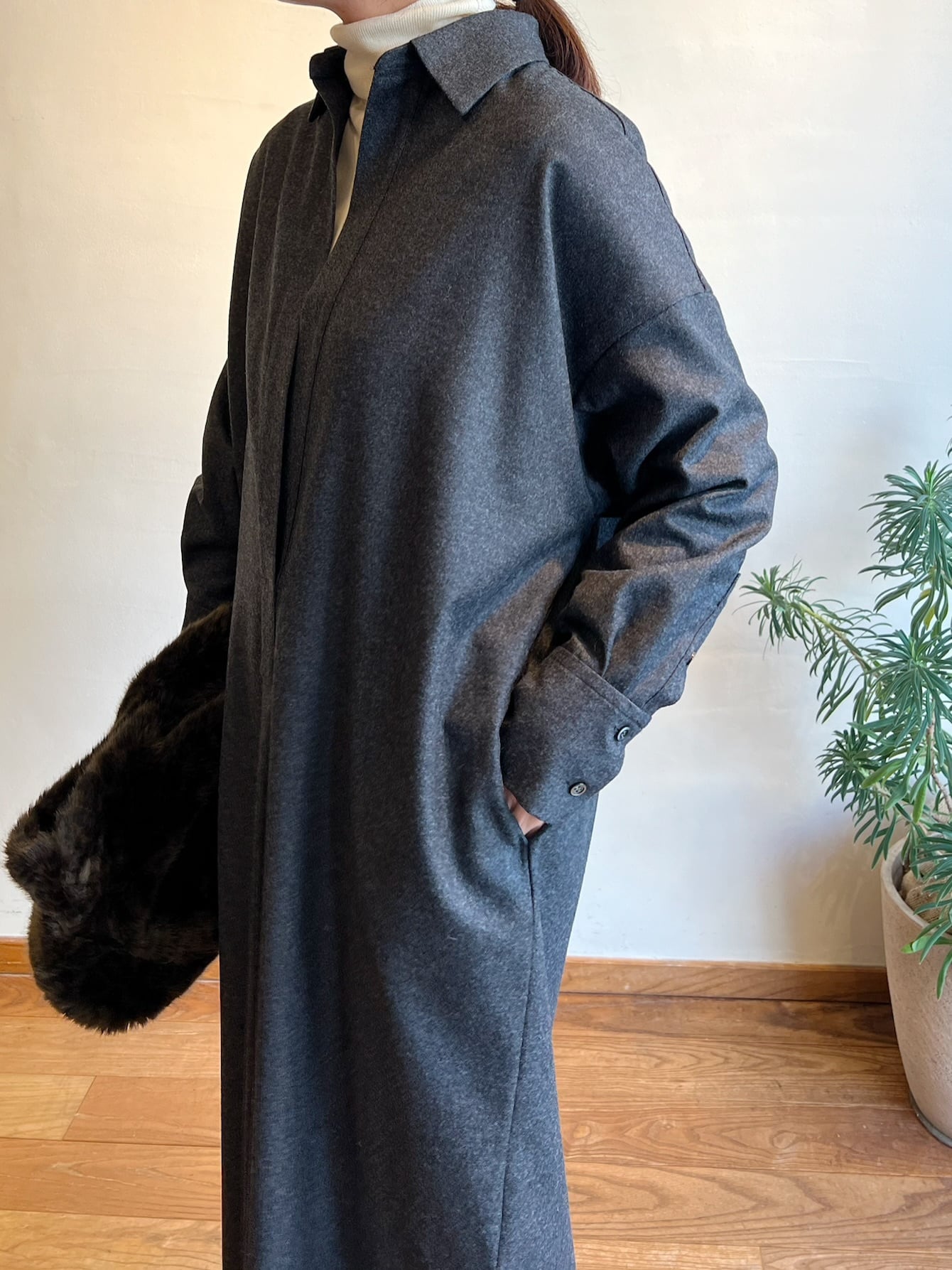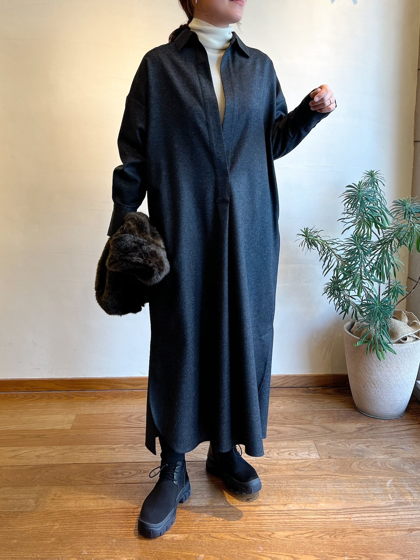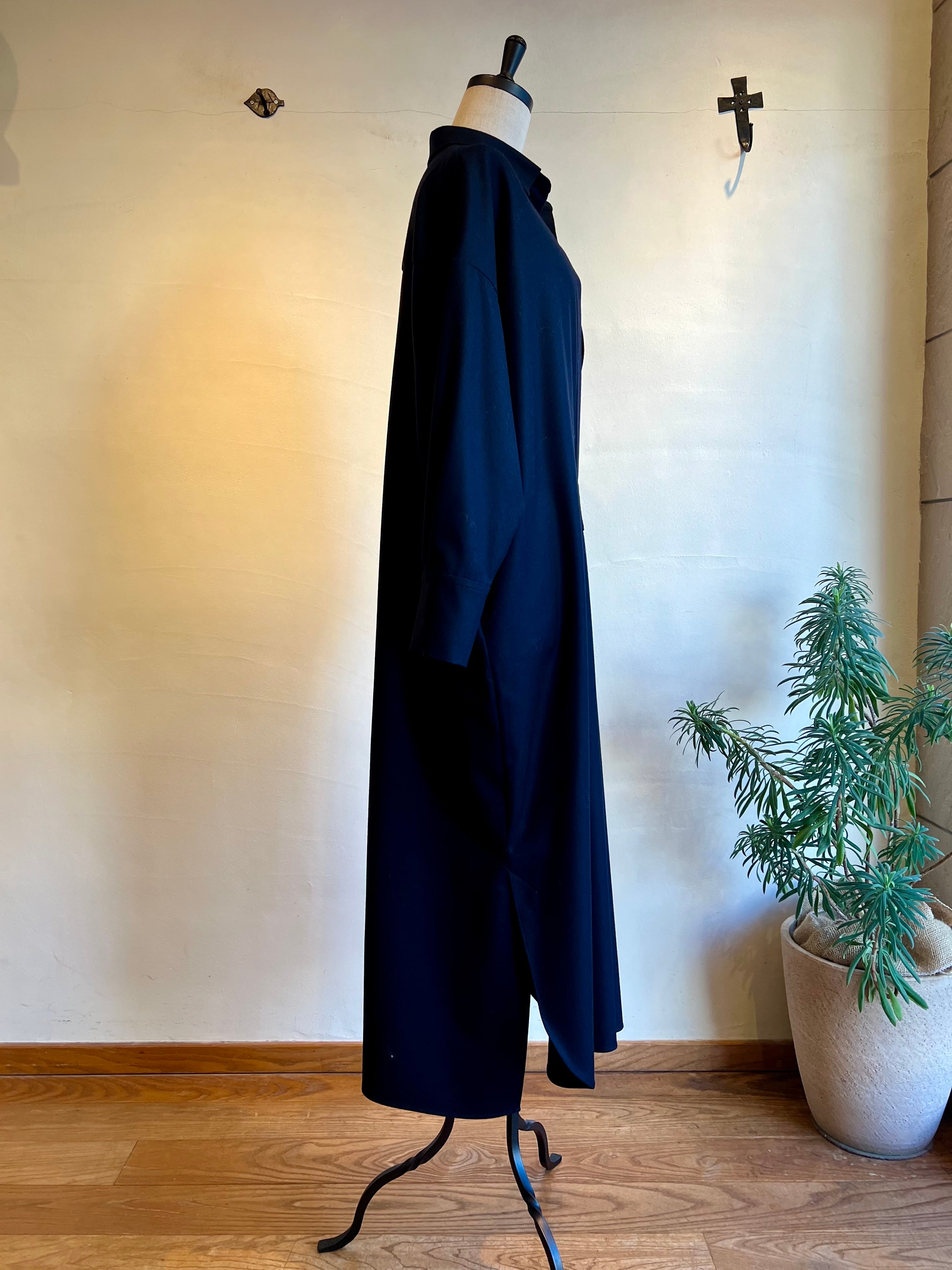 上質なカシミヤ混フラノを使用したシャツワンピース。高密度に織りあげられたフラノは、適度なハリ感があり仕立て映えの良いクラス感のある仕上がりが特徴。フロントの深いスキッパーデザインはインナー次第でカジュアル~きれいめまで様々なレイヤードスタイルをお楽しみいただけます。後ヨーク下の比翼開きデザインもポイント。釦の開け具合で動きのあるバックスタイルに。