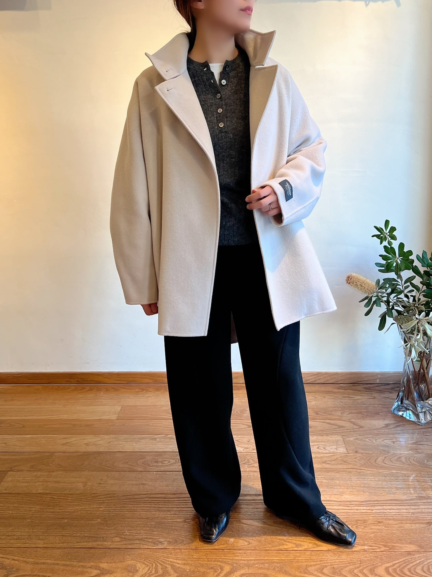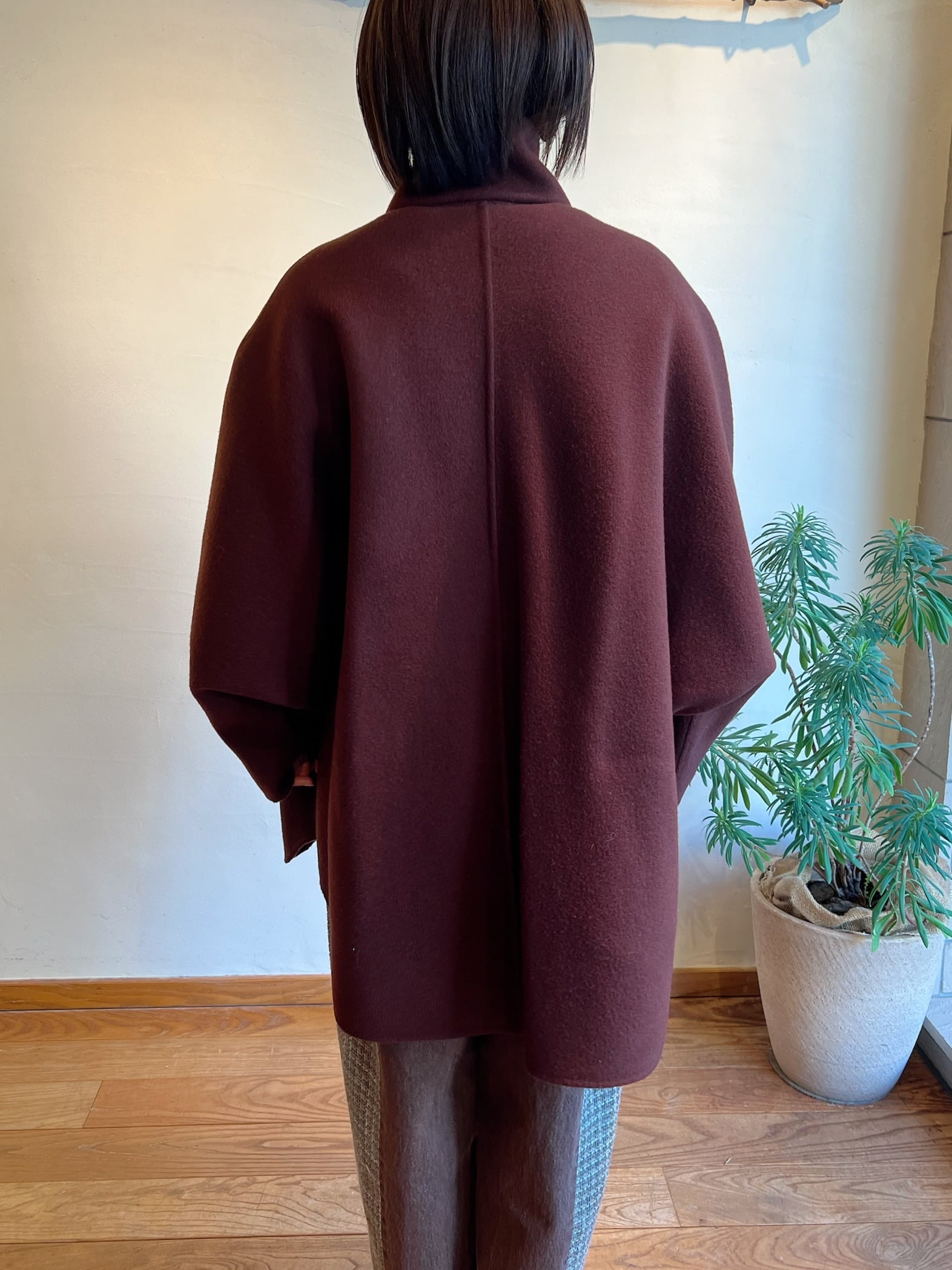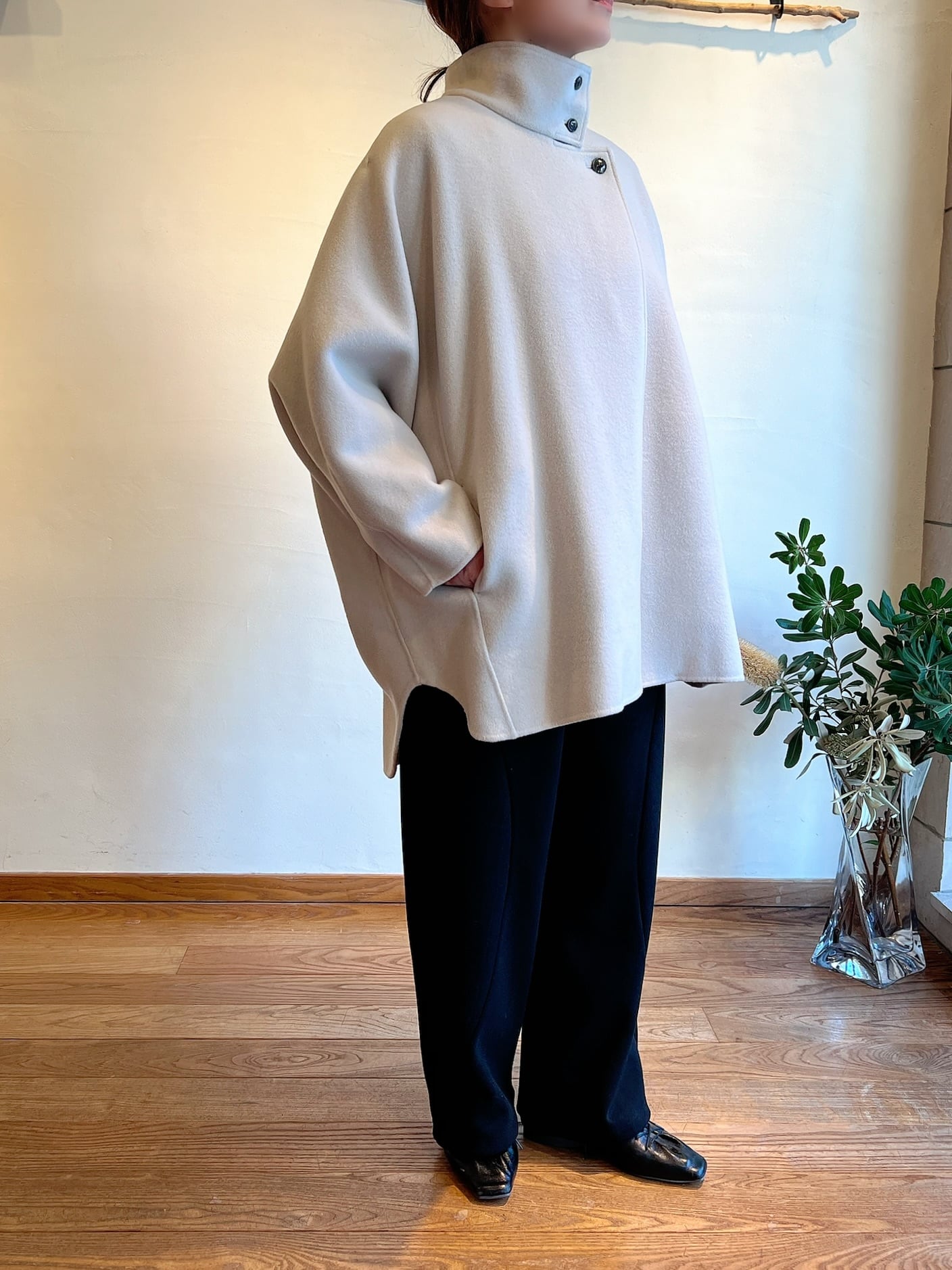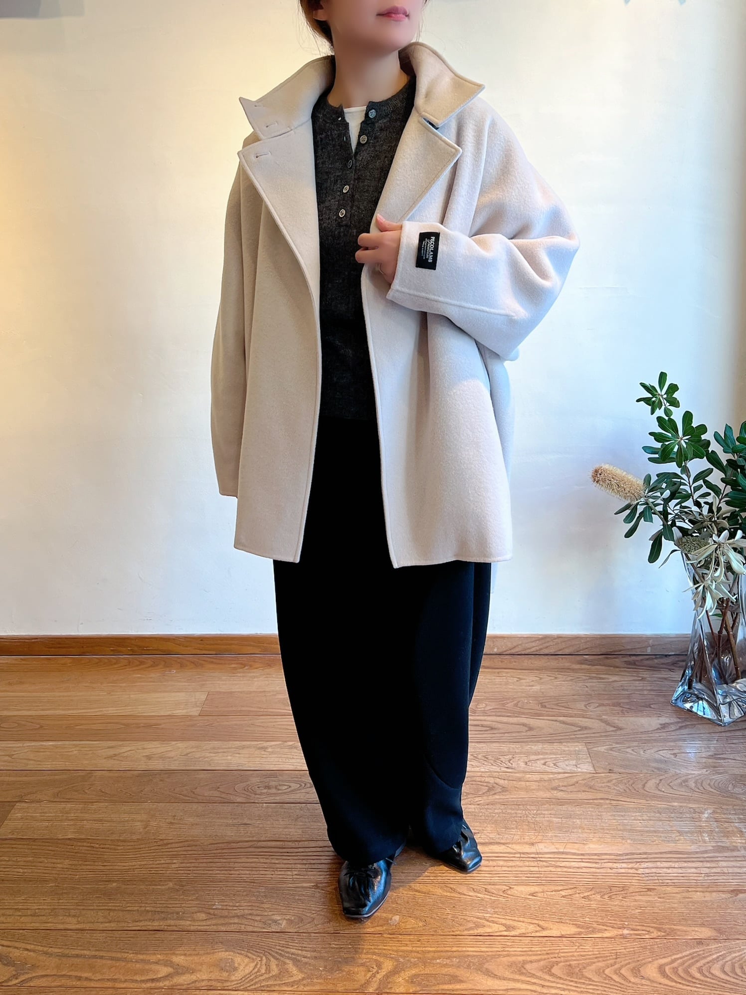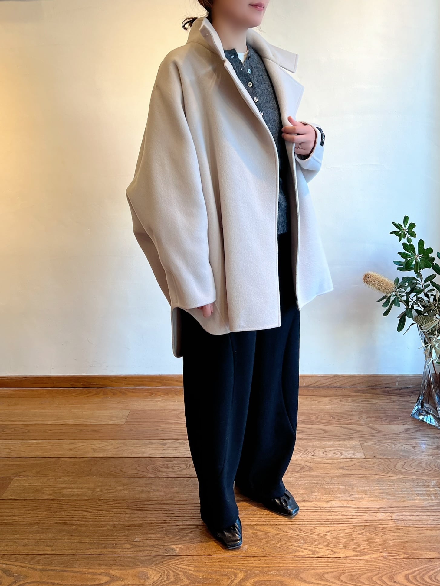 柔らかなウールを使ったダブルフェイスのドルマンコート。 さりげないエレガンスを持ちながら、軽やかでありながら暖かさを実現。リラックスしたシルエットは、どんなスタイルにもフィットし、着こなしの幅を広げてくれます。大きなドルマン袖が特徴で、ゆったりとした着心地が魅力的です。衿元や裾のデザインもポイントになっており、カジュアルなスタイルにもフォーマルなシーンにも活躍します。