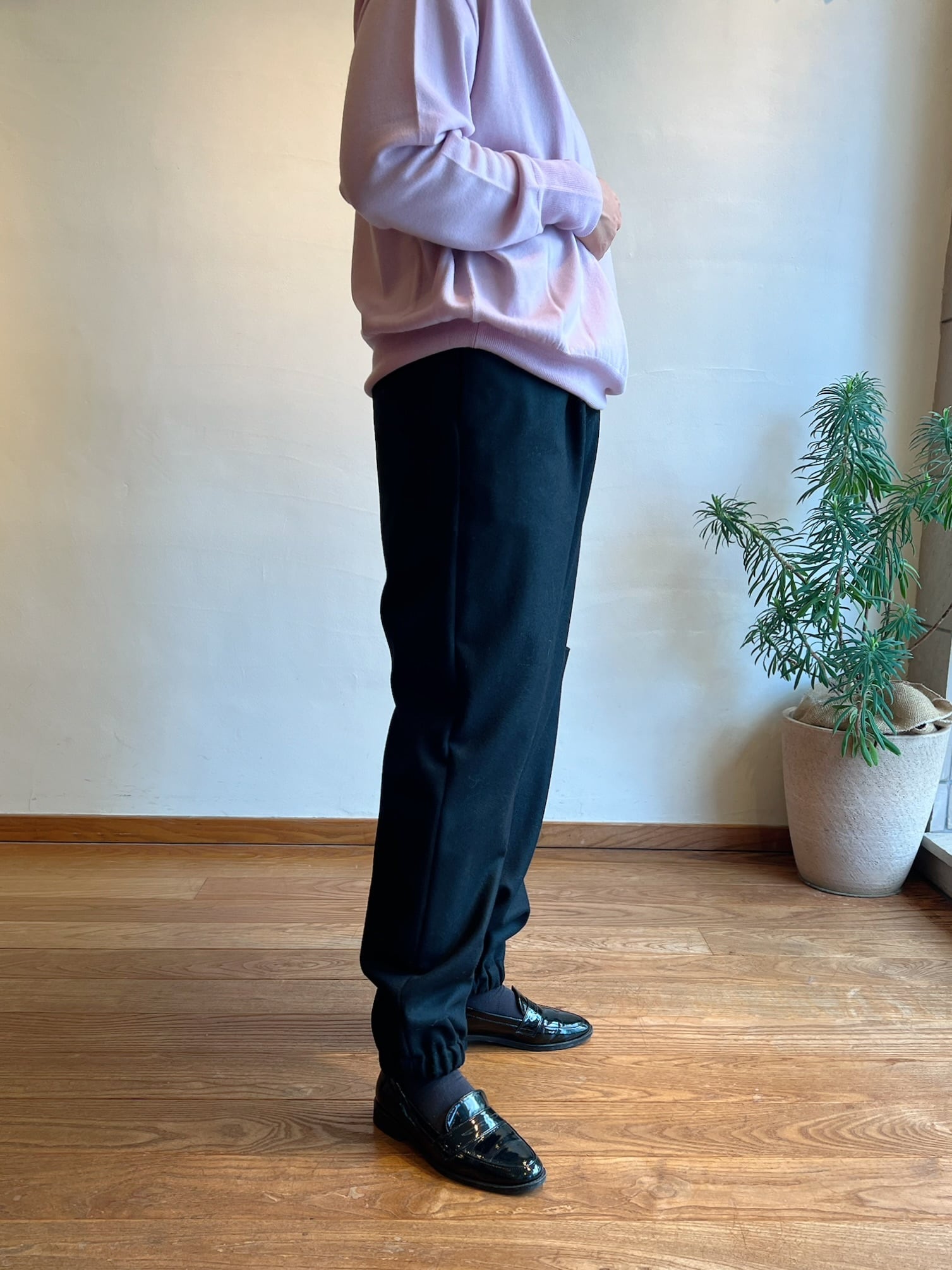 程良い肉感と上質な風合いをもち表情豊かな素材感が特徴のフラノ素材を使用したパンツ。ジョガーパンツシルエットを上質な布帛で仕立てたシックで大人な雰囲気が魅力。ウエストはドローストリングとゴム仕様でリラックス感がありながら前開きのトラウザー仕様でカジュアル過ぎないクラス感がポイント。裾ゴム仕様で足元をたるませたシルエットが決まりやすい点も◎。ゆとりのあるヒップ周りから裾にかけてテーパードしたシルエットはどんなトップスとも好相性な一着です。