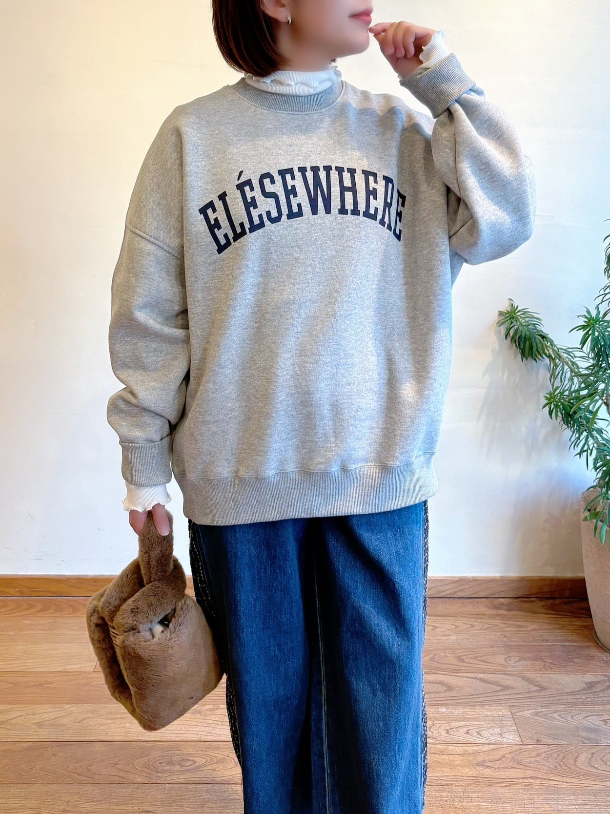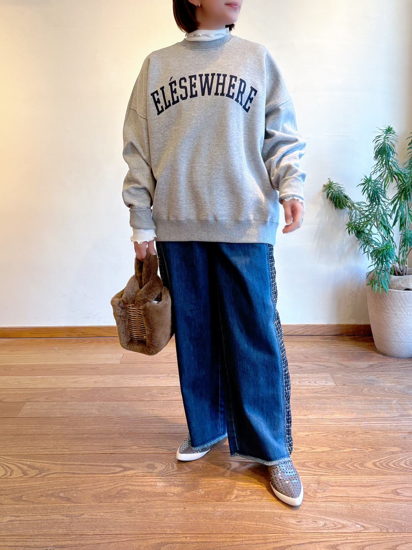 柔らかく肌あたりの良い裏起毛を使用したオーバーサイズのスウェット 。程よくゆるさのあるシルエットは抜け感が出て、メンズライクな印象が強いカレッジロゴも大人の女性が着こなしやすいバランスに仕上がりました。前はドロップショルダー・後ろがラグランスリーブで前後で違うディテールもポイント。とても柔らかく、着心地抜群です。ロゴの「ELESEWHERE」は、NYブルックリンにある倉庫を改装してできた人気クラブ名。アクセントをつけてMICA&DEALらしさをプラスしたロゴです。