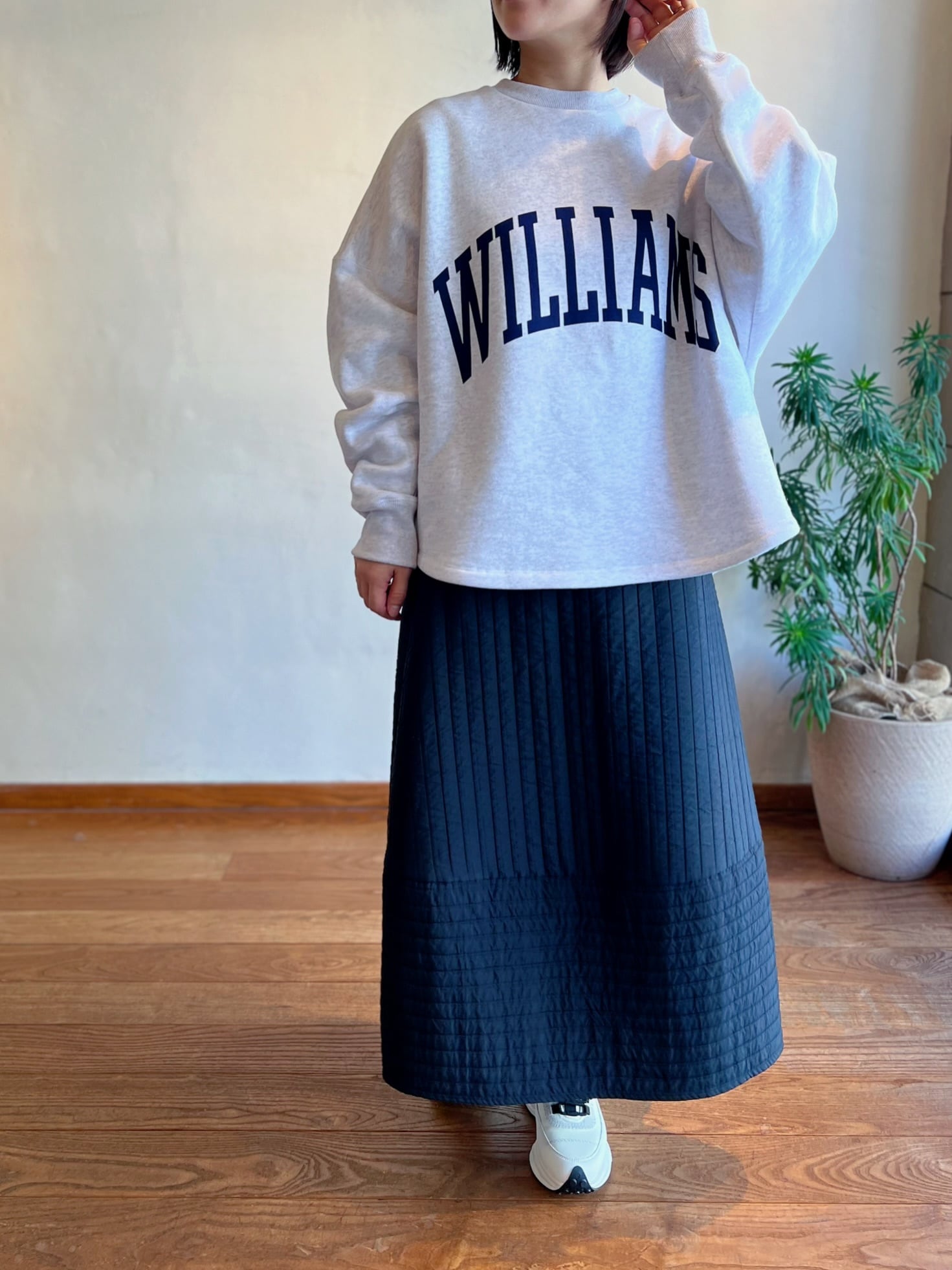 胸元に大きく入ったロゴデザインが目を惹く裏起毛スウェット。ロゴが大きくデザインされており、着ると縦長効果のアクセントになります。後ろ襟ぐりには、アクセントにガゼットがついてデザインポイントになっています。WILLIAMS=ブルックリンの「WILLIAMSBURG」という地名からとっています。