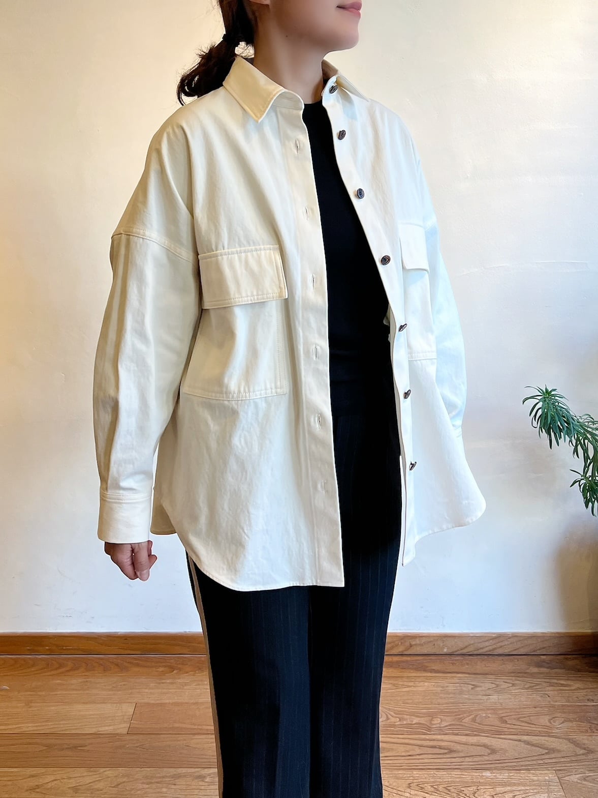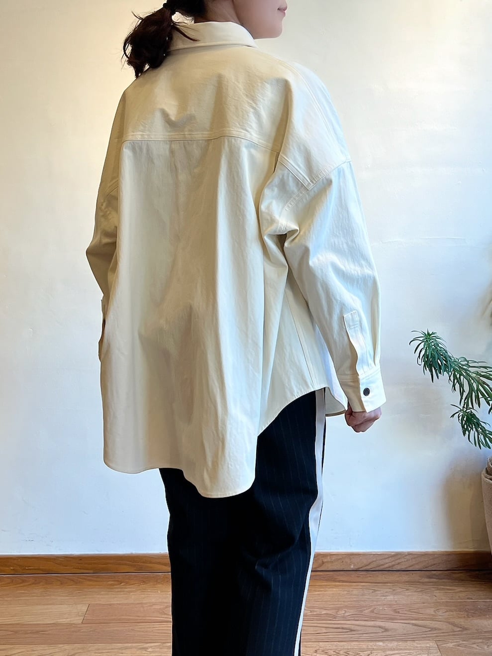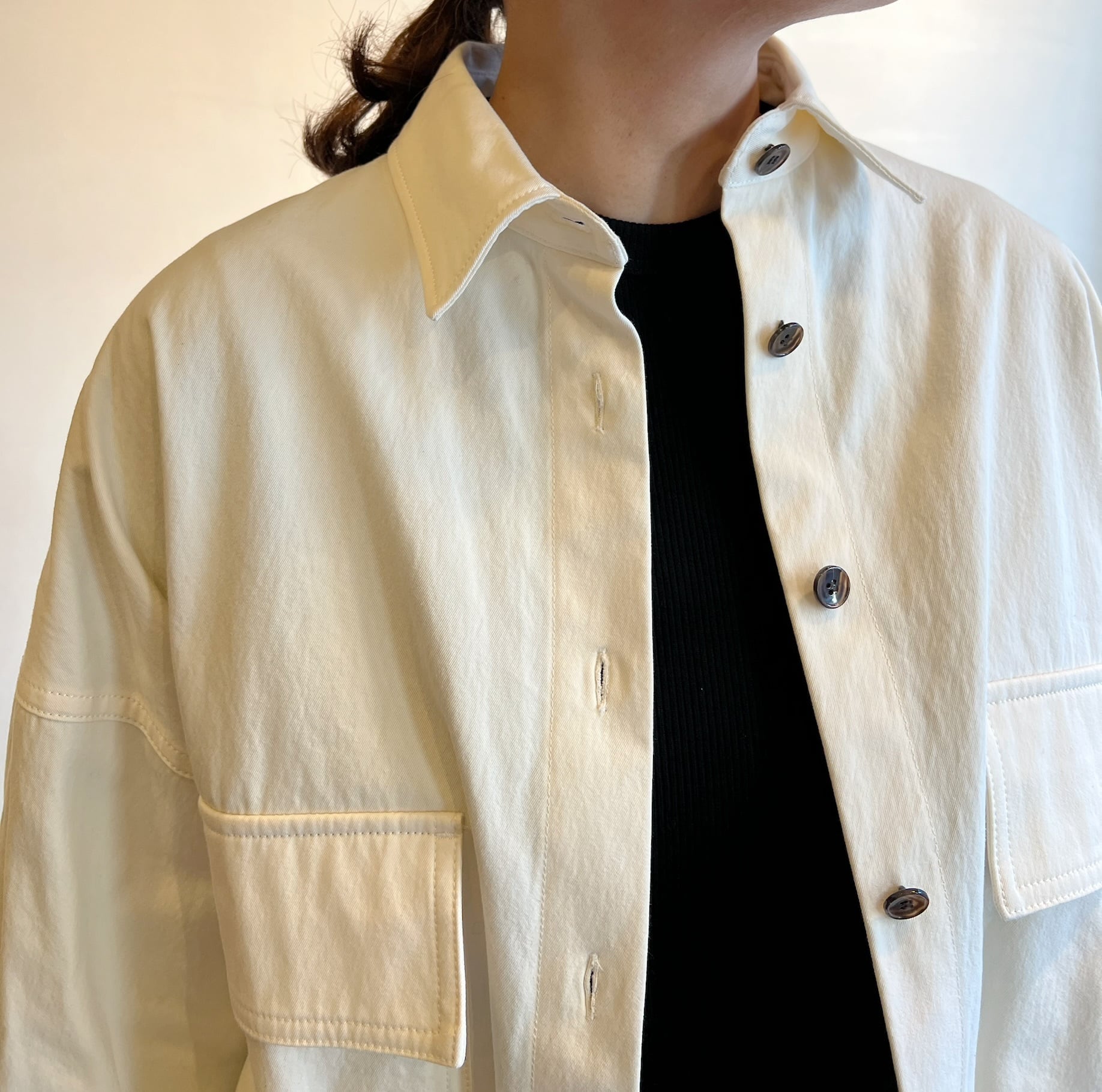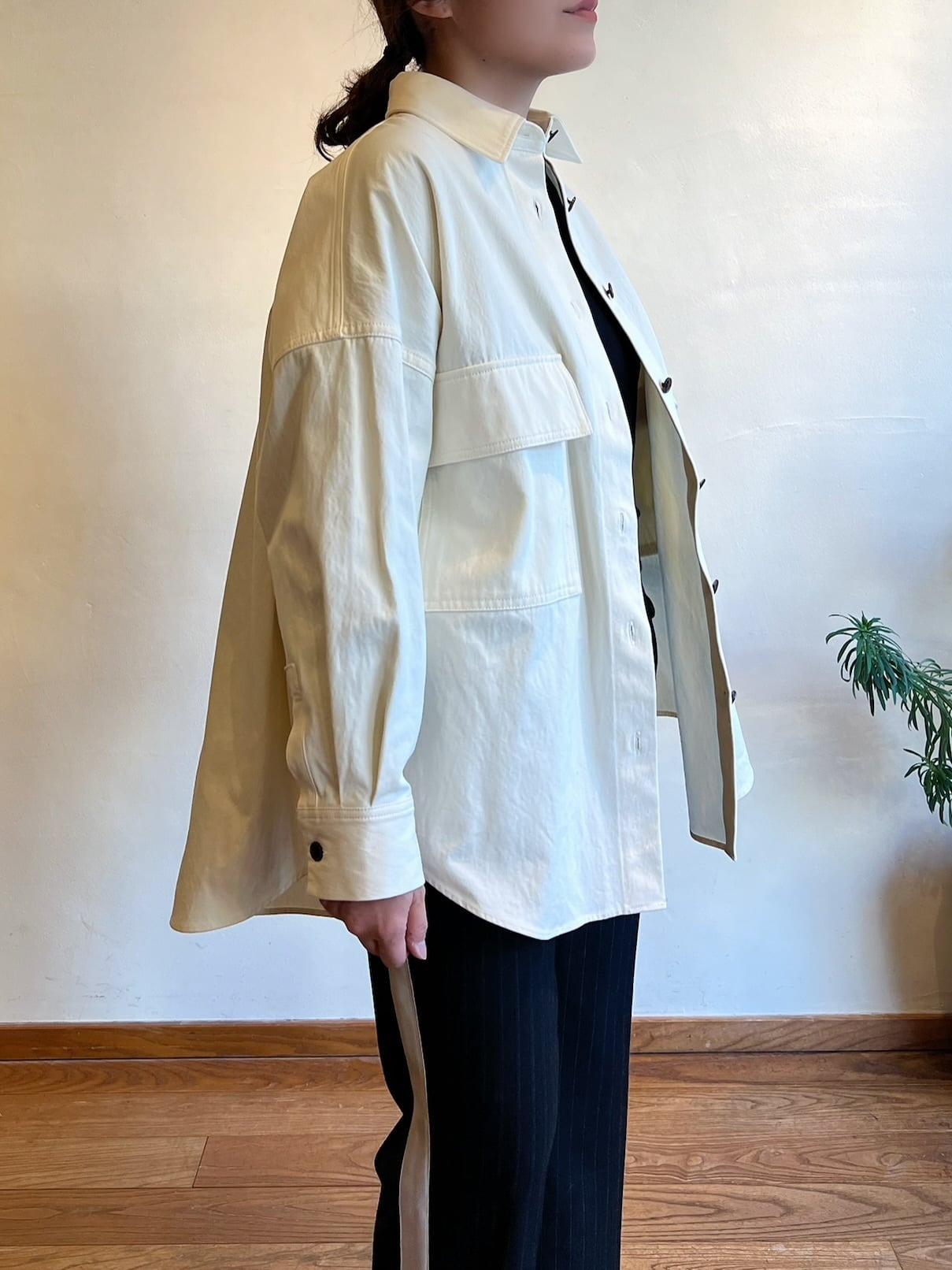 ハリのある素材感を活かしたオーバーシルエットが大人なこなれ感を演出してくれます。軽いアウター感覚のシャツジャケットは羽織りとして長く活躍する一着です。