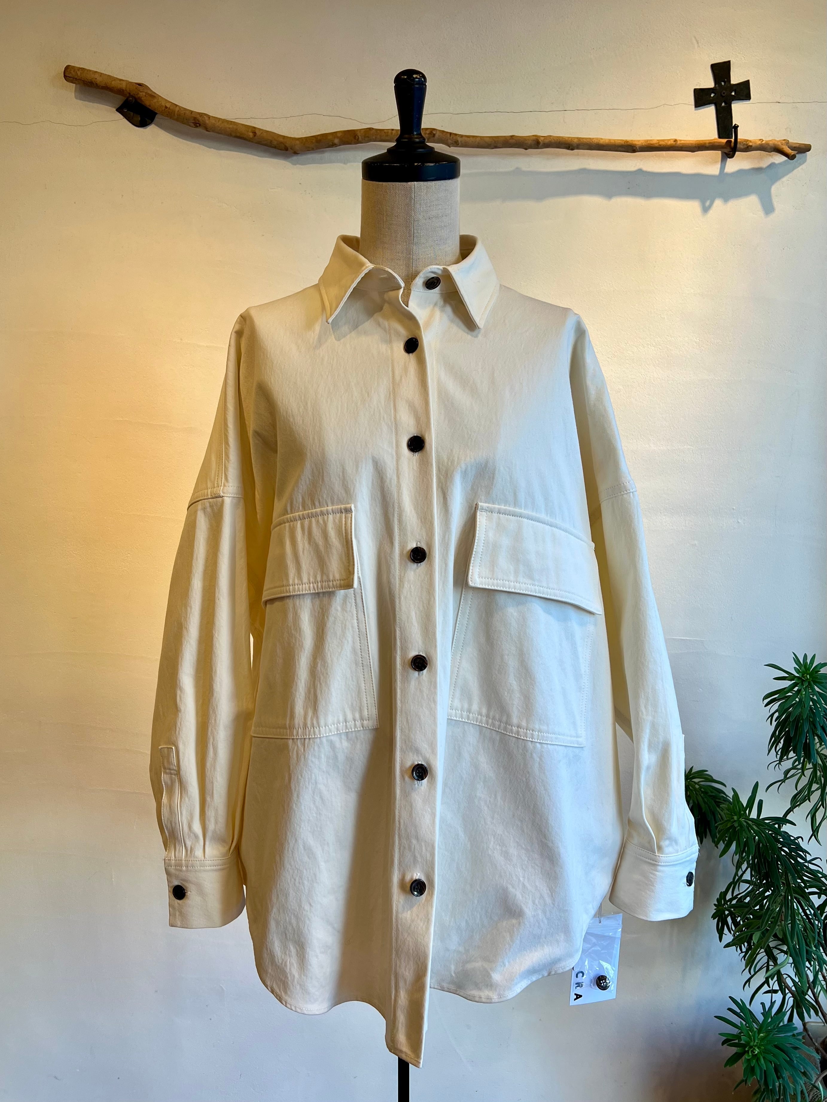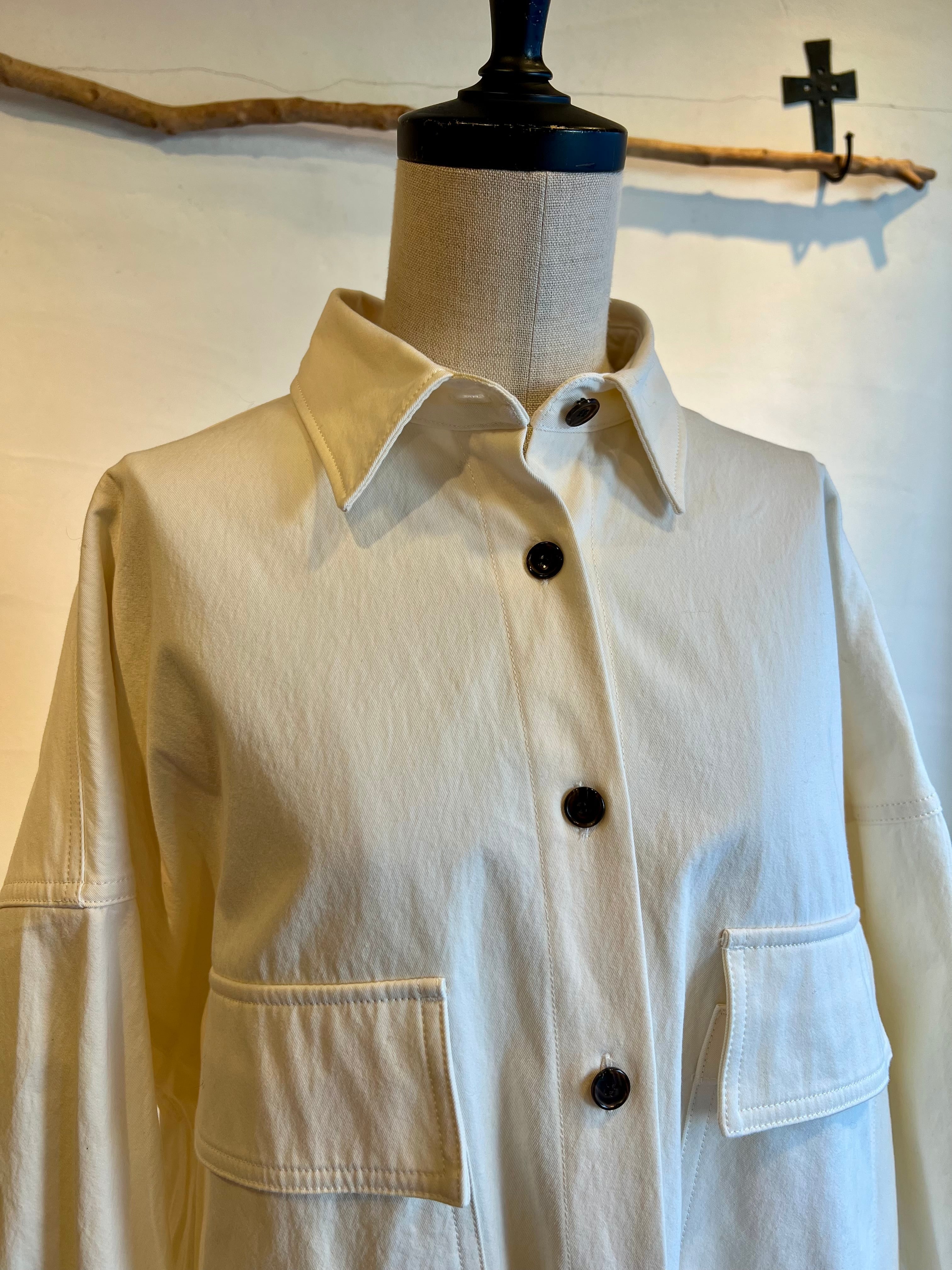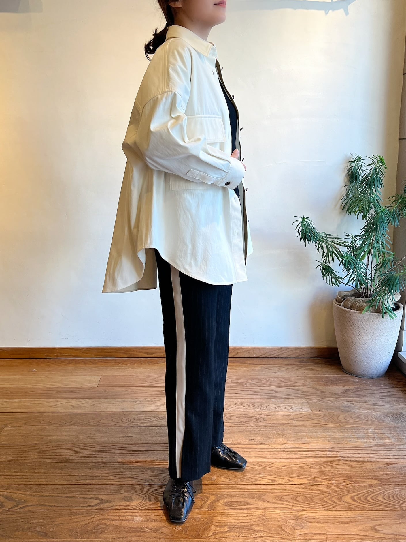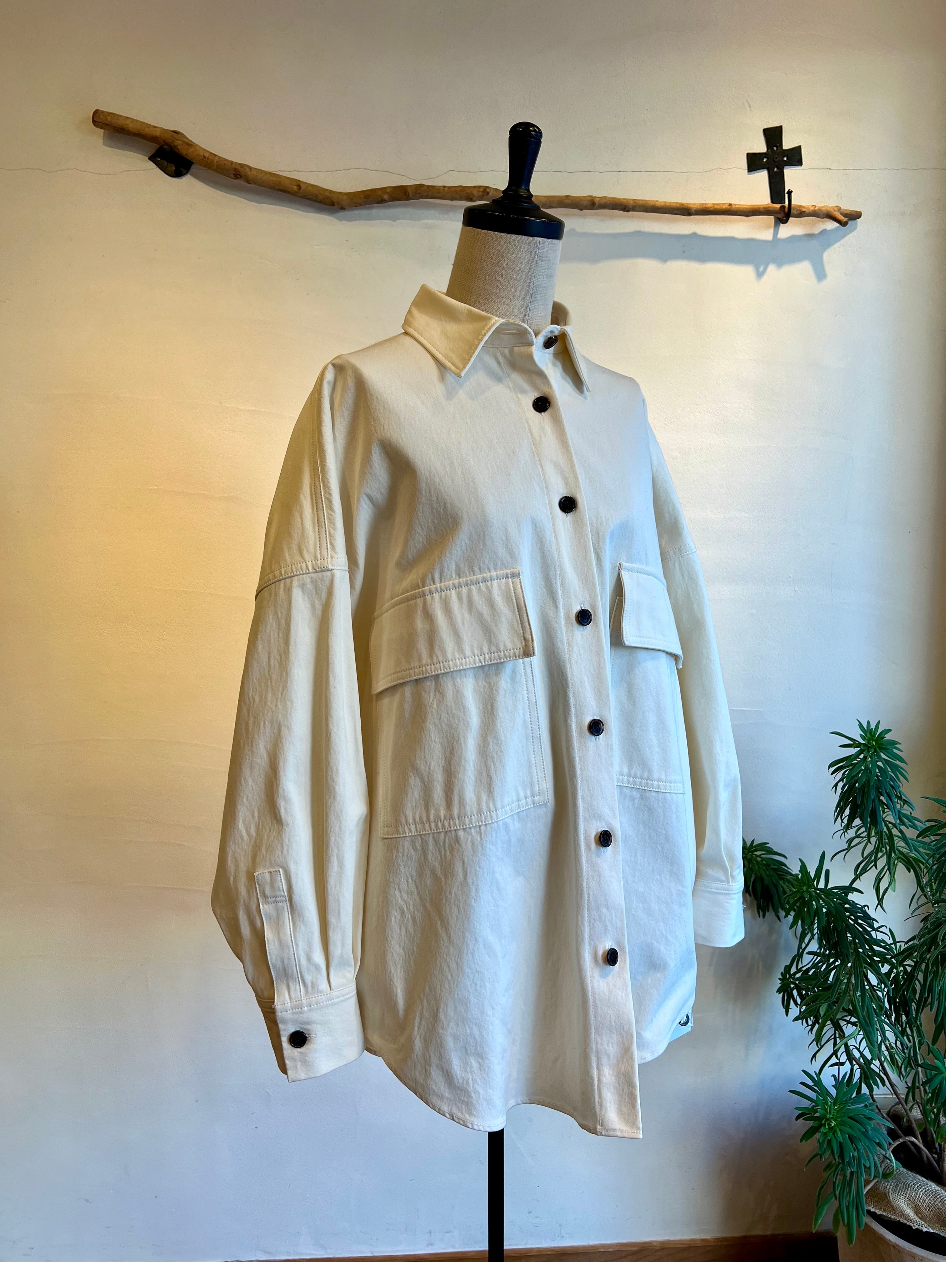 ハリのある素材感を活かしたオーバーシルエットが大人なこなれ感を演出してくれます。軽いアウター感覚のシャツジャケットは羽織りとして長く活躍する一着です。
