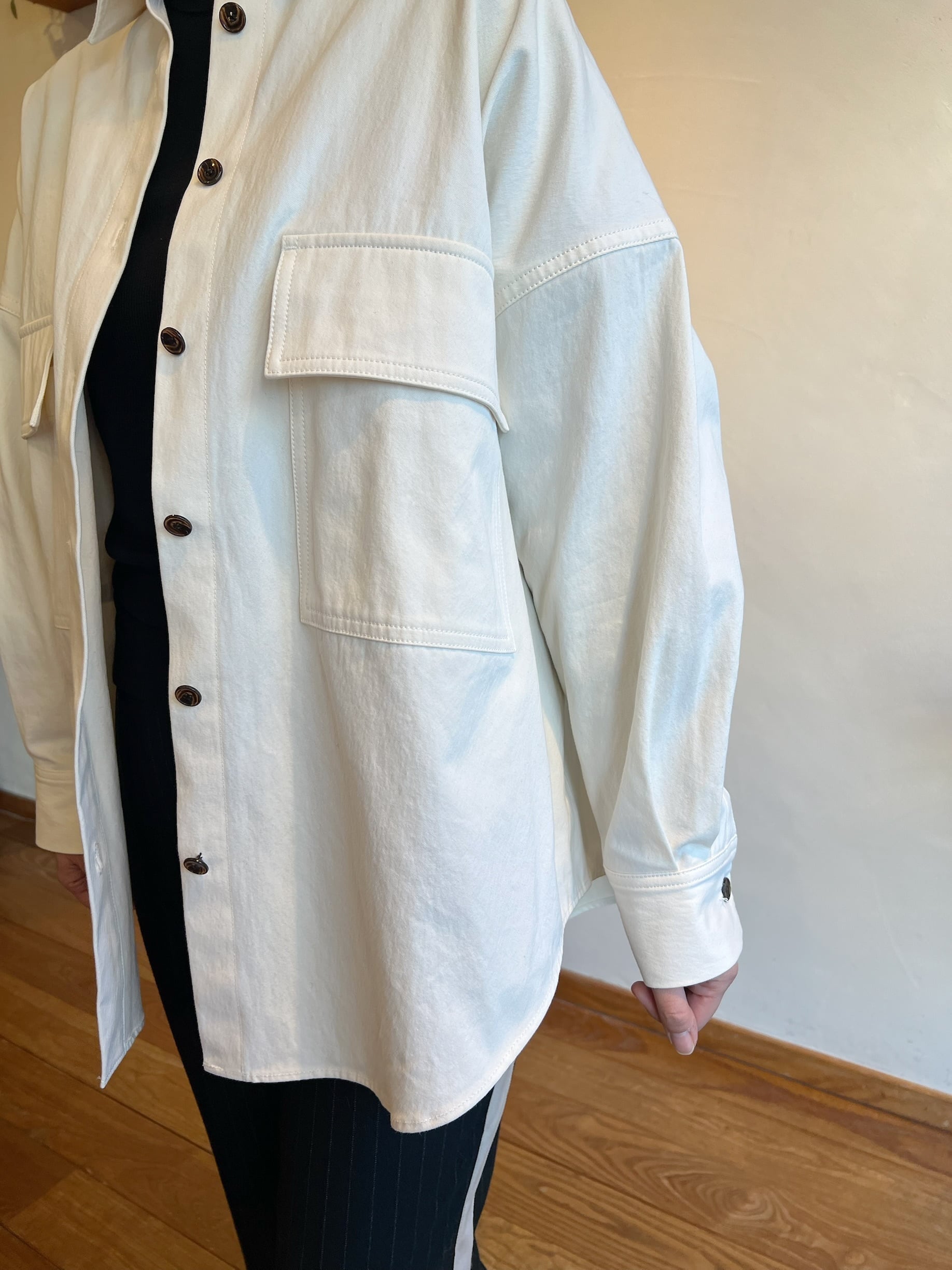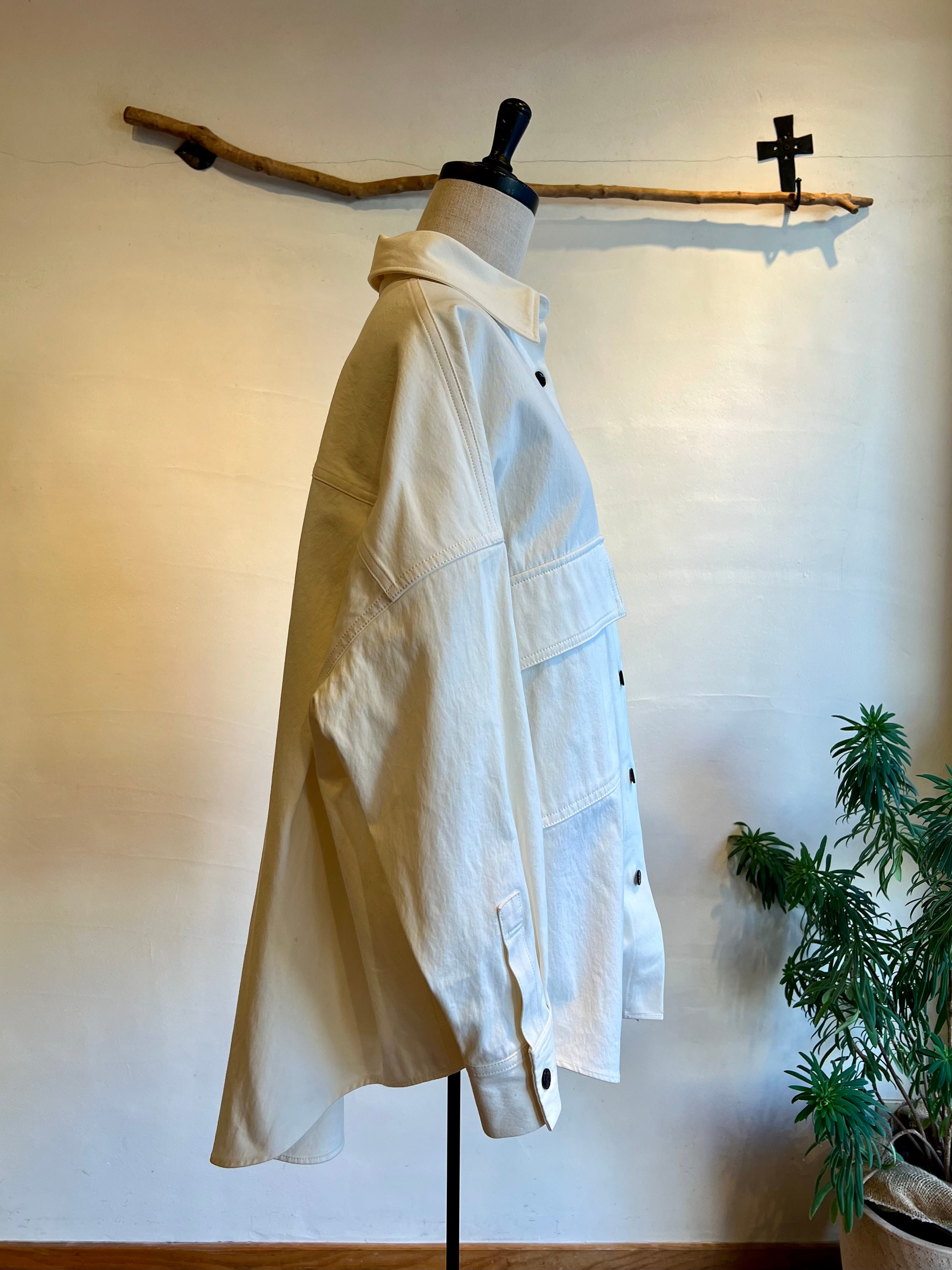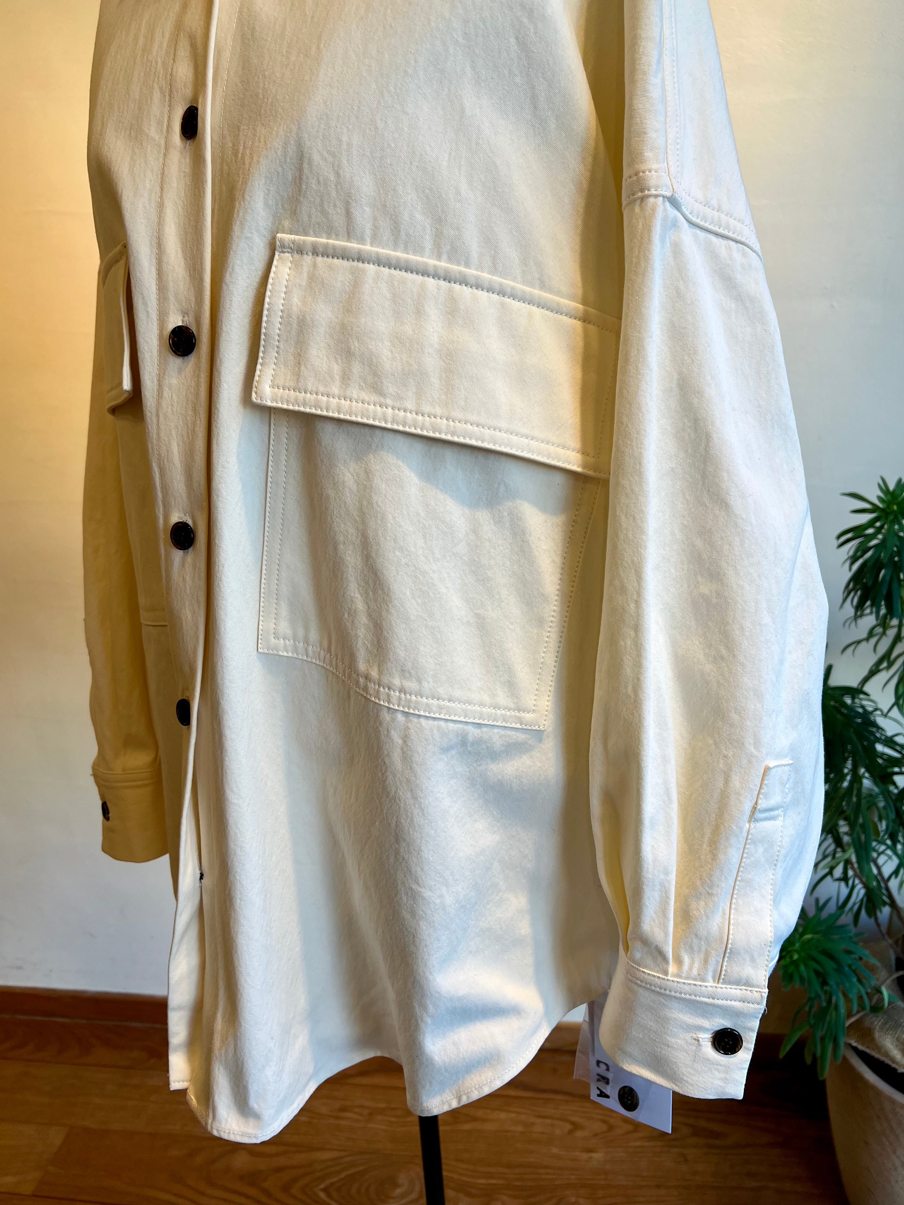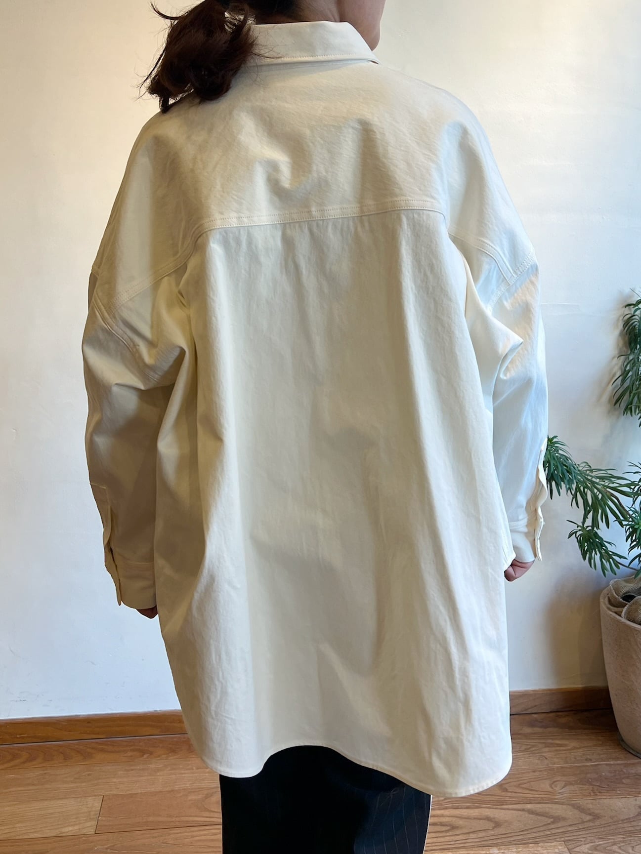 ハリのある素材感を活かしたオーバーシルエットが大人なこなれ感を演出してくれます。軽いアウター感覚のシャツジャケットは羽織りとして長く活躍する一着です。