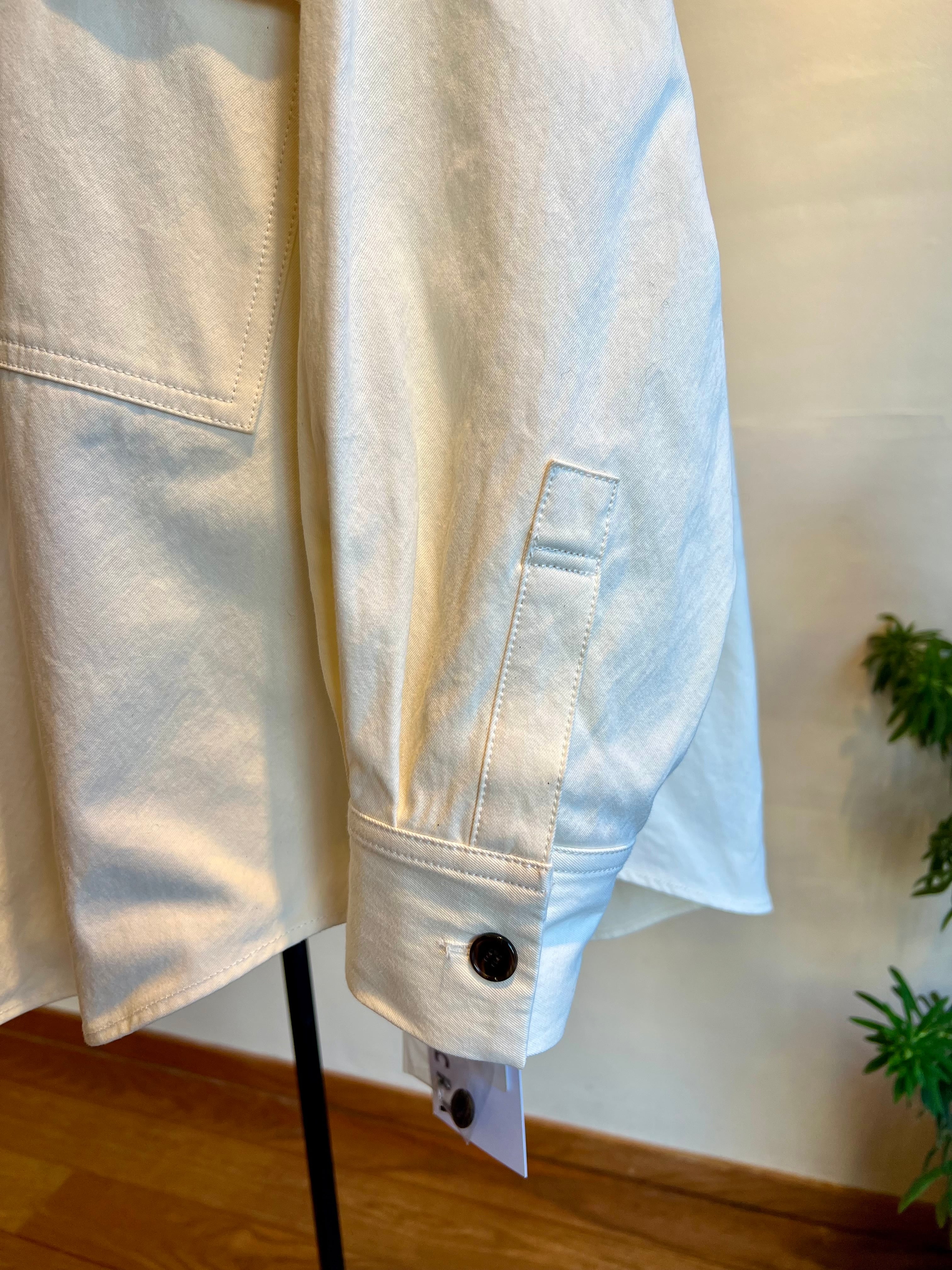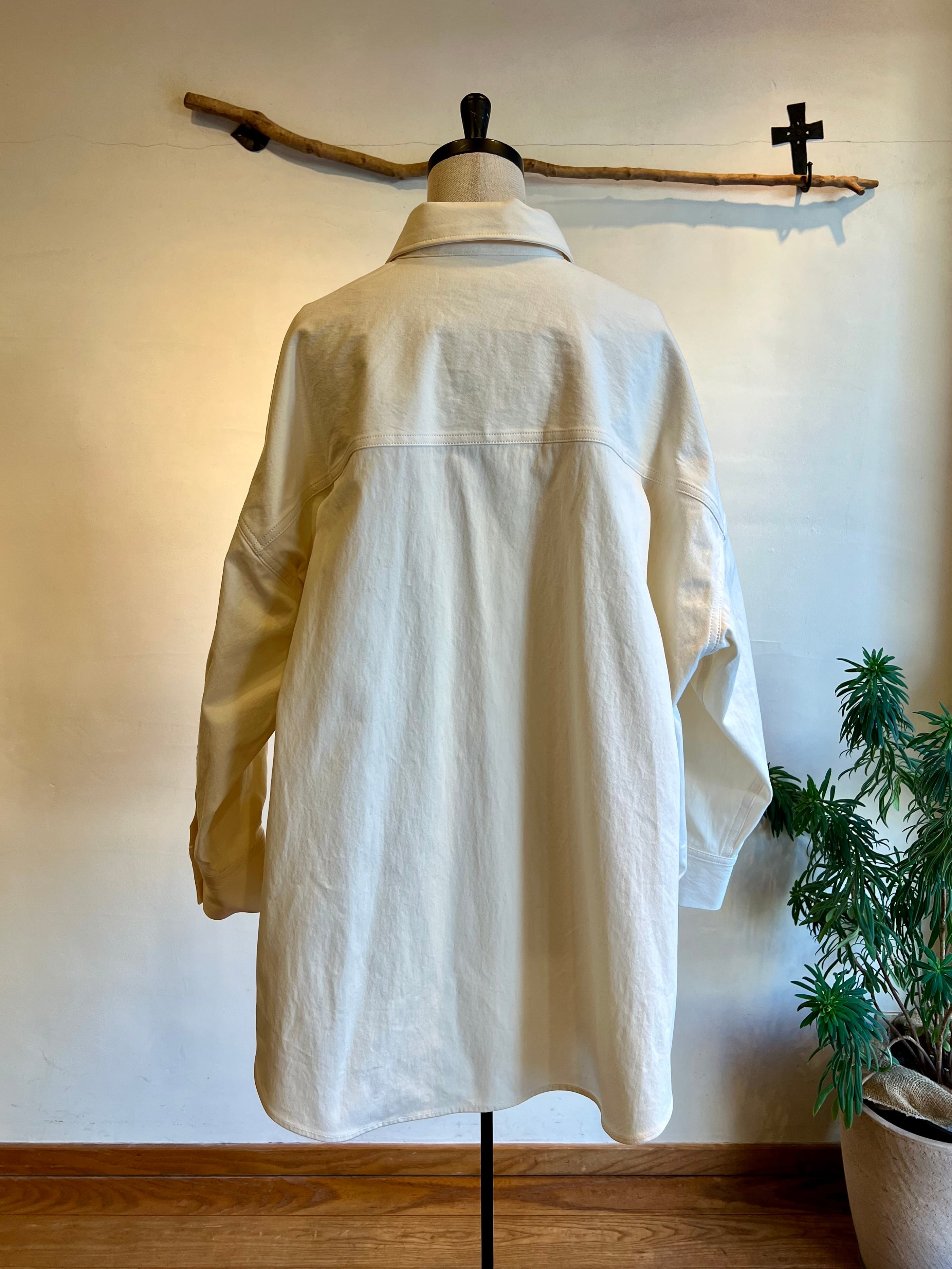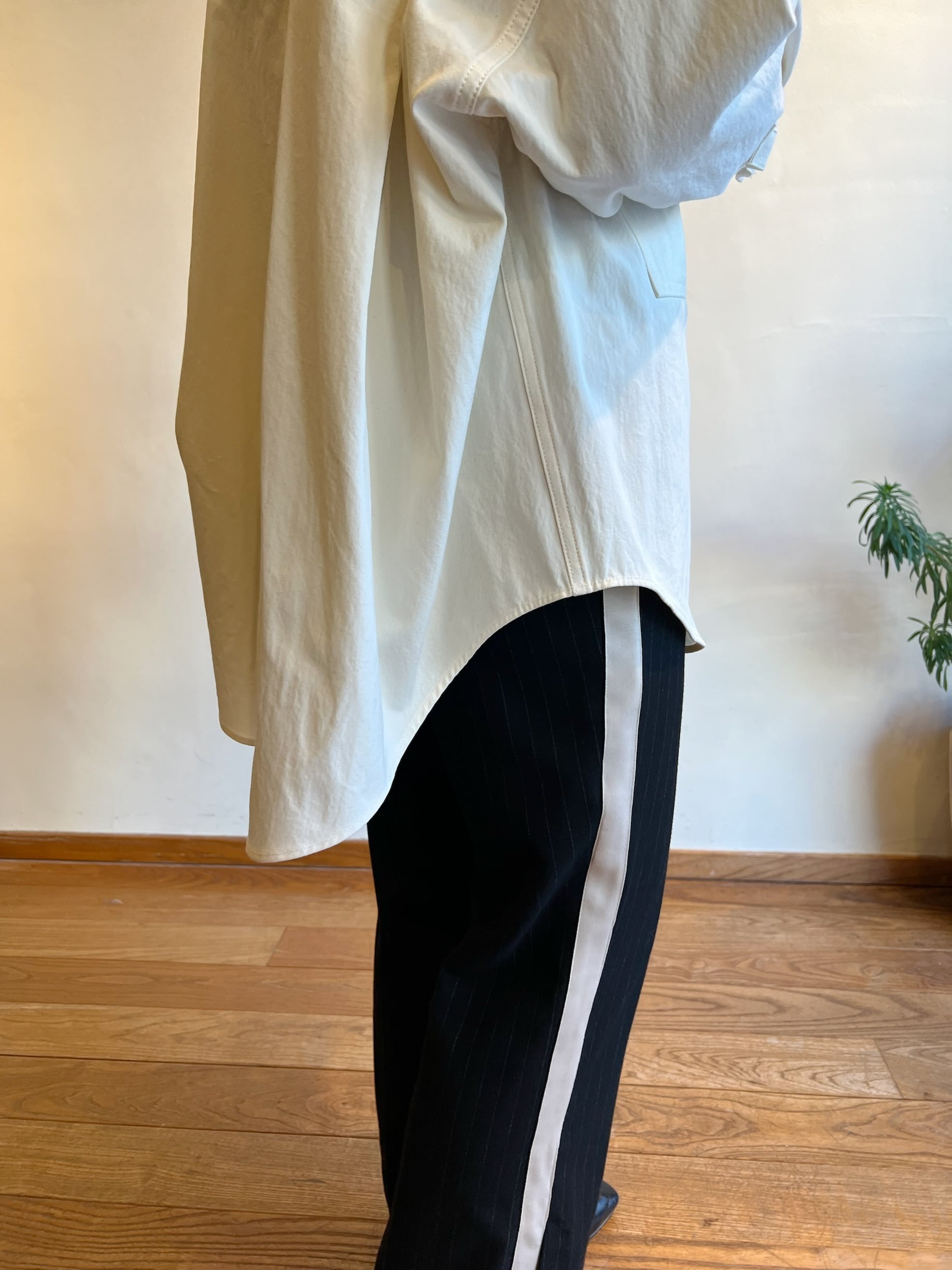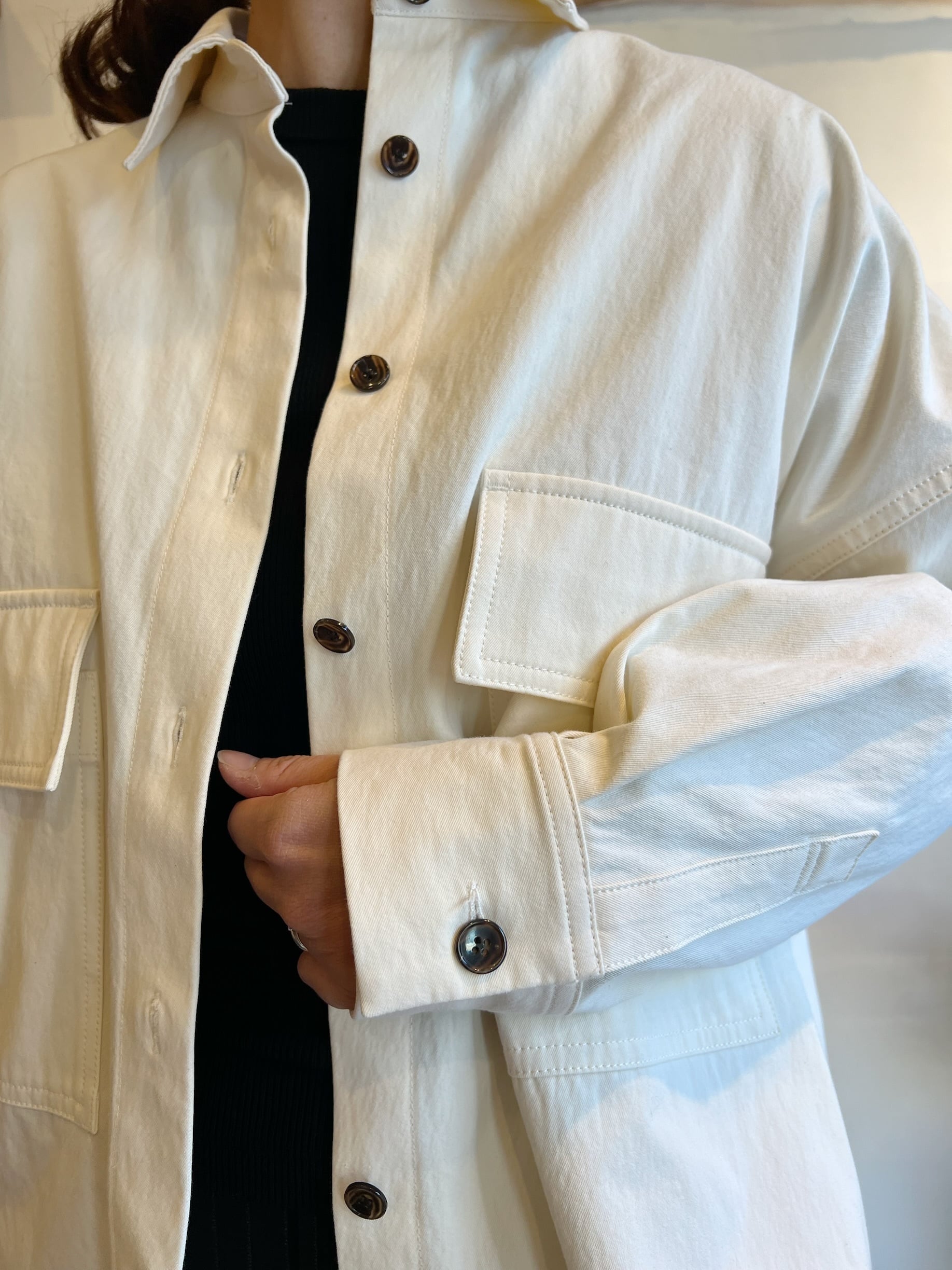 ハリのある素材感を活かしたオーバーシルエットが大人なこなれ感を演出してくれます。軽いアウター感覚のシャツジャケットは羽織りとして長く活躍する一着です。