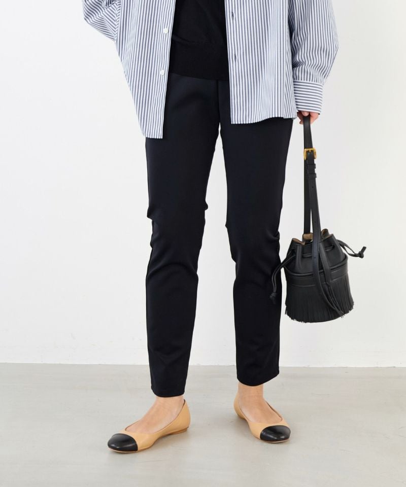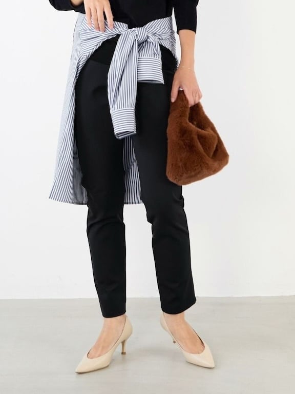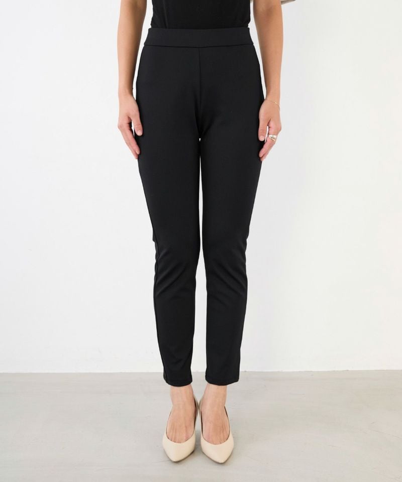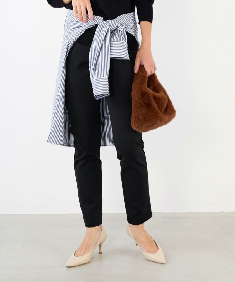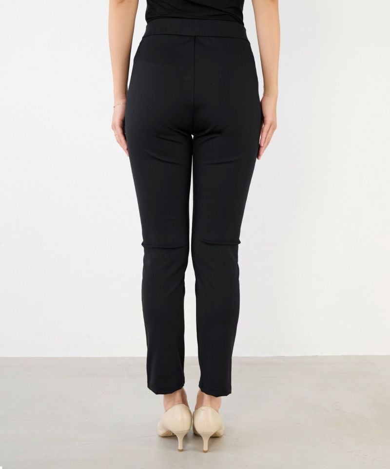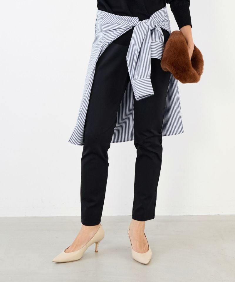 着回し力抜群のスリムシルエットパンツ!スキニーとレギンスの中間のような感覚で着用できるスッキリとしたシルエットのパンツです。伸縮性が高くウエストもゴム使用なのでストレスフリーにご着用できます。また、シワにもなりにくいので旅行なのどに持っていくのにも重宝します。チュニックワンピースの下に着たり、スッキリとしたシルエットなのでブーツインしてスタリングを楽しめます。裏起毛で真冬の着こなしにオススメです。