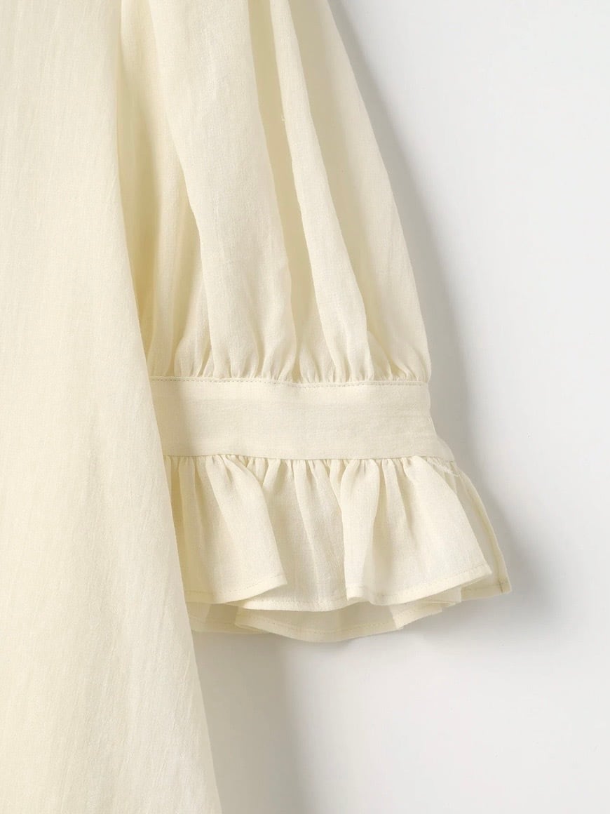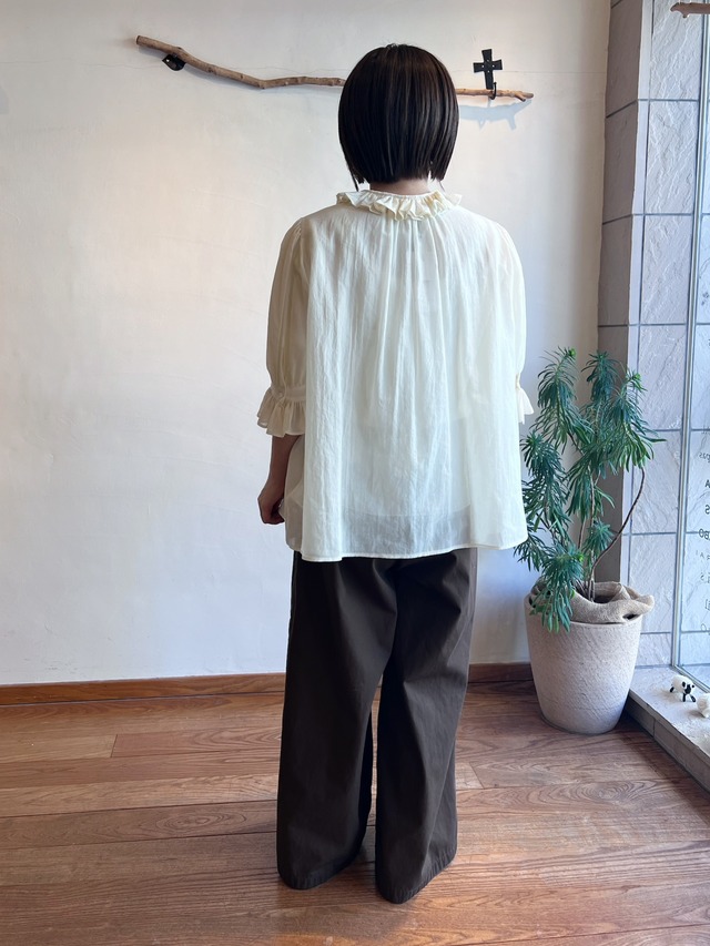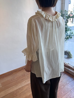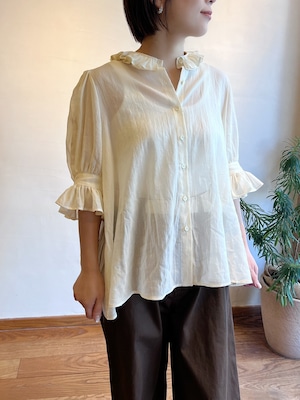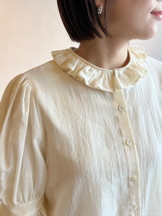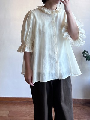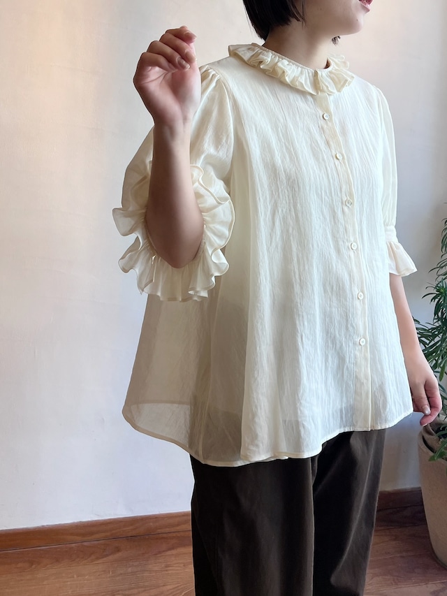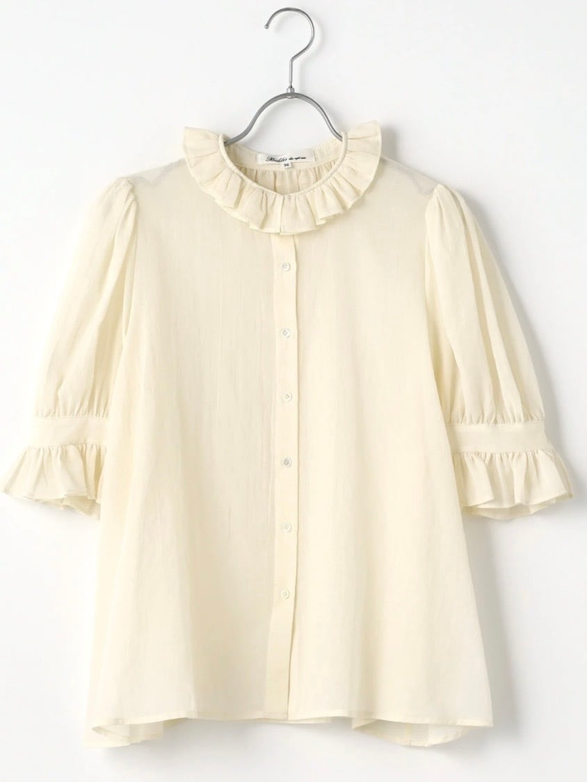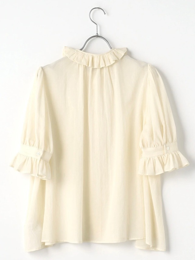 特徴のフリル襟の印象は継続して襟の収まりが良いように端にステッチを入れました。半袖のカフスにもフリルが入っていて大人っぽい可愛らしさも表現しました。暖かい季節には1枚で、肌寒い時にはカーディガンなどに合わせてお楽しみください。