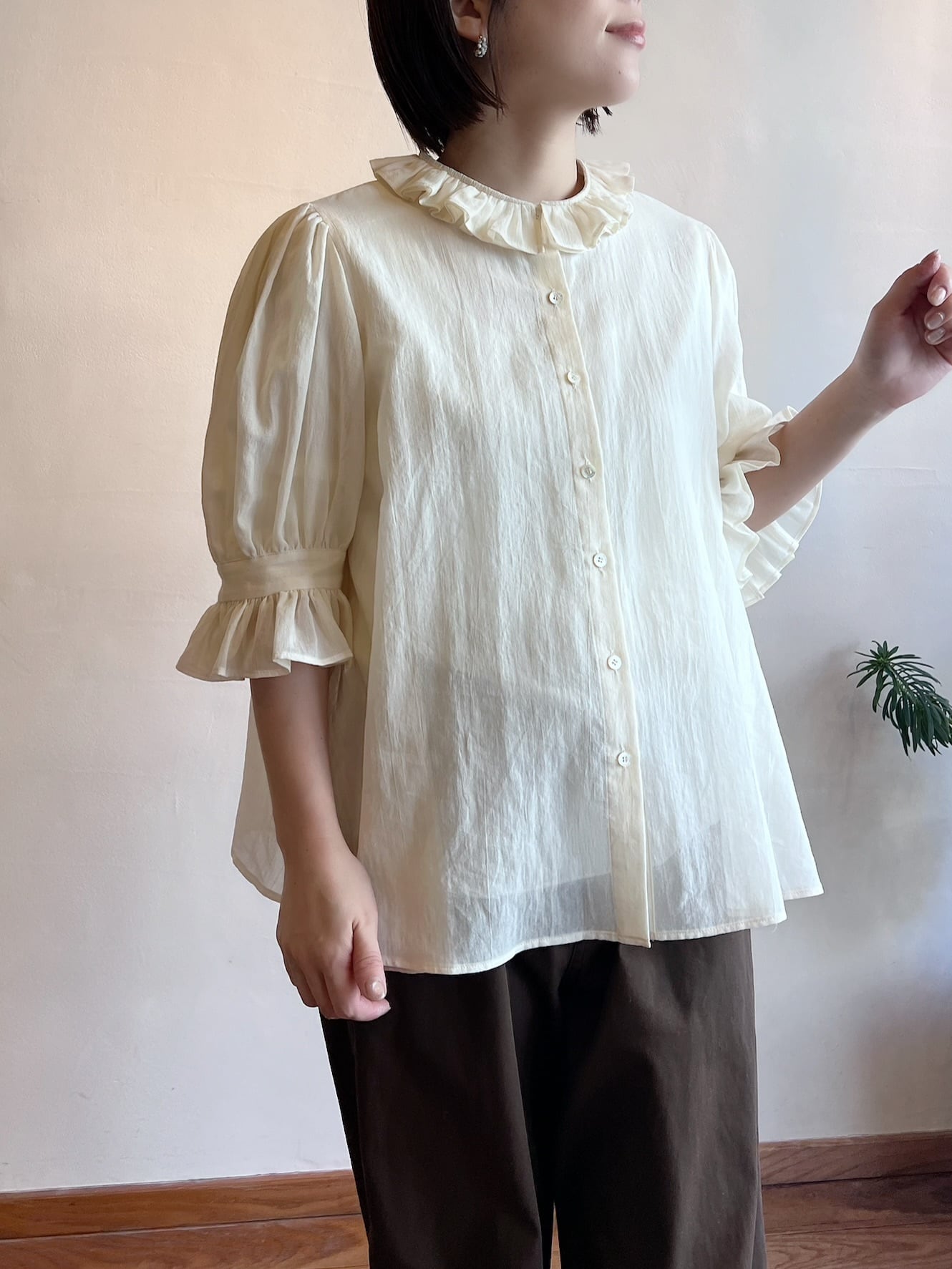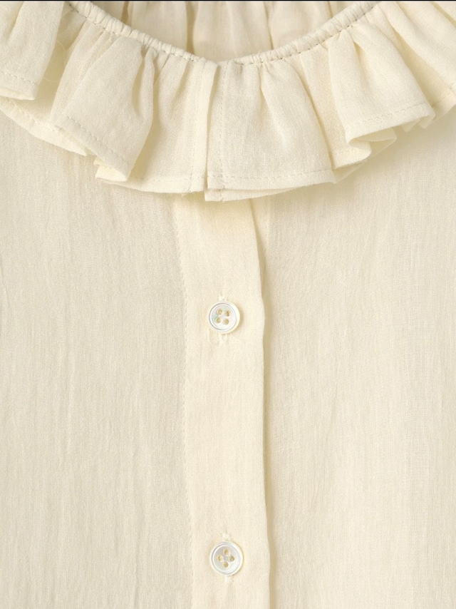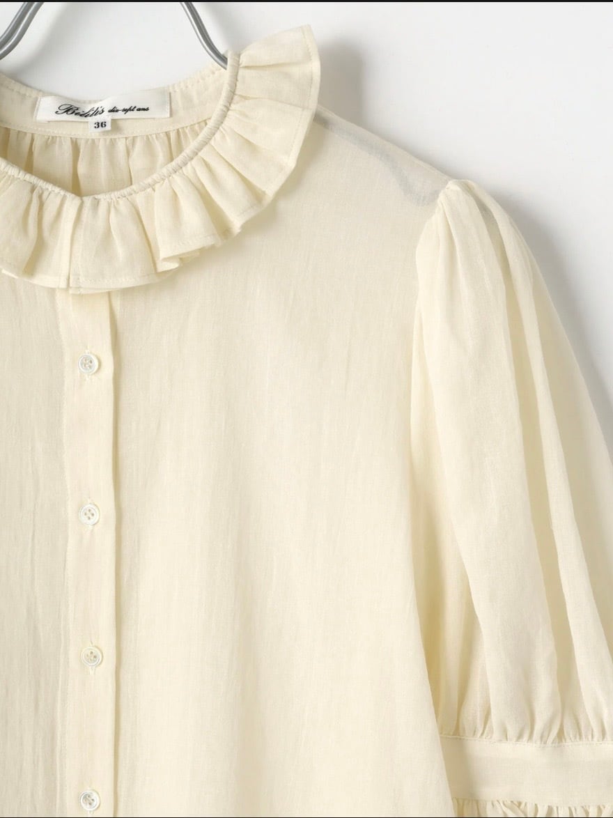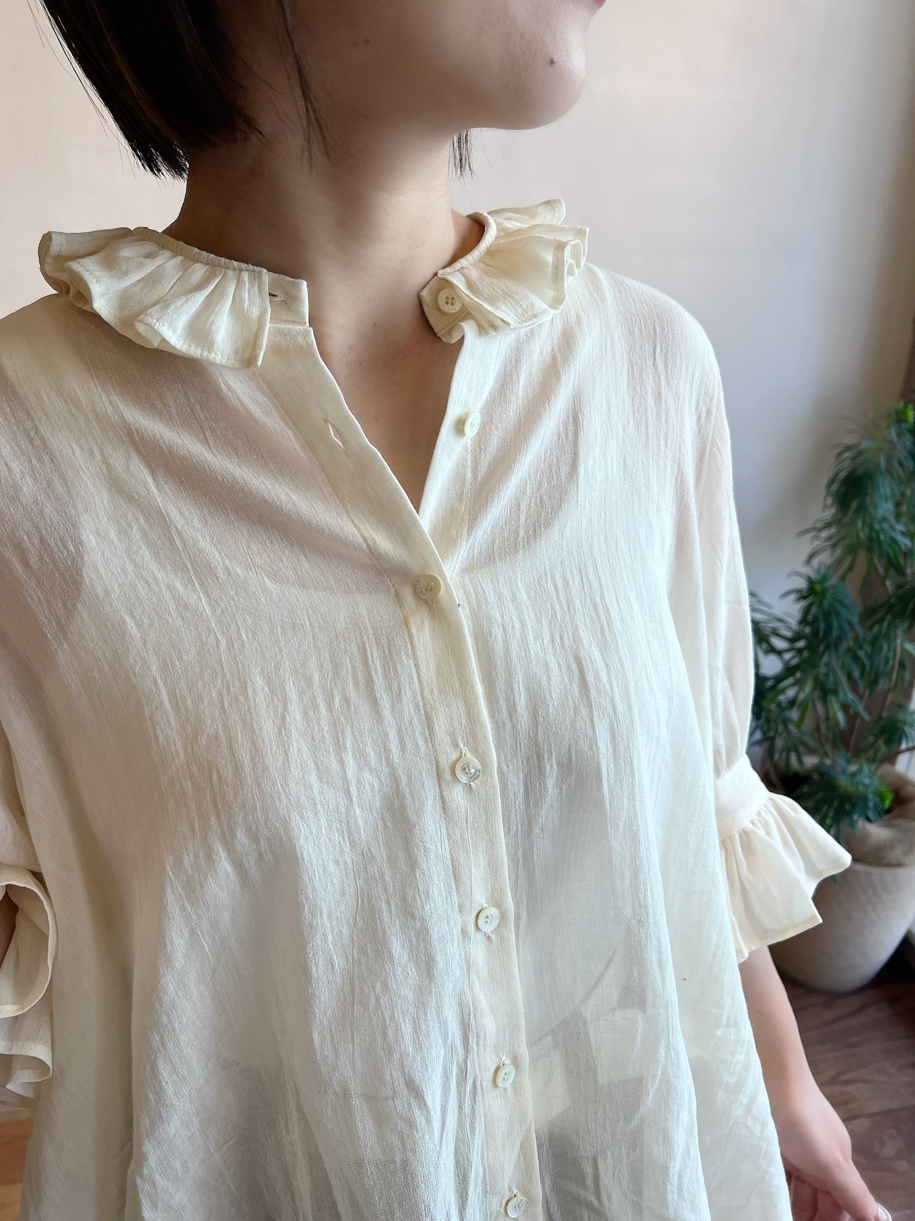 特徴のフリル襟の印象は継続して襟の収まりが良いように端にステッチを入れました。半袖のカフスにもフリルが入っていて大人っぽい可愛らしさも表現しました。暖かい季節には1枚で、肌寒い時にはカーディガンなどに合わせてお楽しみください。