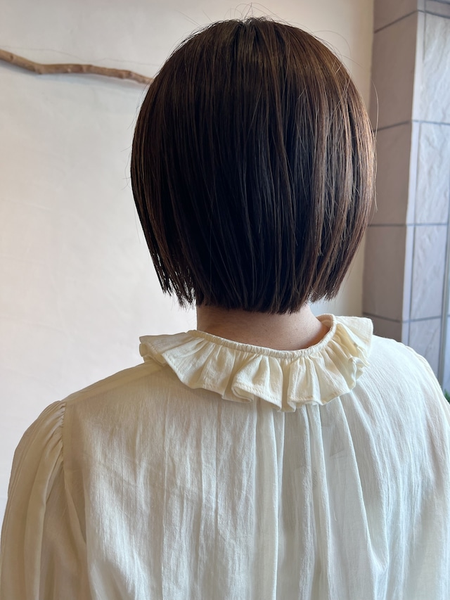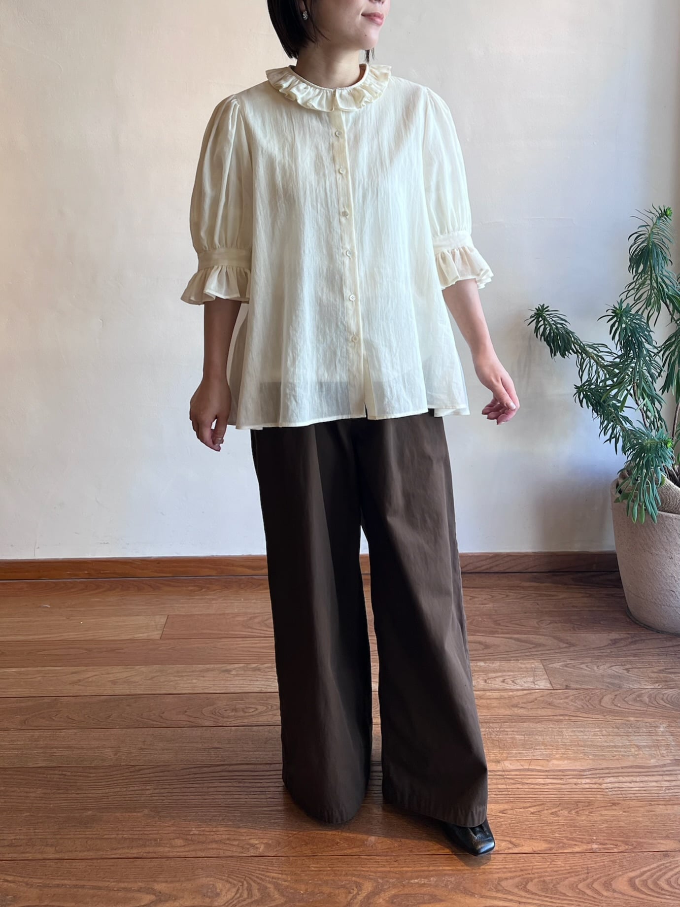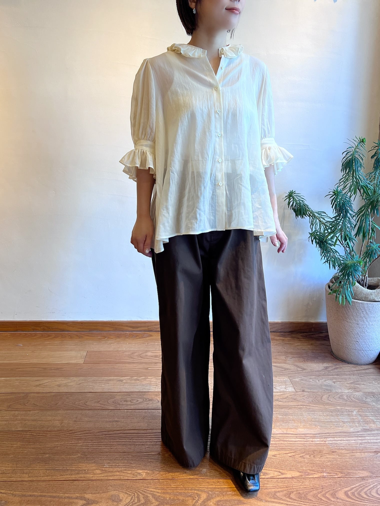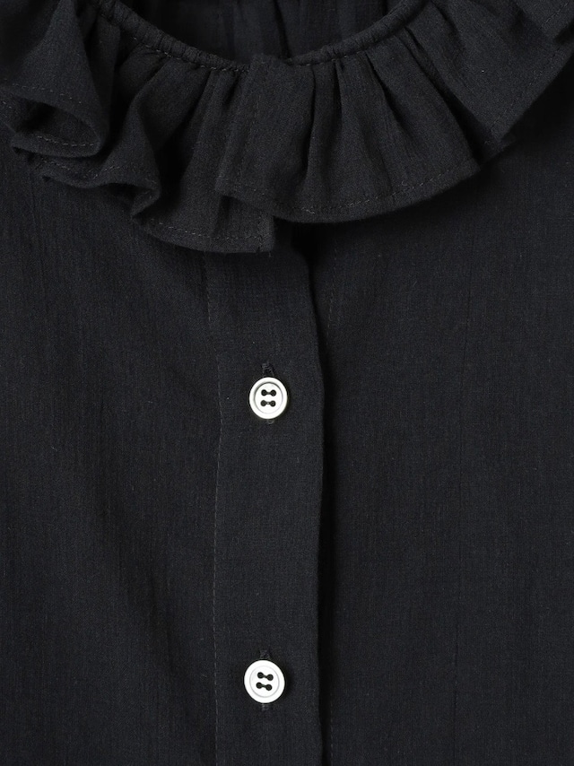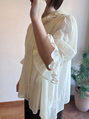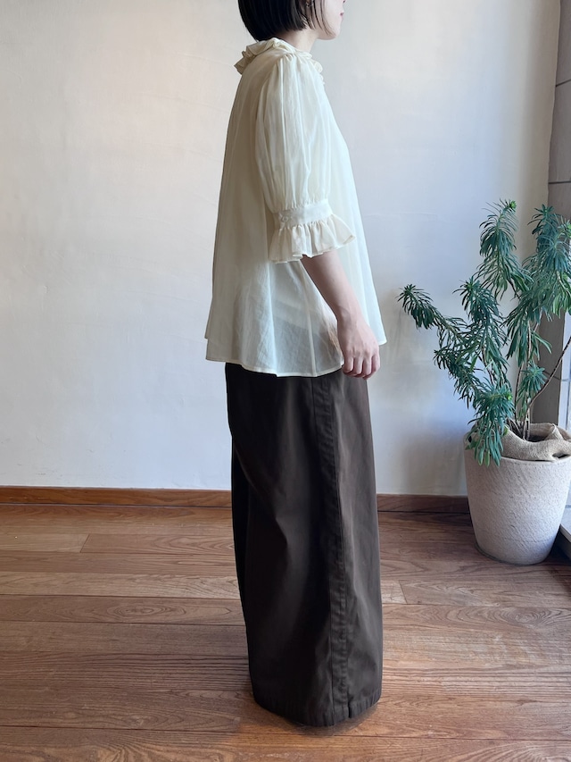 特徴のフリル襟の印象は継続して襟の収まりが良いように端にステッチを入れました。半袖のカフスにもフリルが入っていて大人っぽい可愛らしさも表現しました。暖かい季節には1枚で、肌寒い時にはカーディガンなどに合わせてお楽しみください。