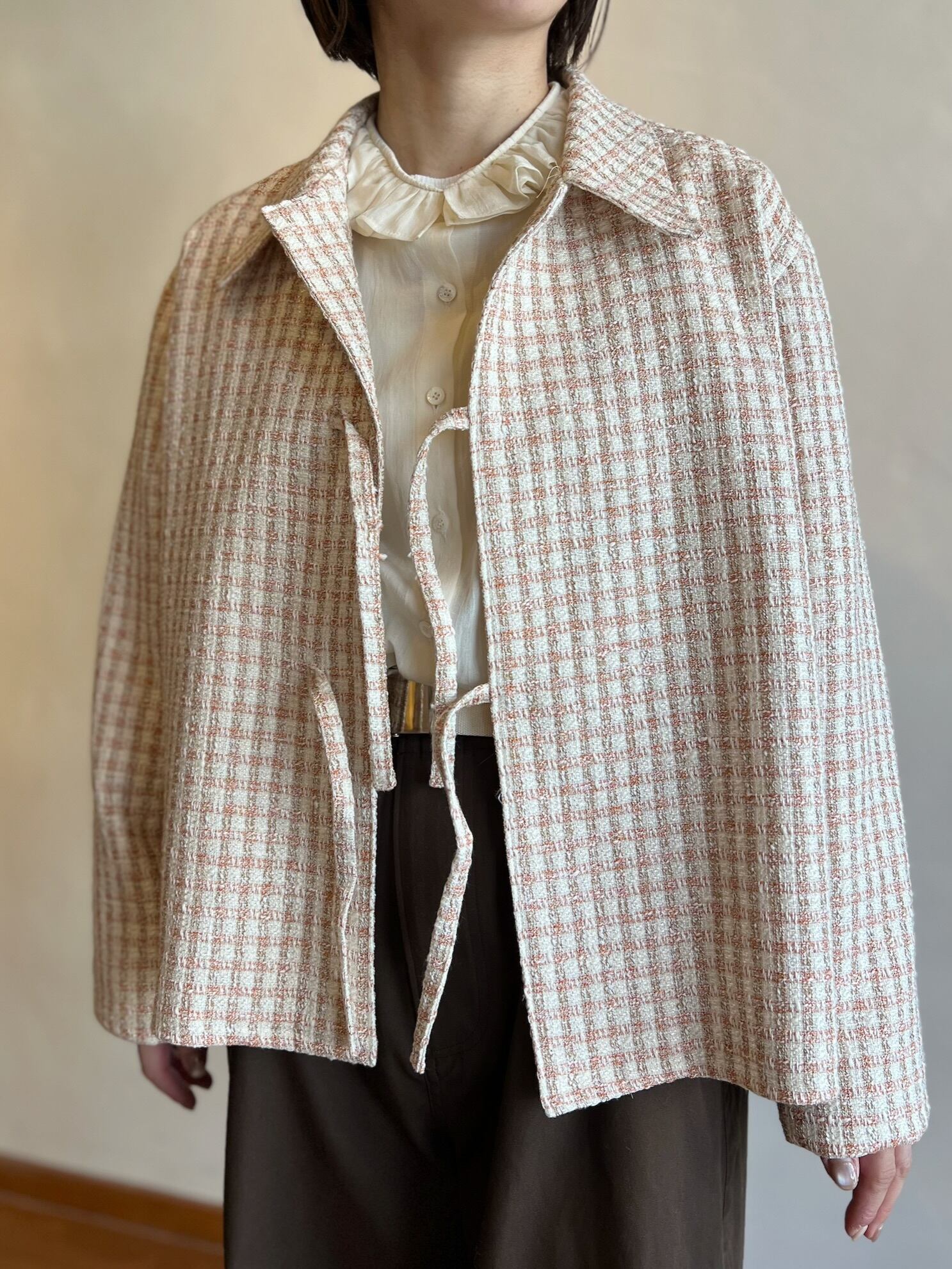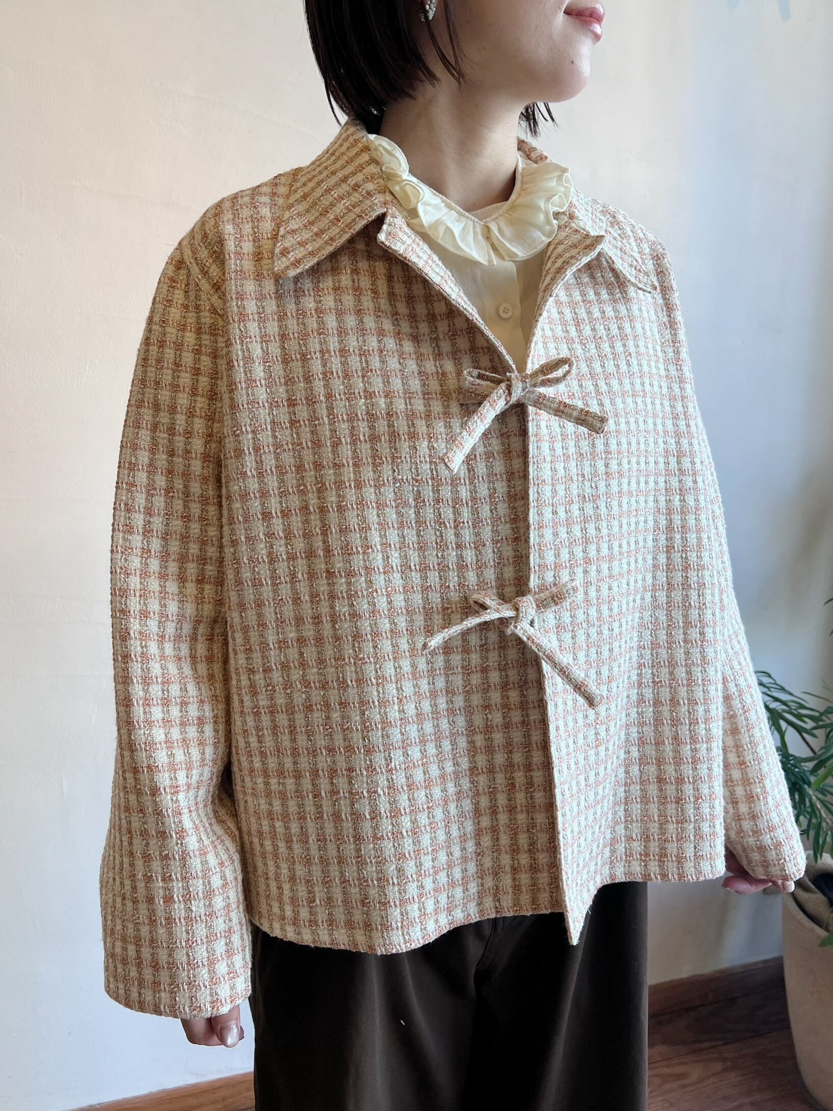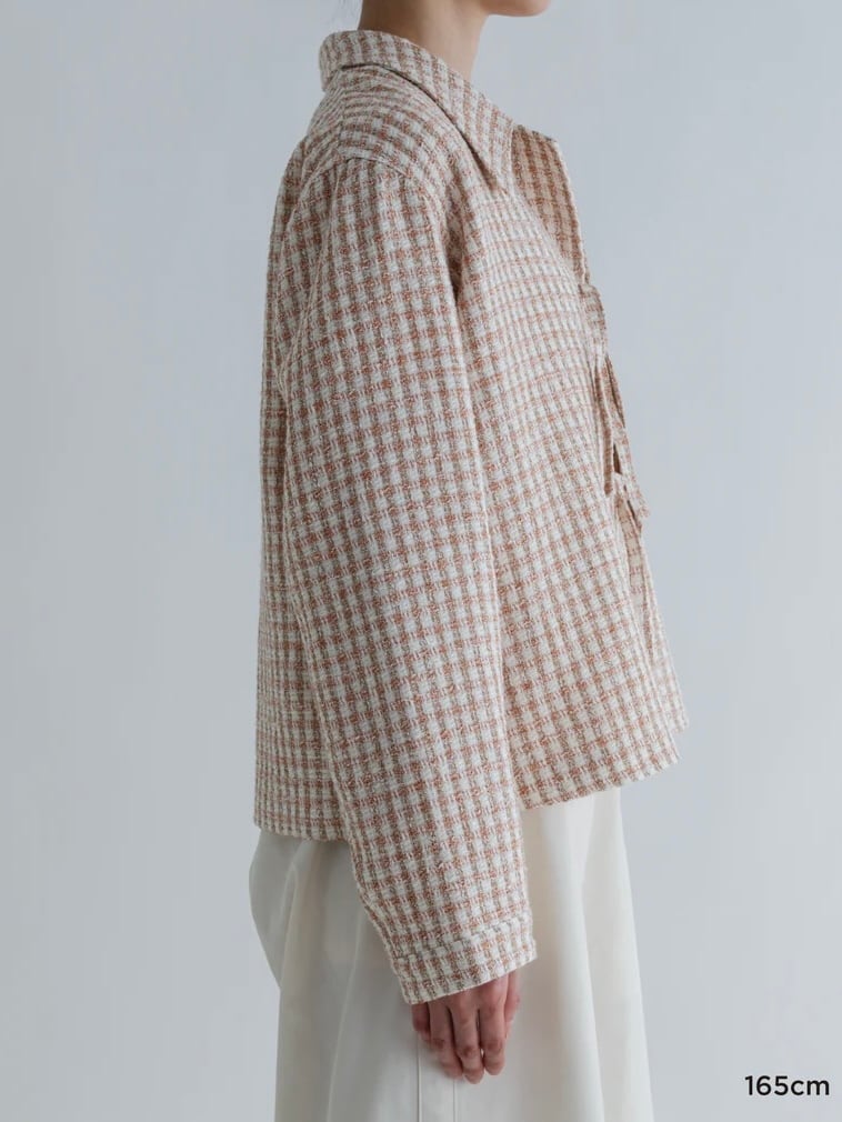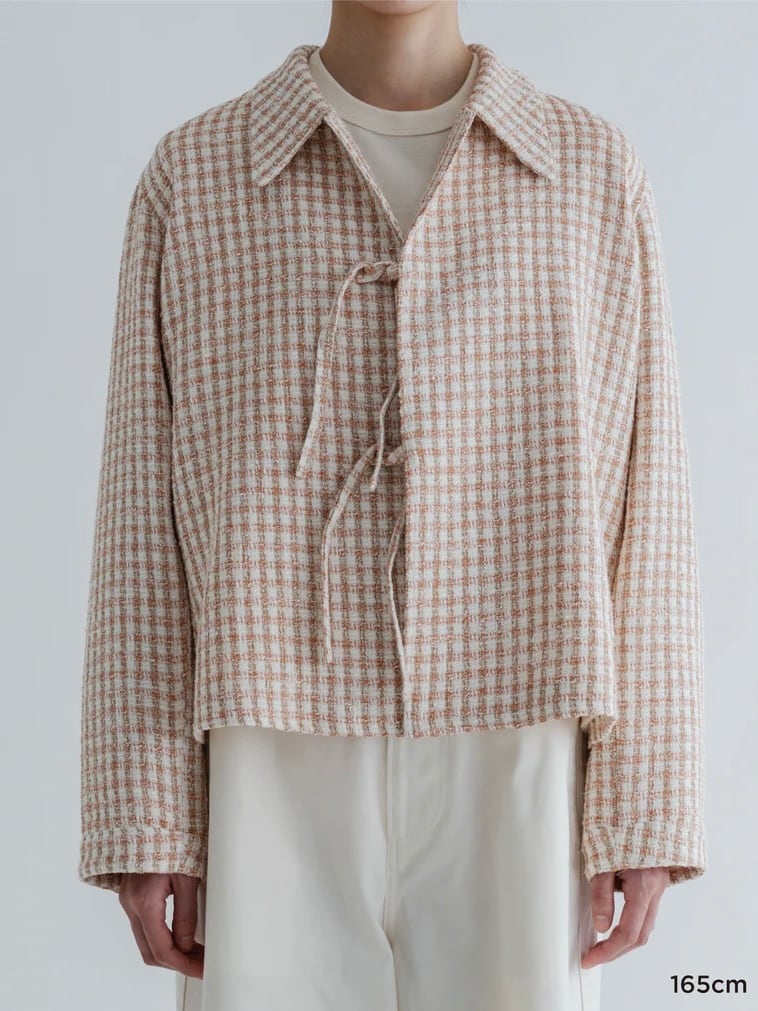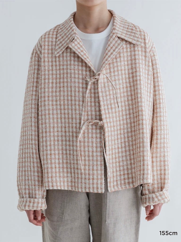 ツイードジャケットと言えばノーカラーというイメージが強いと思うのですが、コンサバな雰囲気になりすぎないように MEYAME らしく一味違った襟の形にしました。フロントの合わせの部分もボタンやホックではなく共地の紐で柔らかい印象に。ほどよいゆとりのあるシルエットなので中にニットやロンTを合わせて、春の肌寒い時期から活躍してくれます。袖部分も含めすべての部分に肌あたりの良い裏地が付いていて滑らかで快適な着心地です。サイドにポケットがあるのも嬉しいポイント。