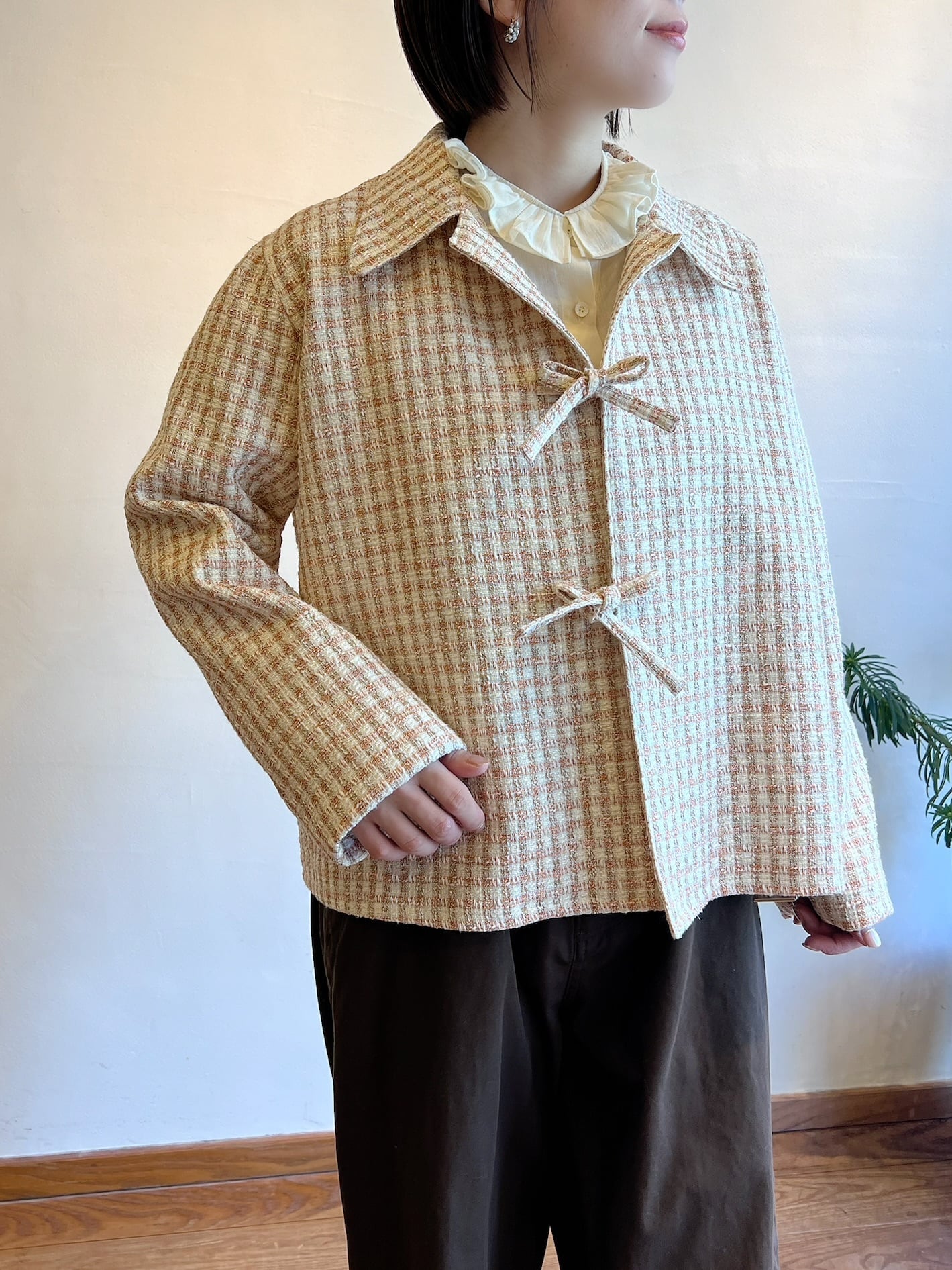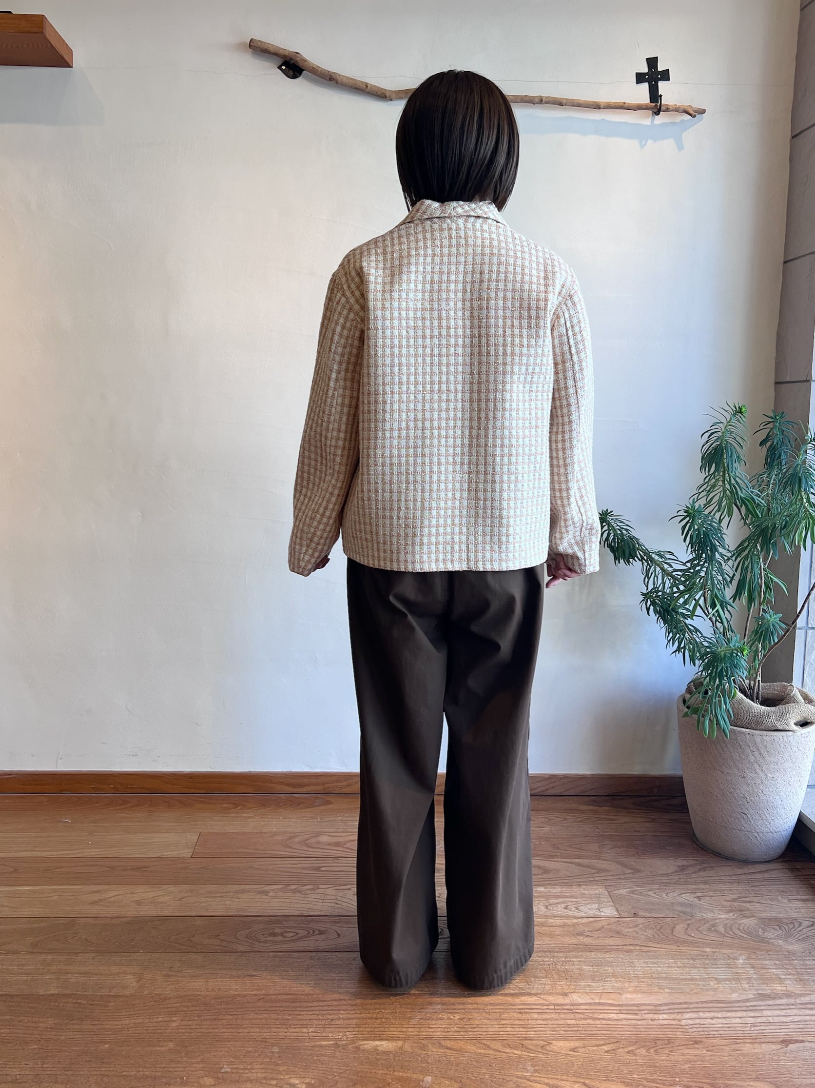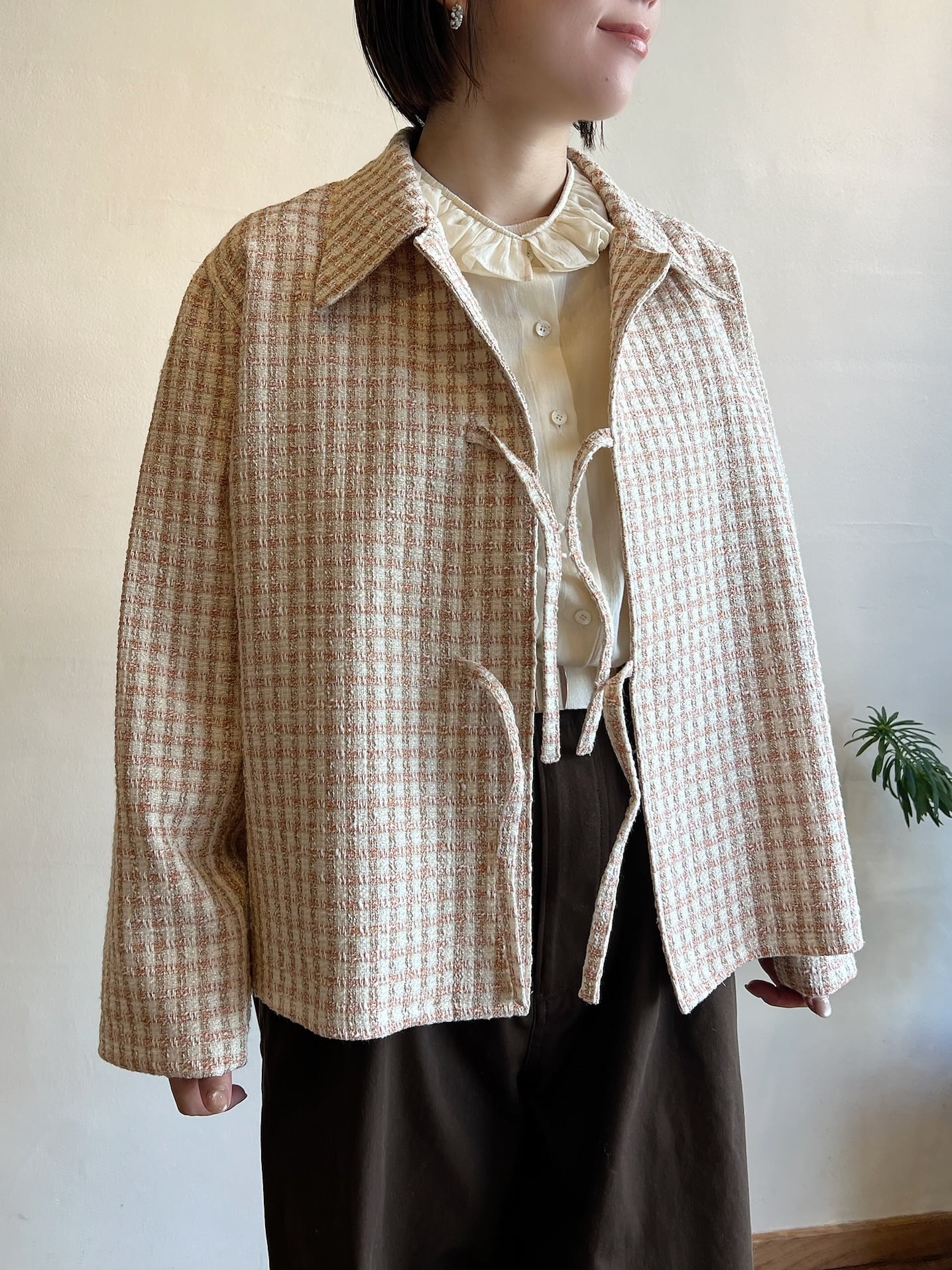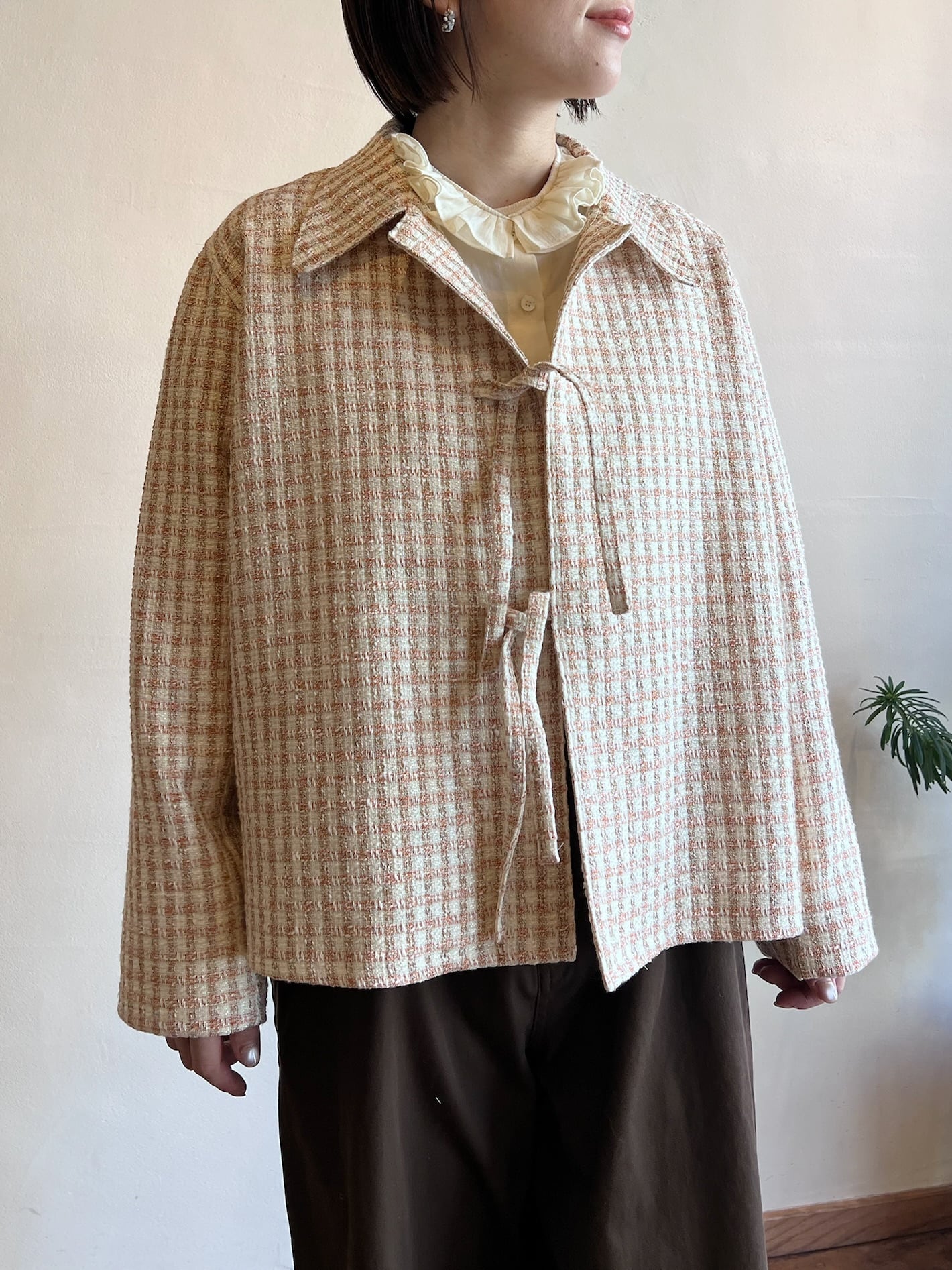 ツイードジャケットと言えばノーカラーというイメージが強いと思うのですが、コンサバな雰囲気になりすぎないように MEYAME らしく一味違った襟の形にしました。フロントの合わせの部分もボタンやホックではなく共地の紐で柔らかい印象に。ほどよいゆとりのあるシルエットなので中にニットやロンTを合わせて、春の肌寒い時期から活躍してくれます。袖部分も含めすべての部分に肌あたりの良い裏地が付いていて滑らかで快適な着心地です。サイドにポケットがあるのも嬉しいポイント。