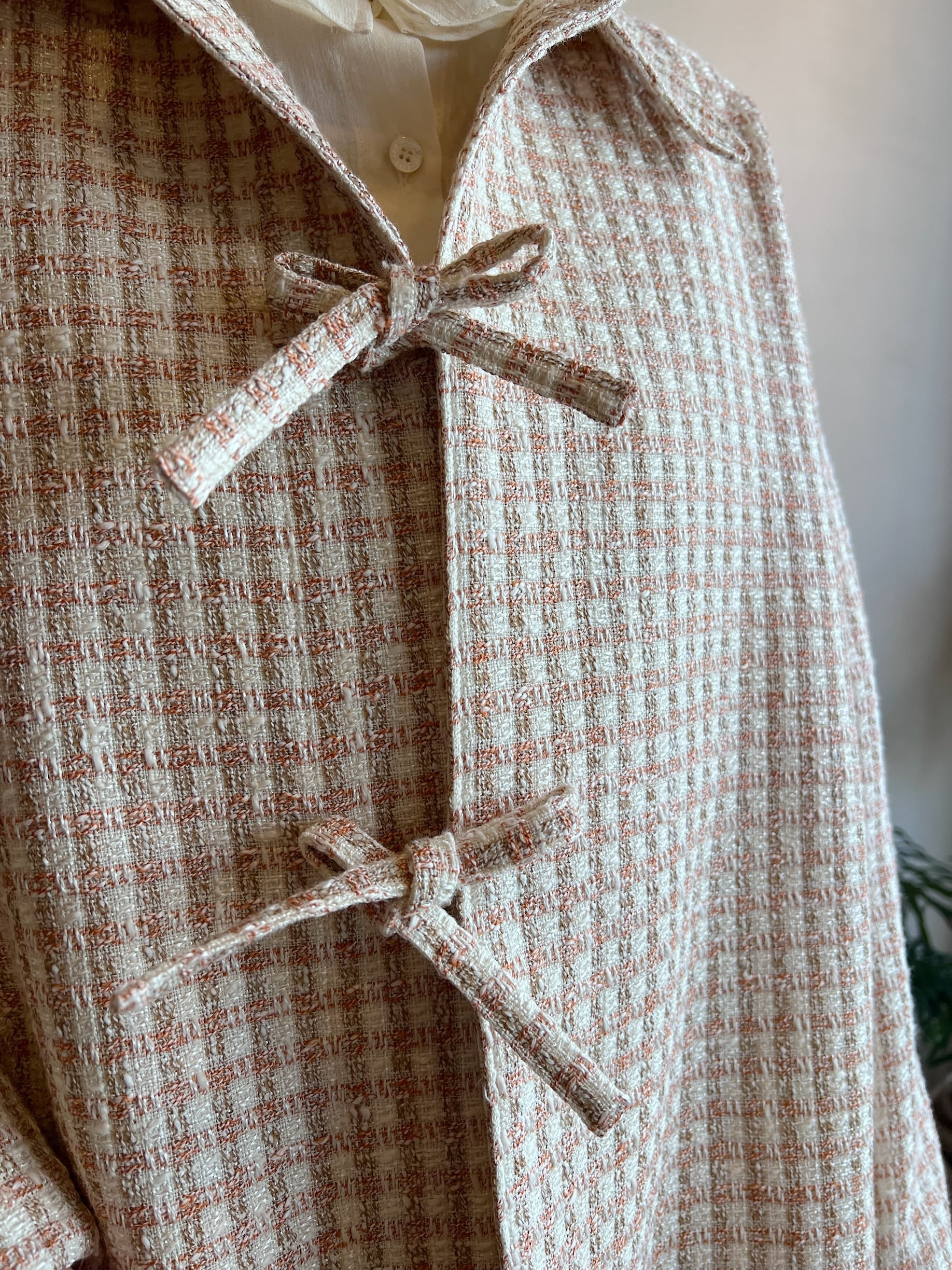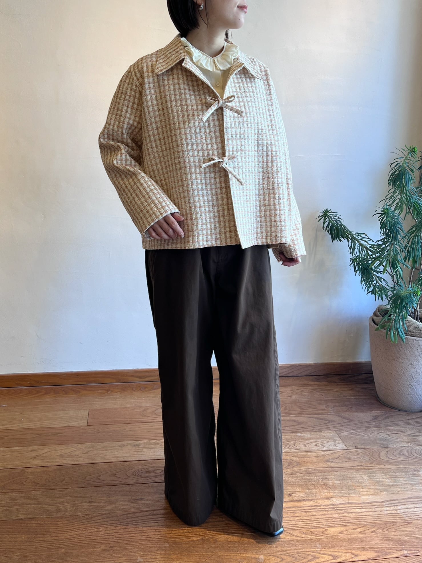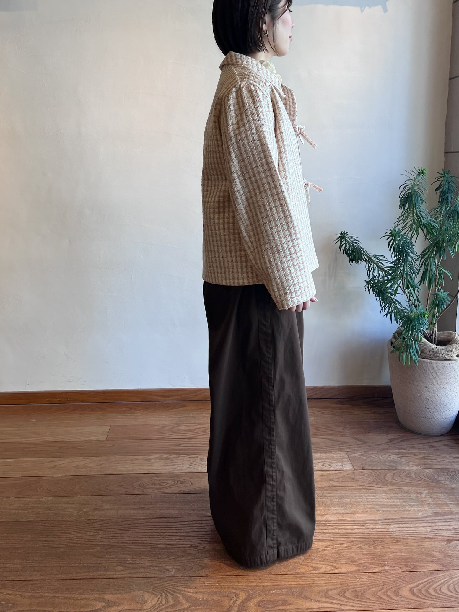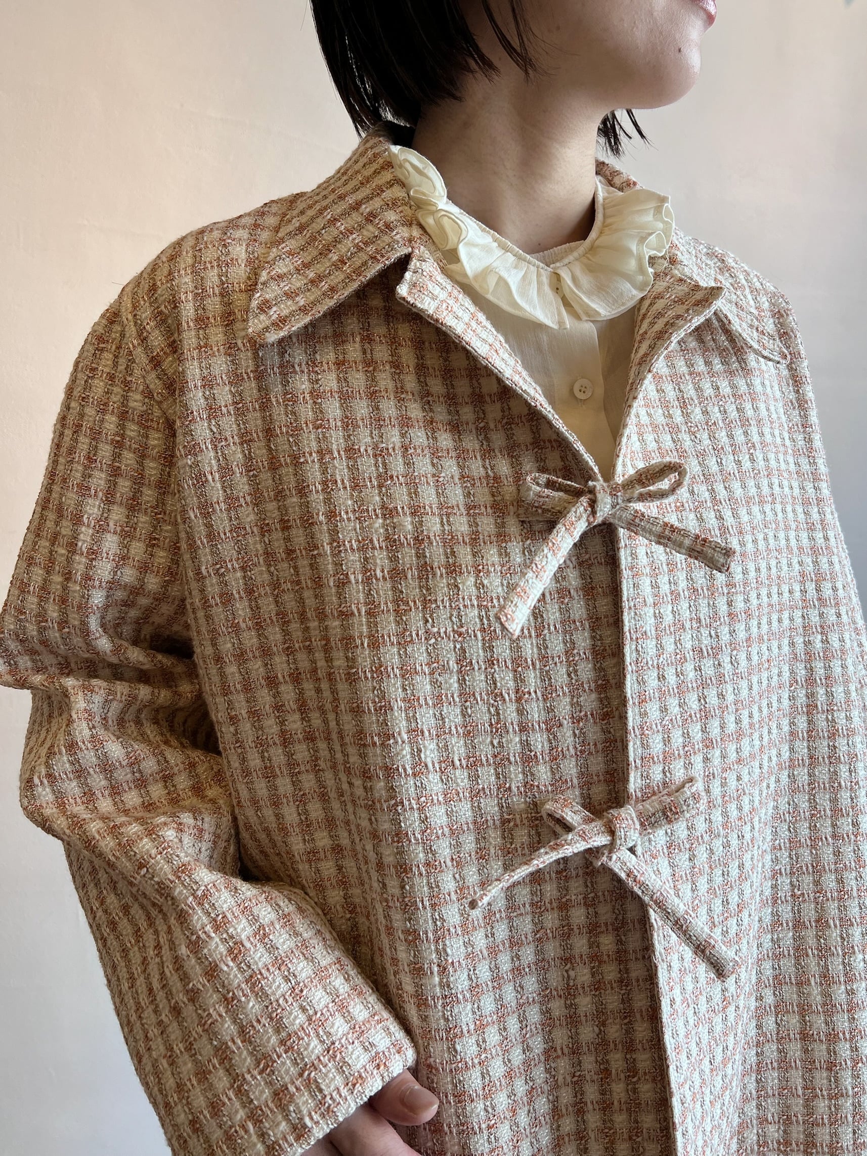 ツイードジャケットと言えばノーカラーというイメージが強いと思うのですが、コンサバな雰囲気になりすぎないように MEYAME らしく一味違った襟の形にしました。フロントの合わせの部分もボタンやホックではなく共地の紐で柔らかい印象に。ほどよいゆとりのあるシルエットなので中にニットやロンTを合わせて、春の肌寒い時期から活躍してくれます。袖部分も含めすべての部分に肌あたりの良い裏地が付いていて滑らかで快適な着心地です。サイドにポケットがあるのも嬉しいポイント。