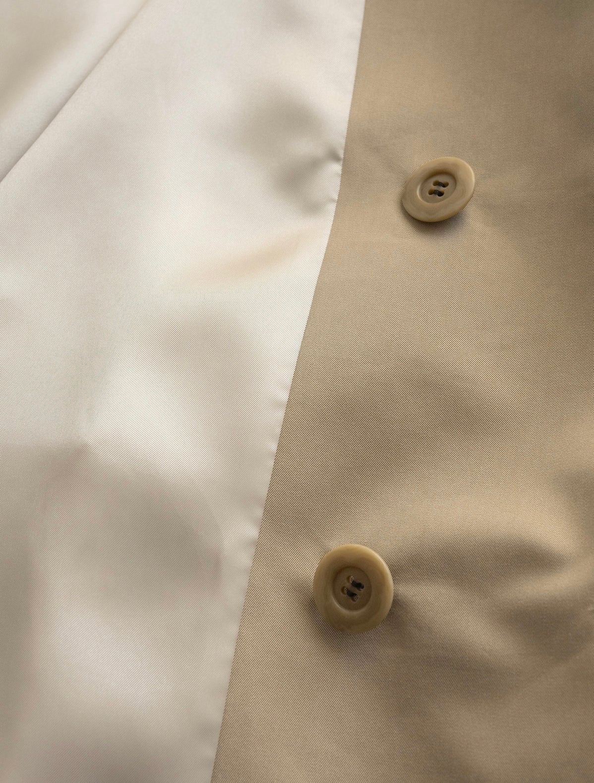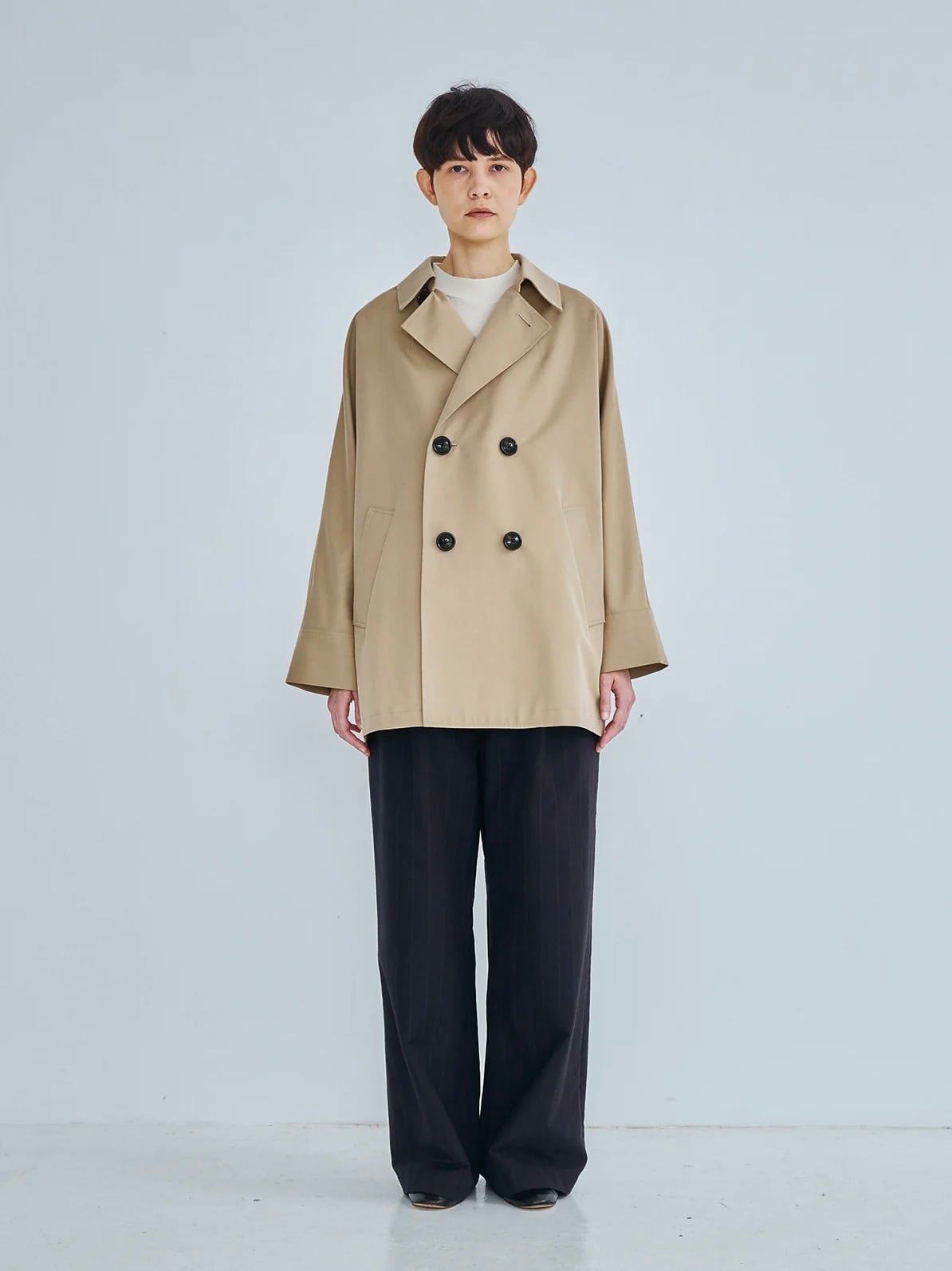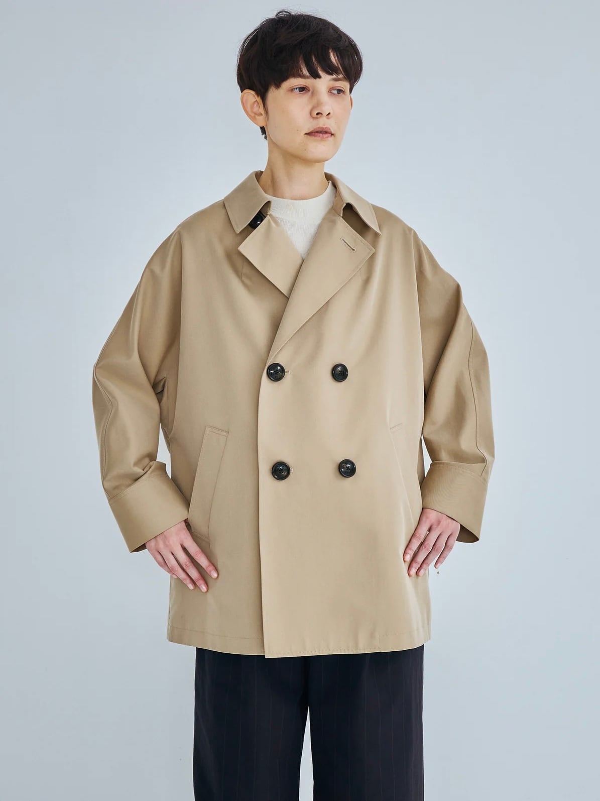 伝統的なトレンチコートに使われていた、どこか懐かしいしっかり綾目の立った高密度のギャバジンを再現しながら進化させた。2 色の糸で織ることで深みと立体感を出し、動くたびに色が変わり躍動感がある。仕上げのピーチ加工で更なる膨らみと優しく滑らかな肌触りを出し、更にエアタンブラーをかけることで、しわになりにくく初めて袖を通したその日から何年も愛用しているかのような着心地を実現、また同時に撥水性もプラス。