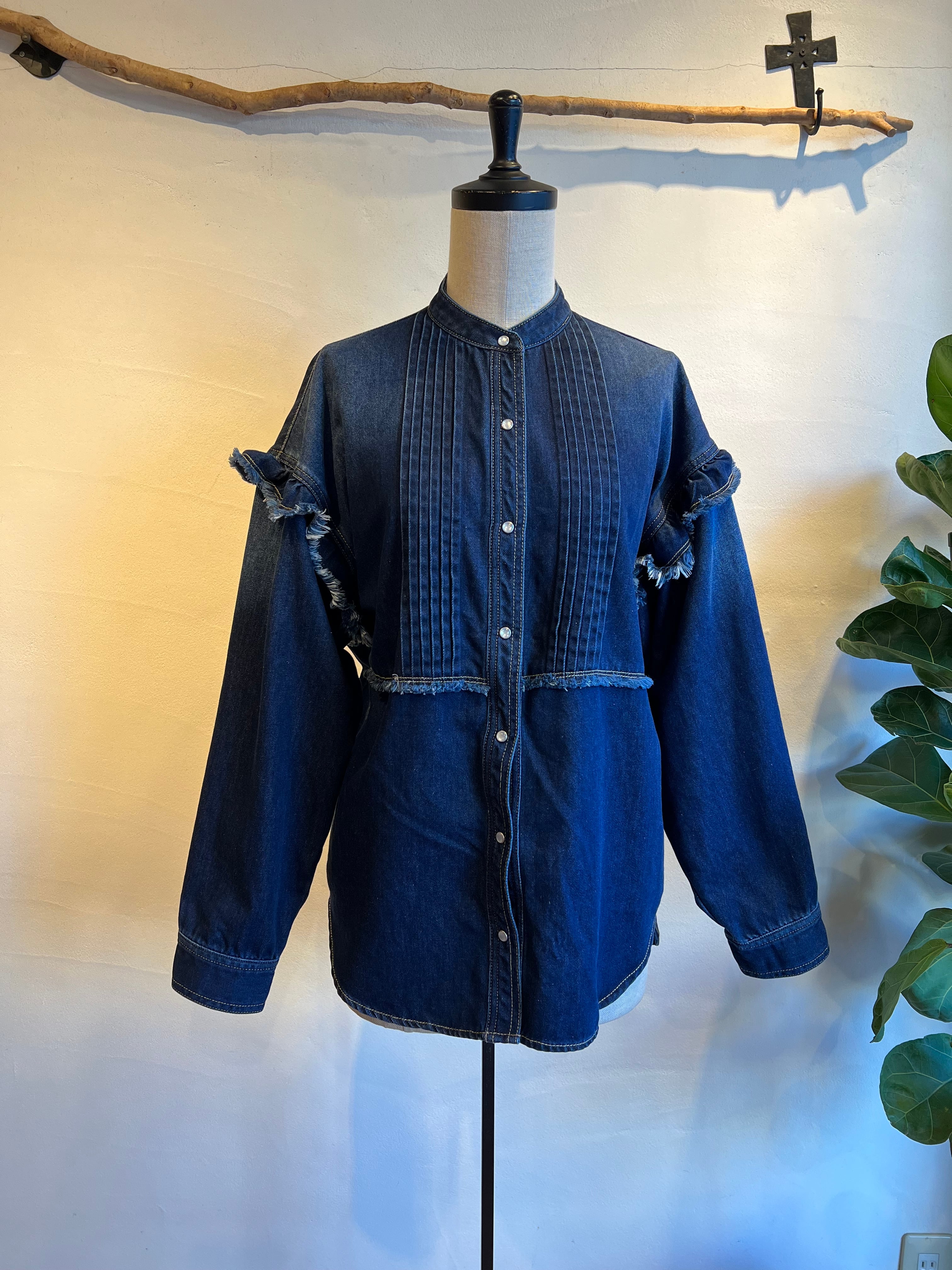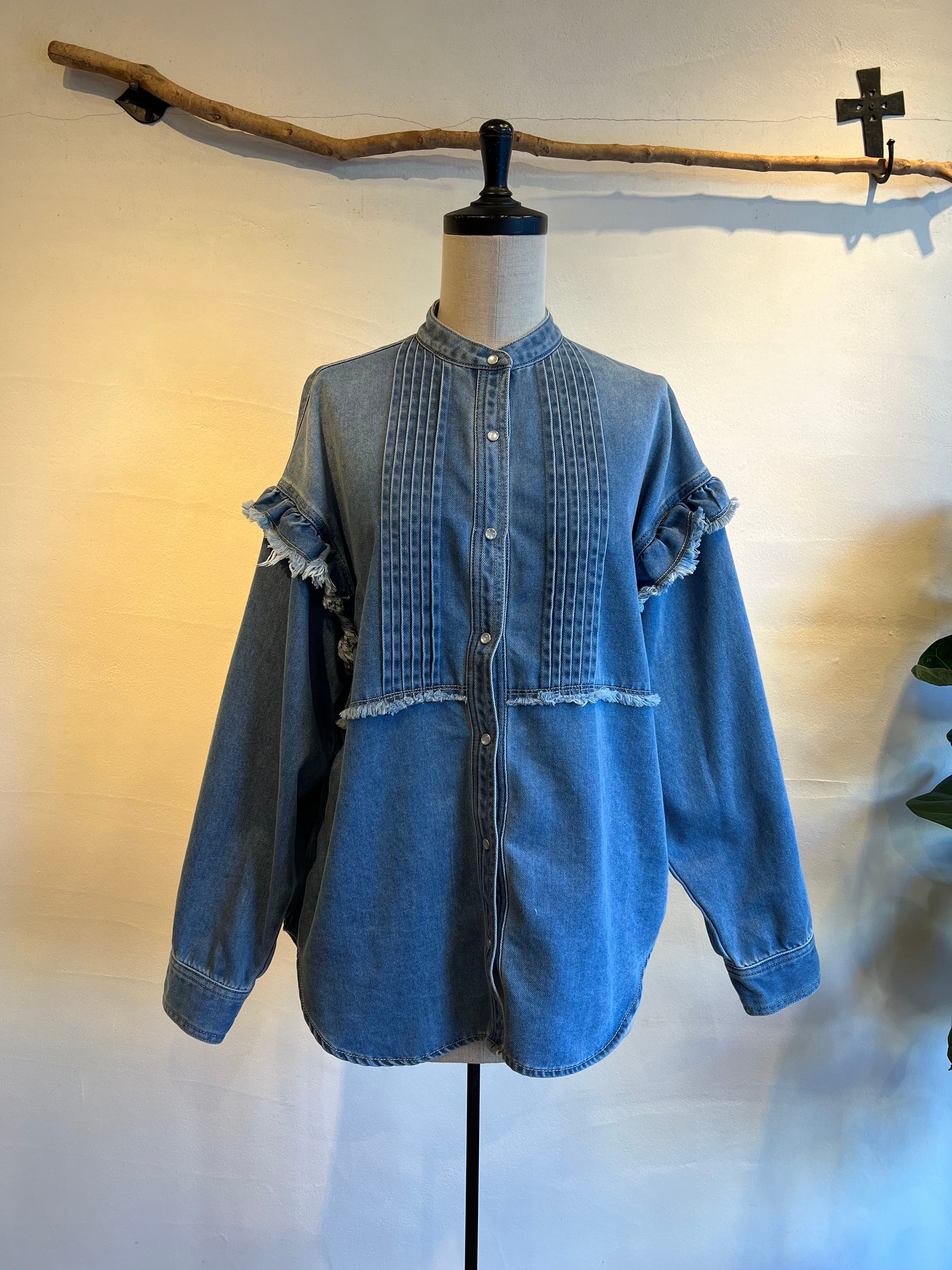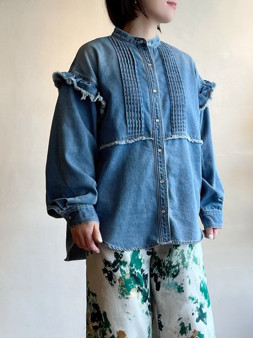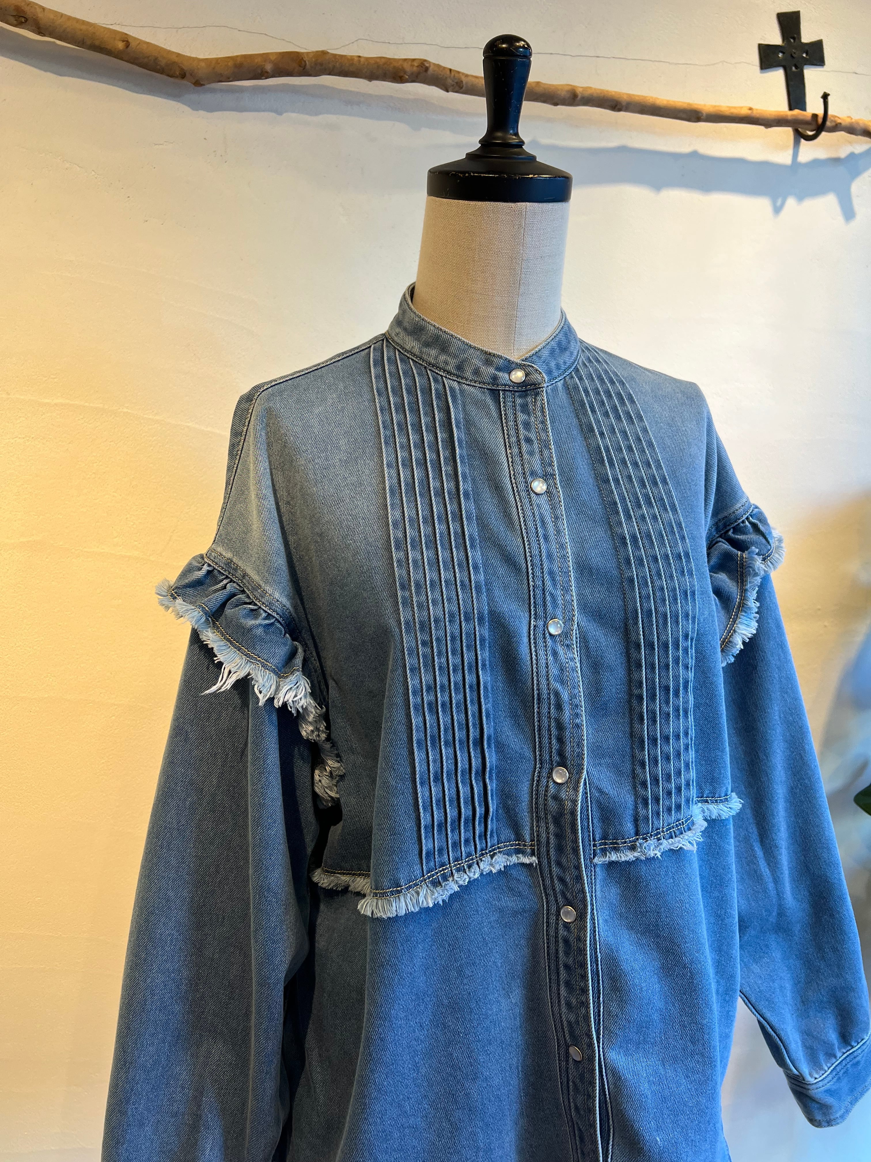 細やかなピンタックとフリルが施されたデニムシャツです。フリルが女性らしさを引き立て、絶妙なカッティングにより、着心地が良く、いろいろなシーンで活躍する一枚。カジュアルに合わせるのはもちろん、スカートと合わせればよりエレガントな印象に。他にはないような存在感抜群のシャツです。