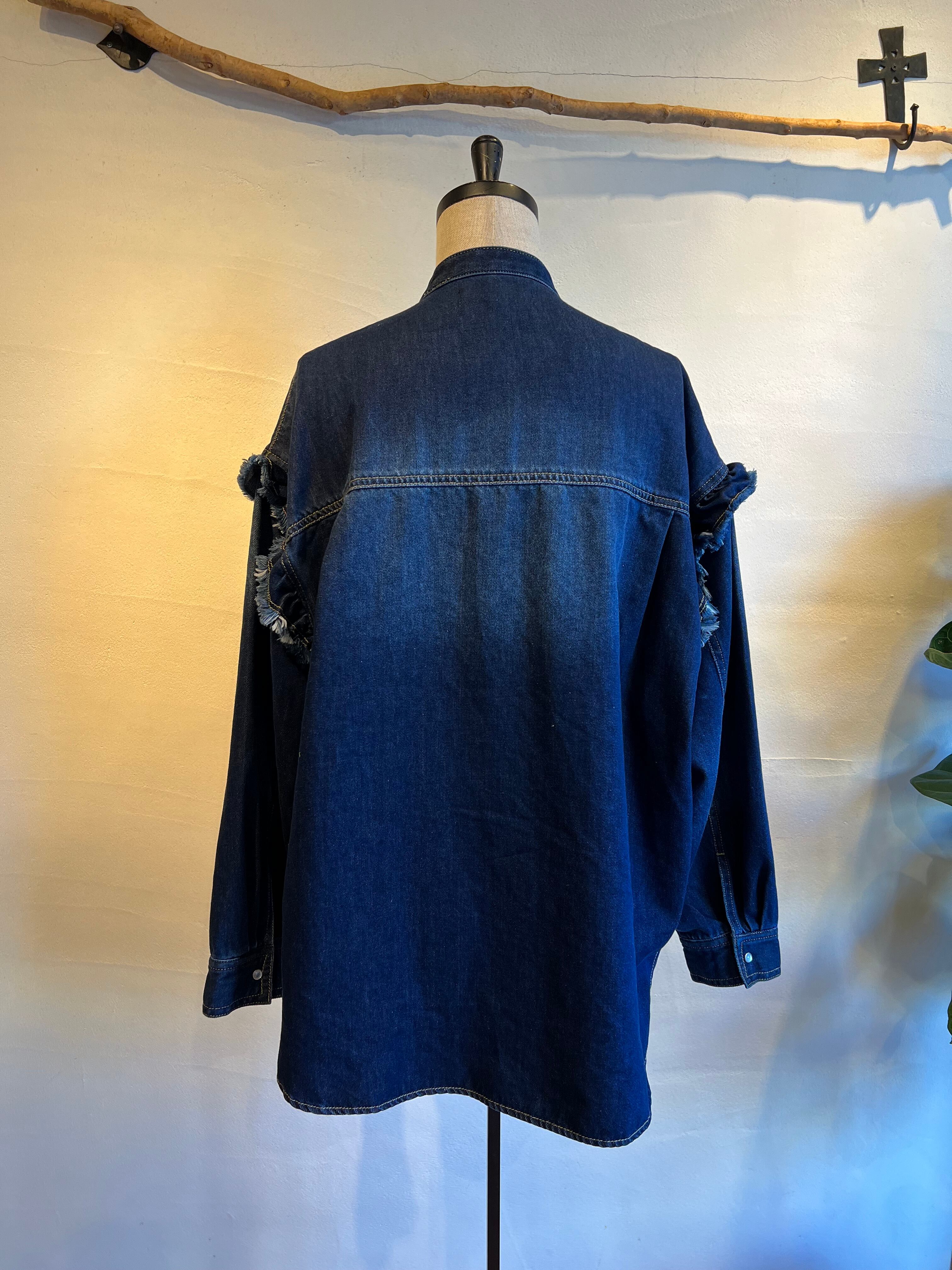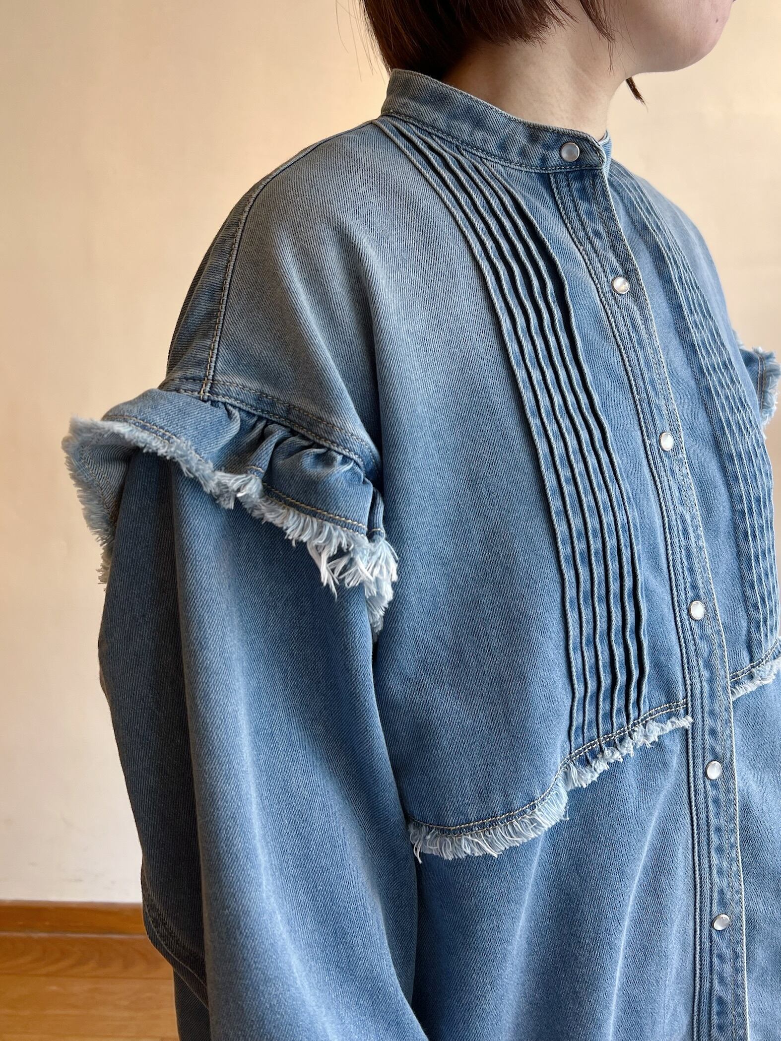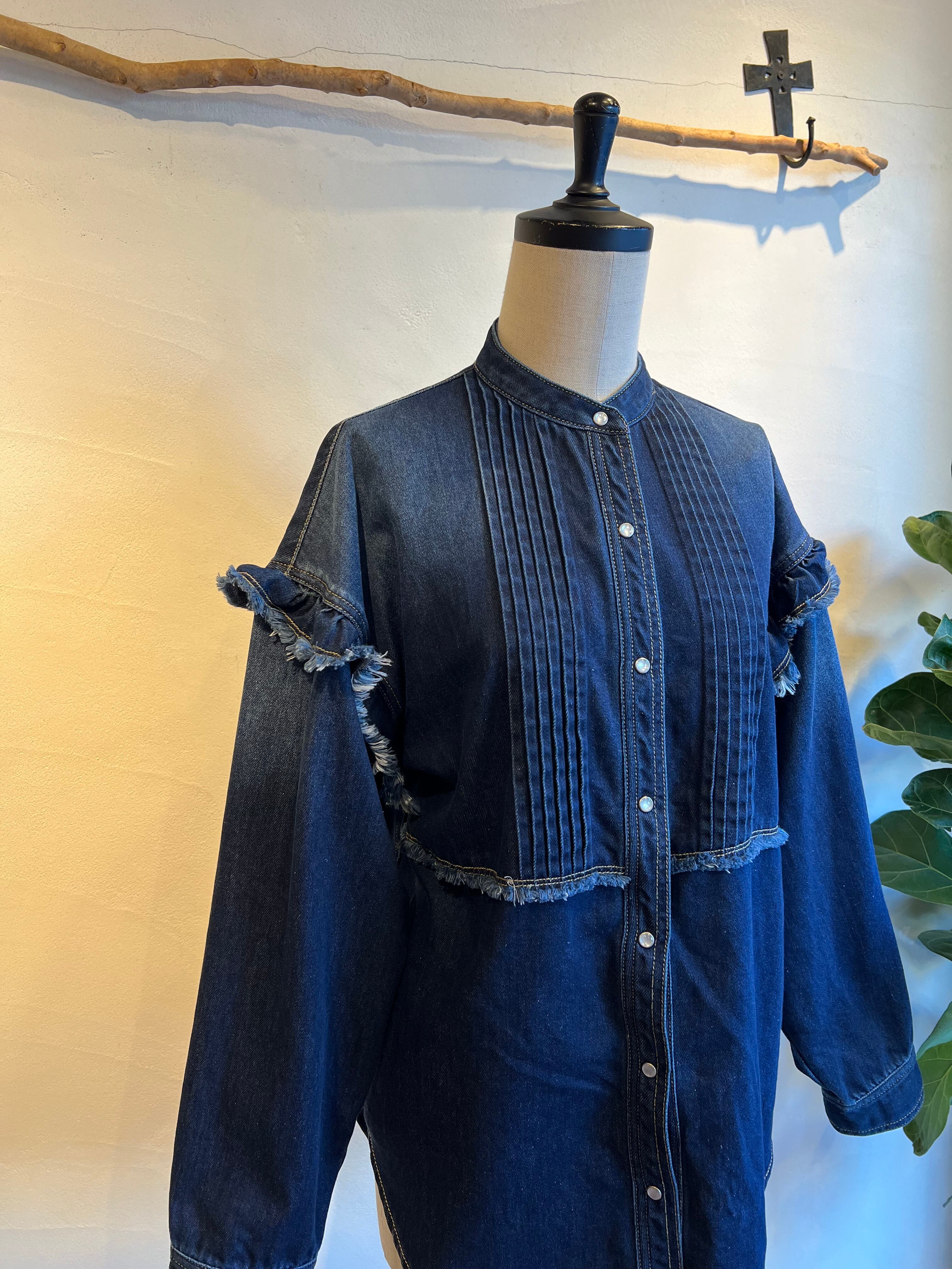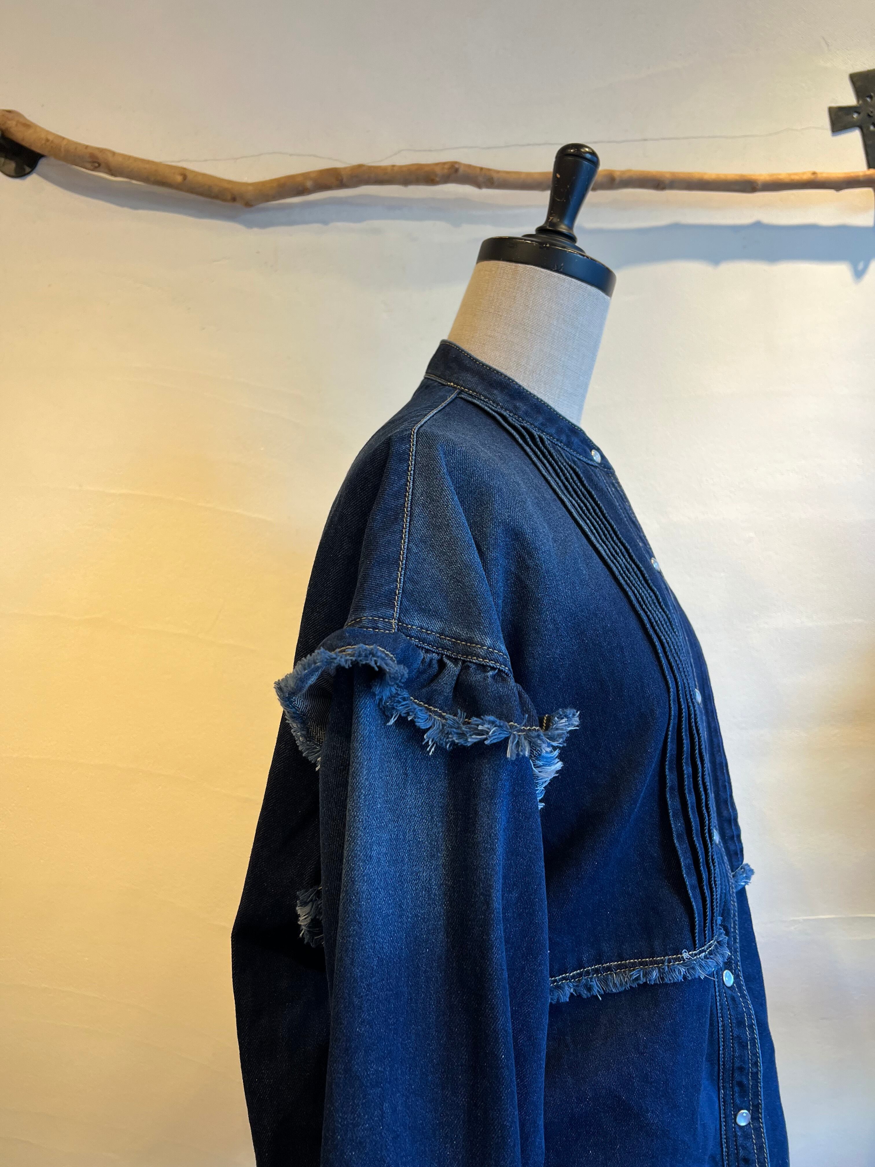 細やかなピンタックとフリルが施されたデニムシャツです。フリルが女性らしさを引き立て、絶妙なカッティングにより、着心地が良く、いろいろなシーンで活躍する一枚。カジュアルに合わせるのはもちろん、スカートと合わせればよりエレガントな印象に。他にはないような存在感抜群のシャツです。
