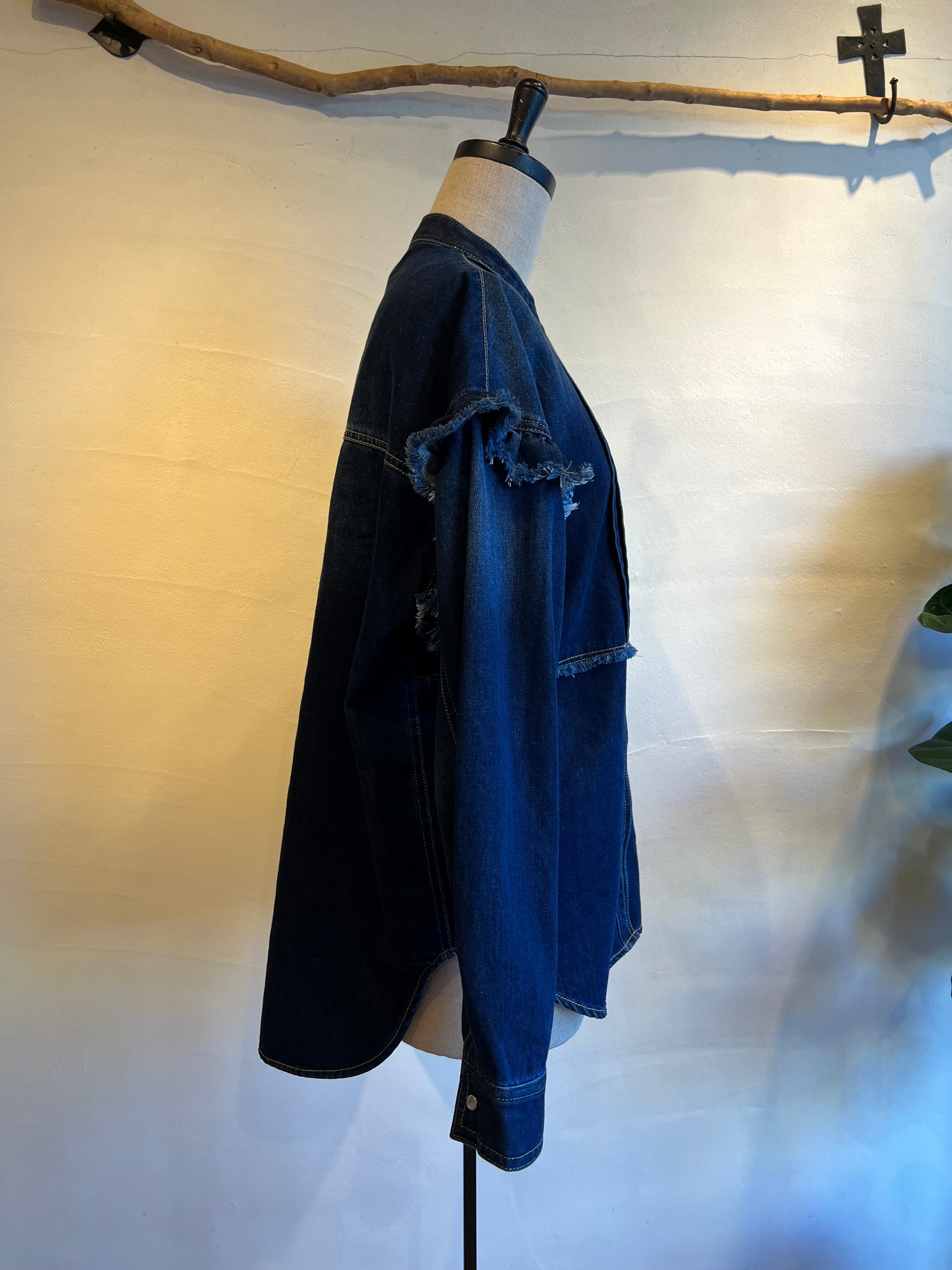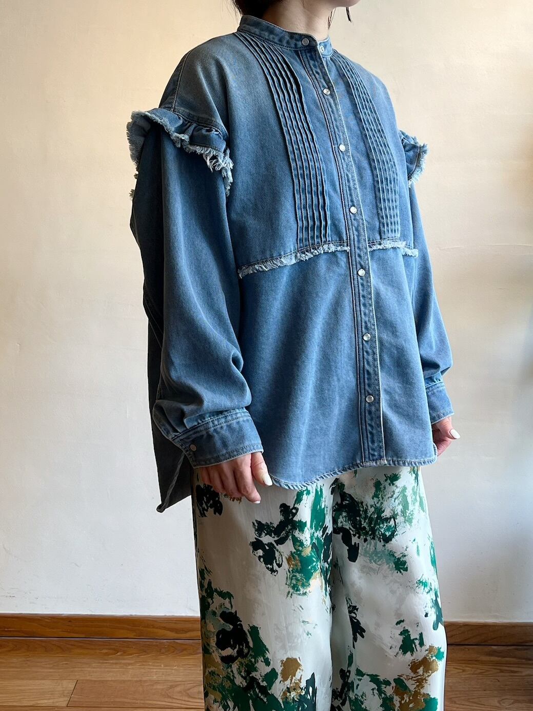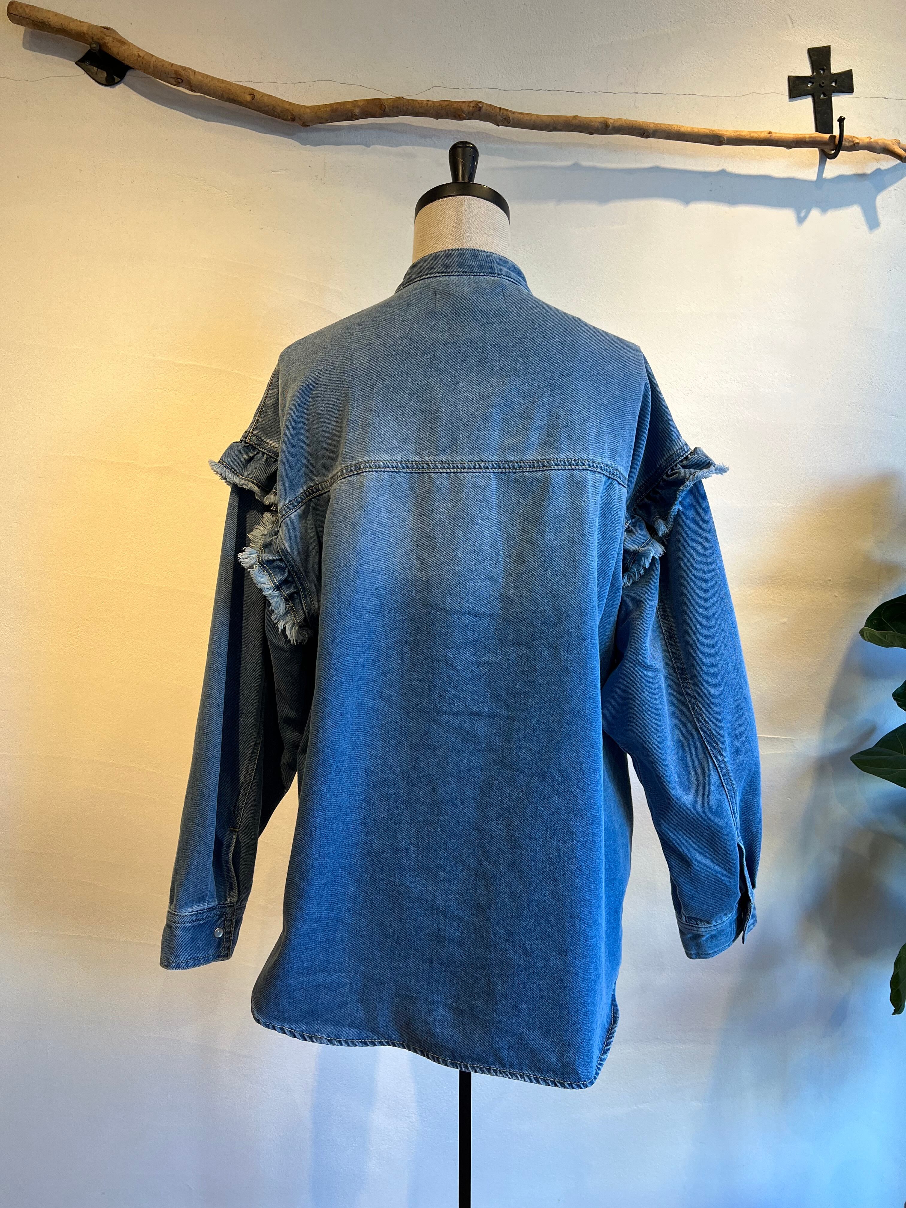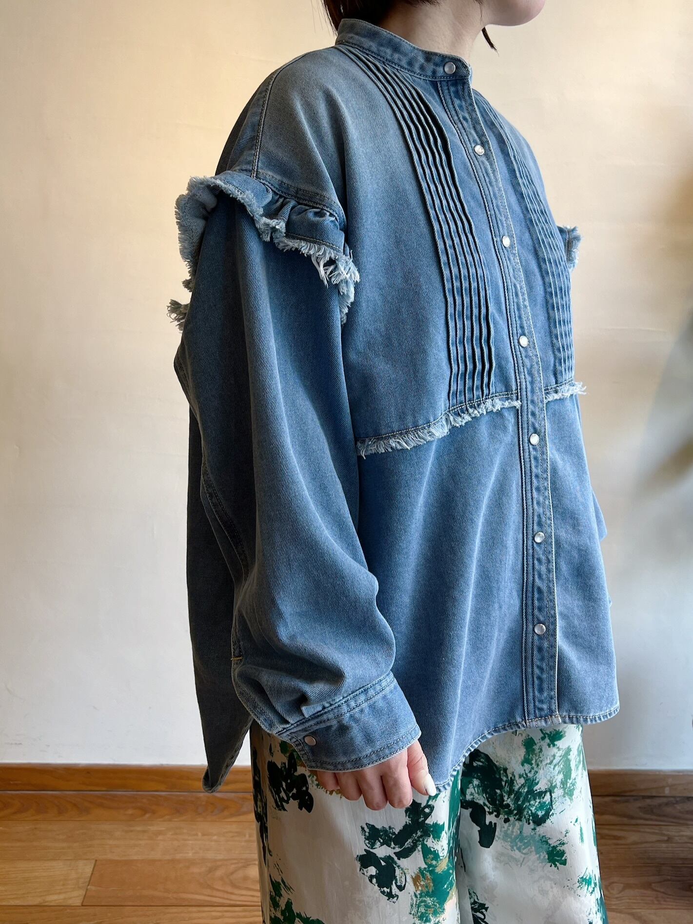 細やかなピンタックとフリルが施されたデニムシャツです。フリルが女性らしさを引き立て、絶妙なカッティングにより、着心地が良く、いろいろなシーンで活躍する一枚。カジュアルに合わせるのはもちろん、スカートと合わせればよりエレガントな印象に。他にはないような存在感抜群のシャツです。