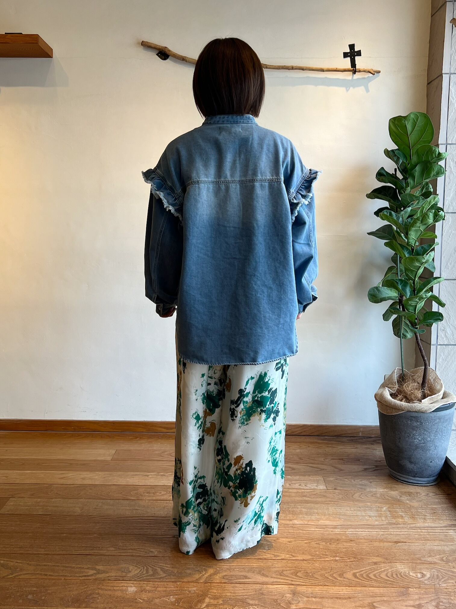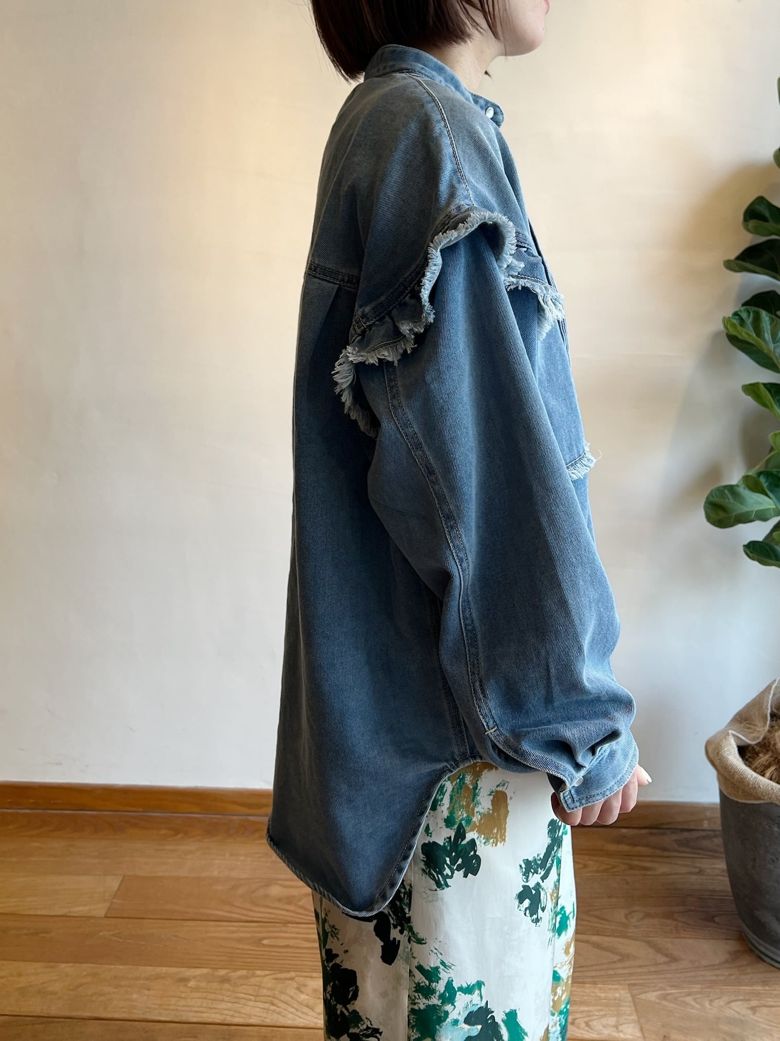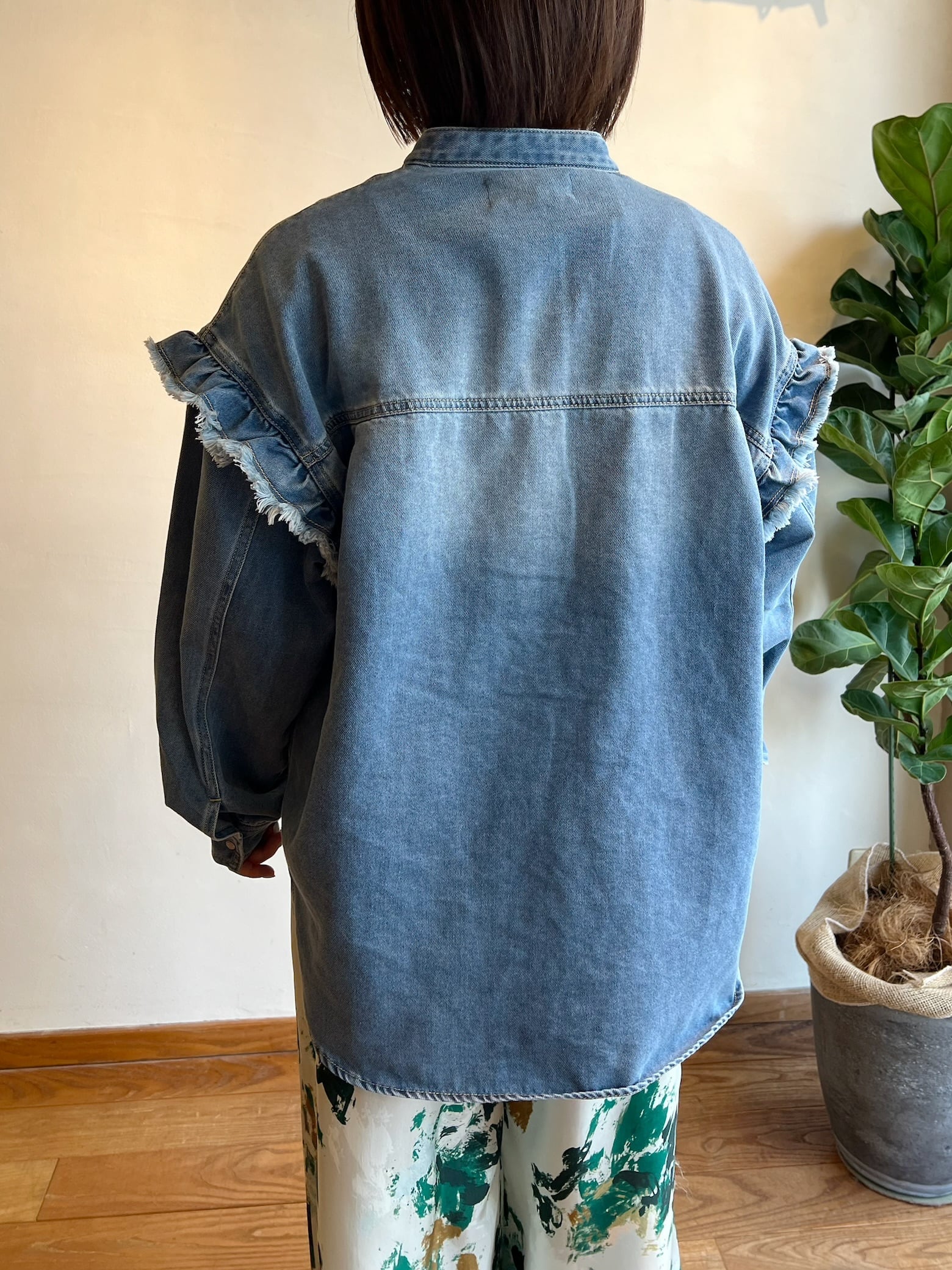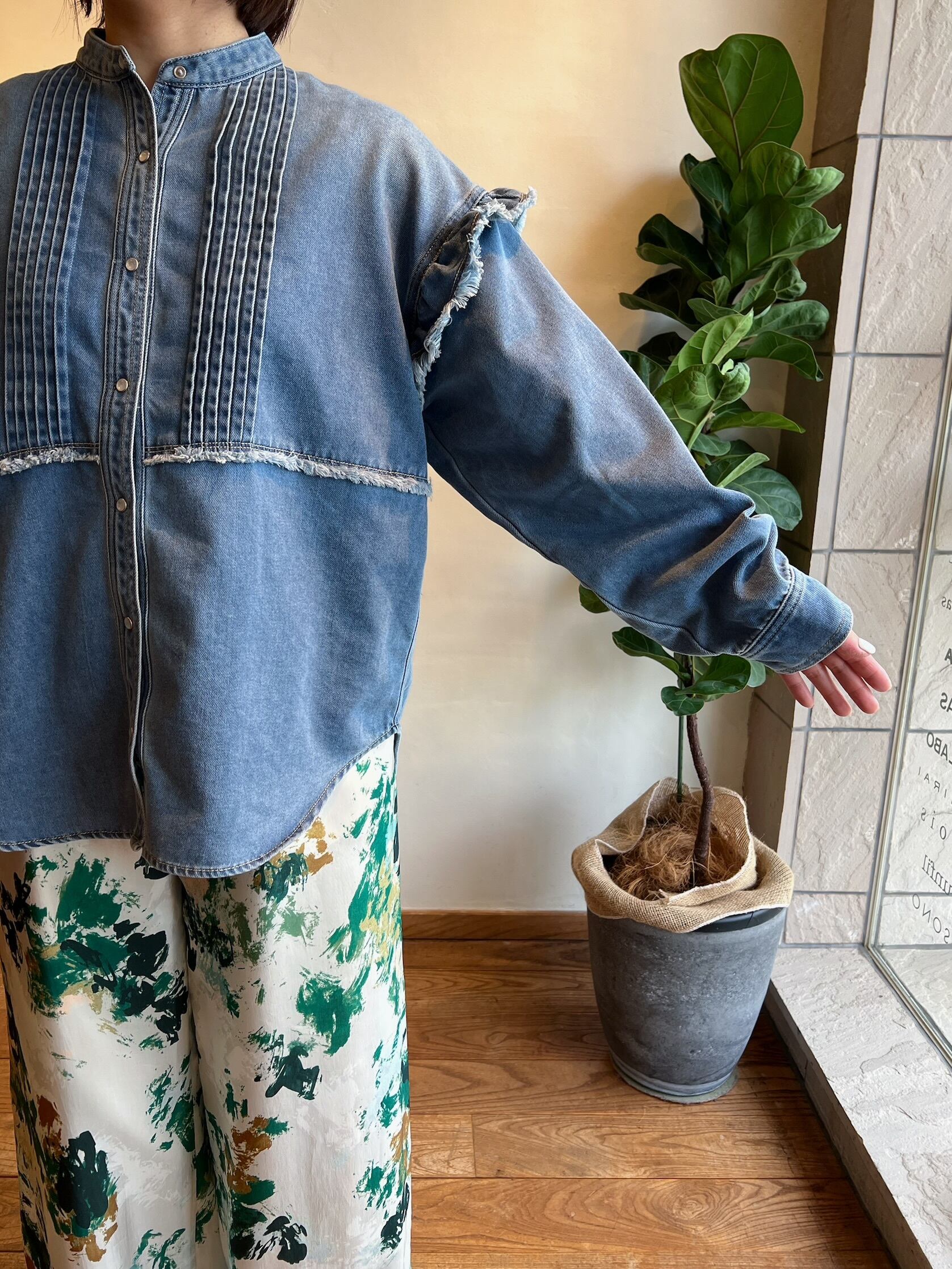 細やかなピンタックとフリルが施されたデニムシャツです。フリルが女性らしさを引き立て、絶妙なカッティングにより、着心地が良く、いろいろなシーンで活躍する一枚。カジュアルに合わせるのはもちろん、スカートと合わせればよりエレガントな印象に。他にはないような存在感抜群のシャツです。