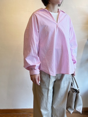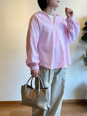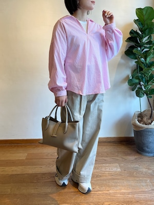 深めのスキッパーラインが顔まわりをすっきりと見せてくれるため、アクセサリーを添えるだけで完成度の高いスタイルに。ジャケットのインにも映えるデザインで、オフィスから休日まで幅広いシーンで活躍します。