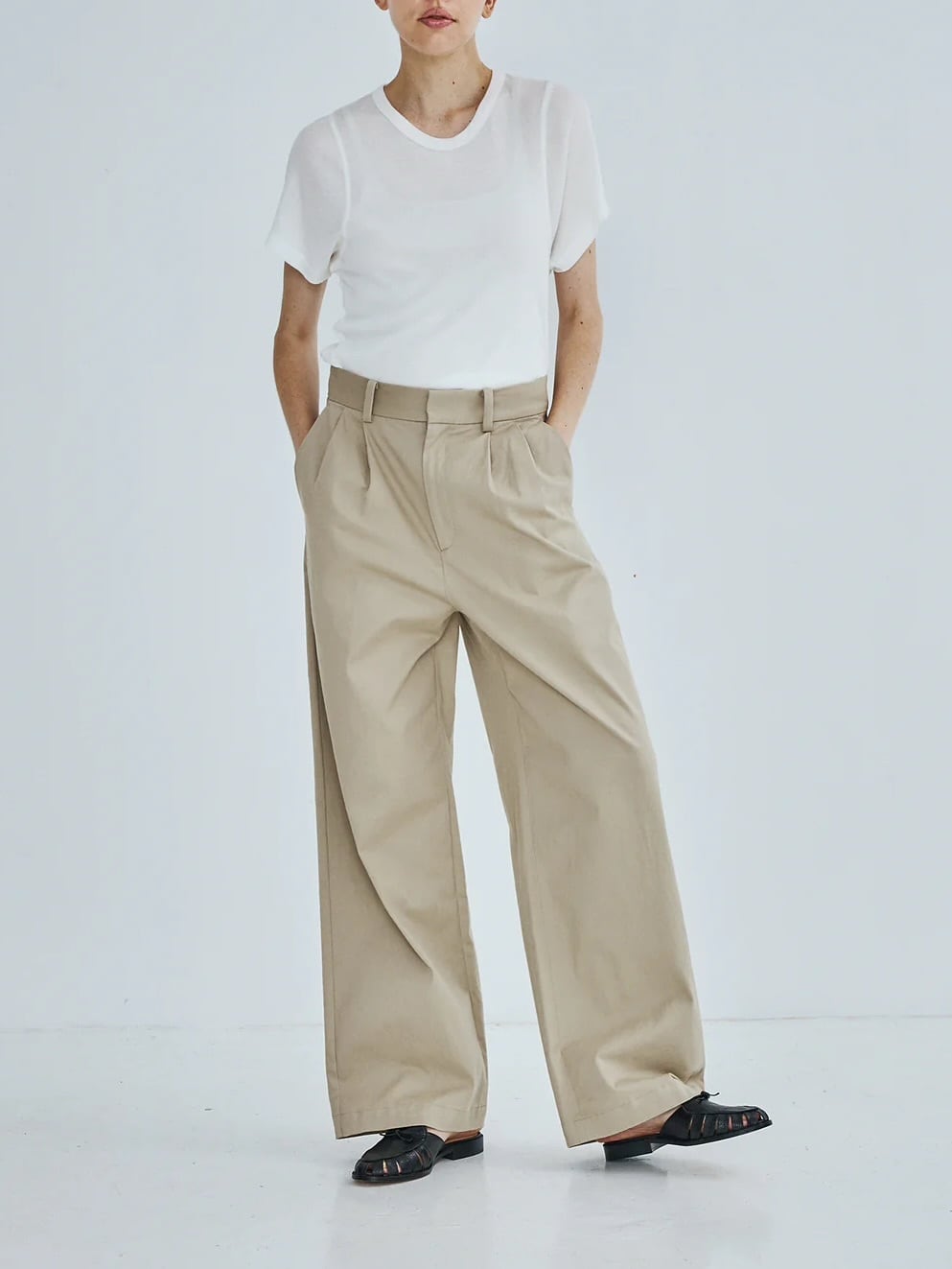 TICCAが長年培ってきた“構築とリラックス”のバランスが息づくトラウザースチノパンツ。クラシックな2タックのディテールと、自然に広がるストレートラインが、上品な脚のシルエットを生み出します。白シャツやボーダーと合わせて軽やかに。テーラードジャケットやシャツワンピースの下に合わせて、知的でモードな印象に。Tシャツをインしてラフに着こなすのはもちろん、ヒールやローファーを合わせてクラシカルにまとめるのもおすすめ。