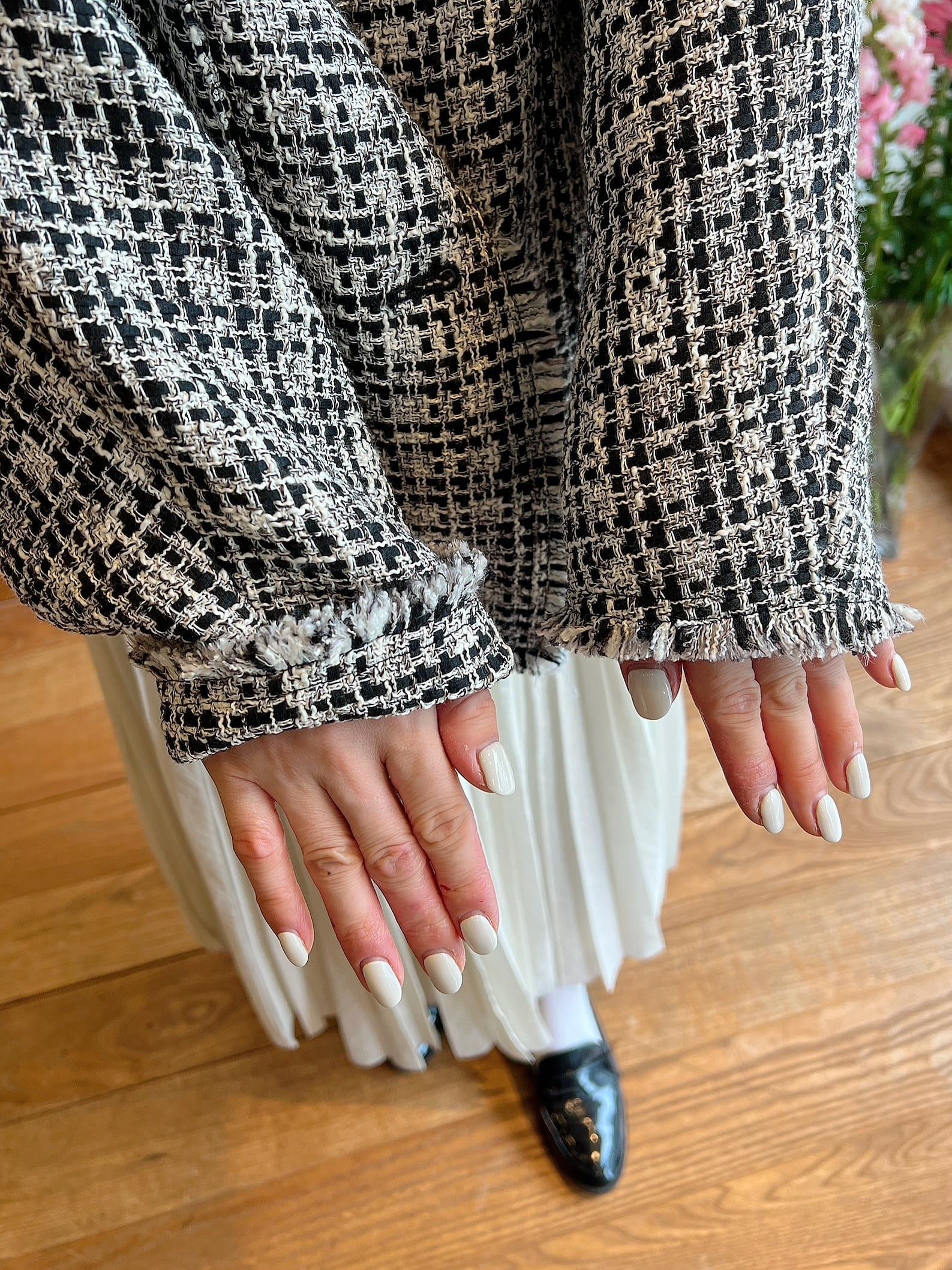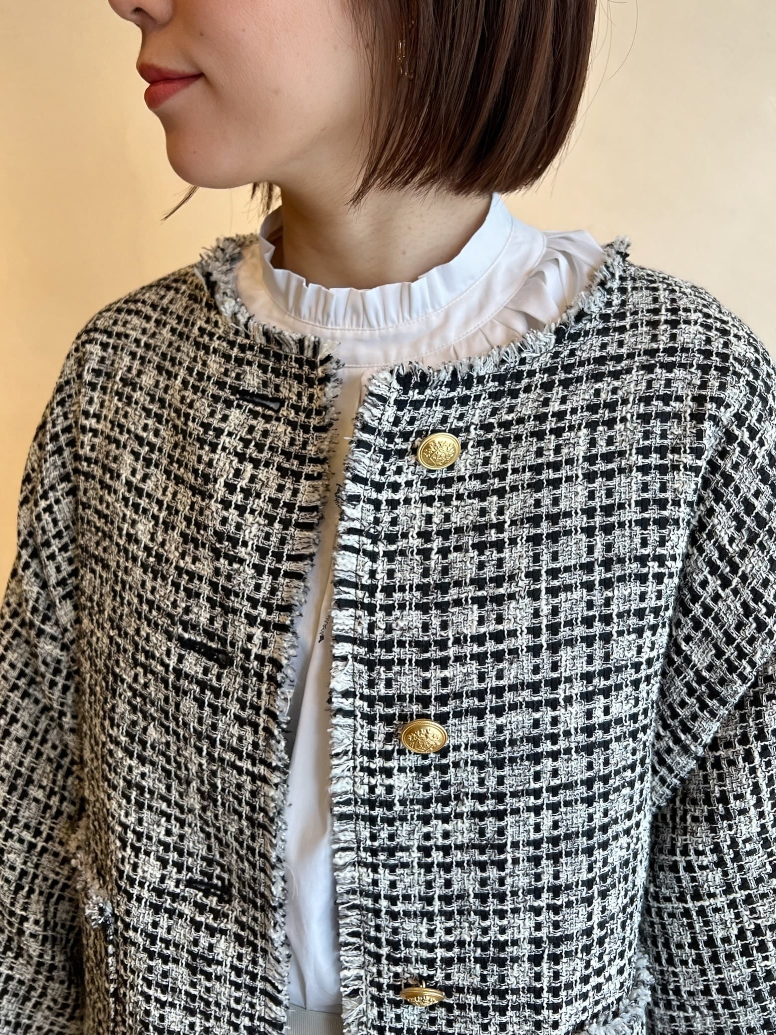 SOLD OUT スタイリッシュなドルマンスリーブが魅力のツイードジャケット。高級感あるツイード素材でこなれた印象を与えつつも、軽やかな着心地が特徴です。ツイードジャケットには珍しいドルマンスリーブがお袖にデザインの入ったブラウスやカットソー等にも羽織りやすくまた程よい抜け感を出してくれます。裏地付きなのも嬉しいポイント♪ジャケットの袖口や裾のデザインに施されたフリンジがさりげないアクセントです。オケージョンシーンや、OFFスタイルでデニム合わせでも幅広くお使い頂けます。