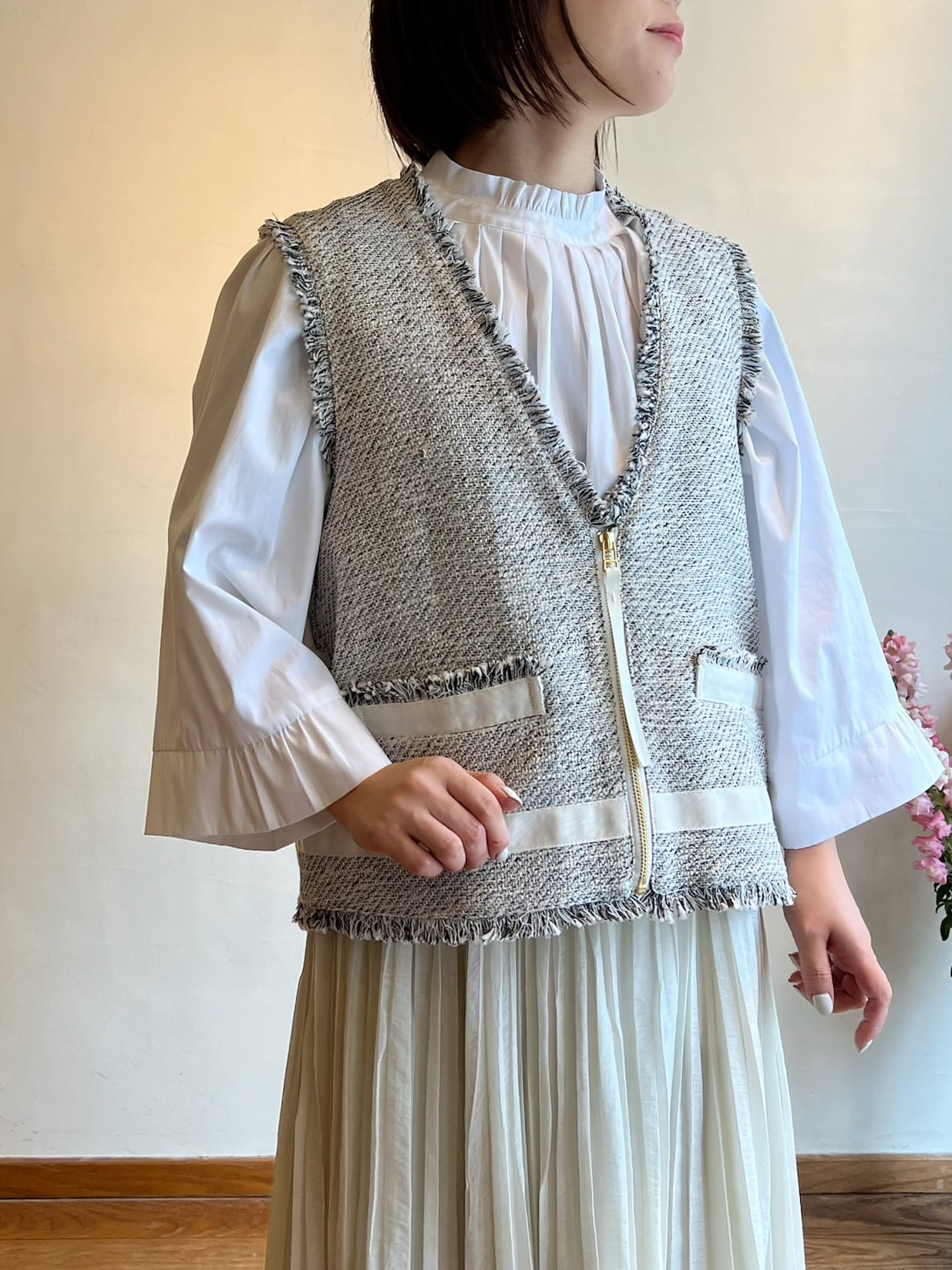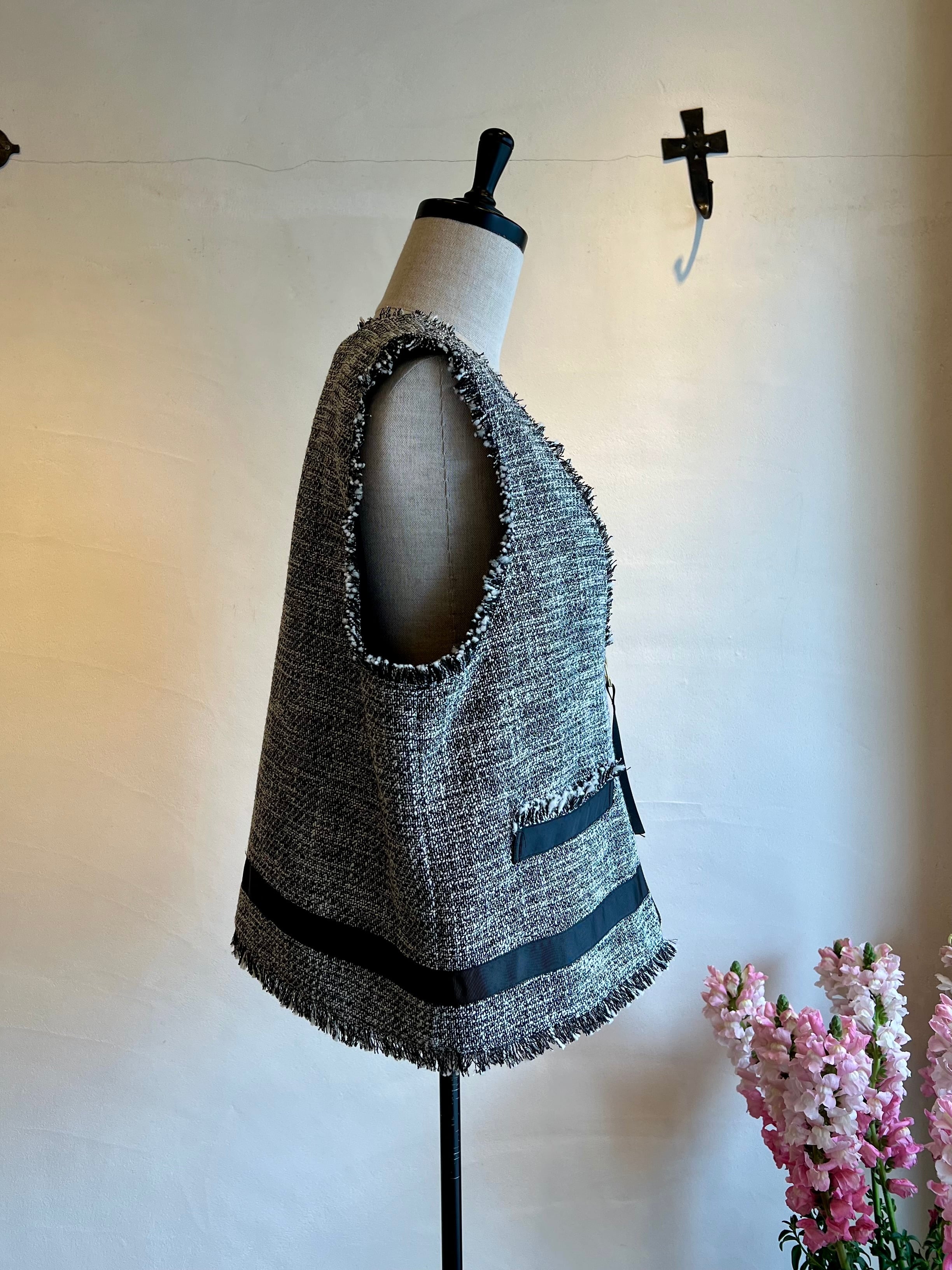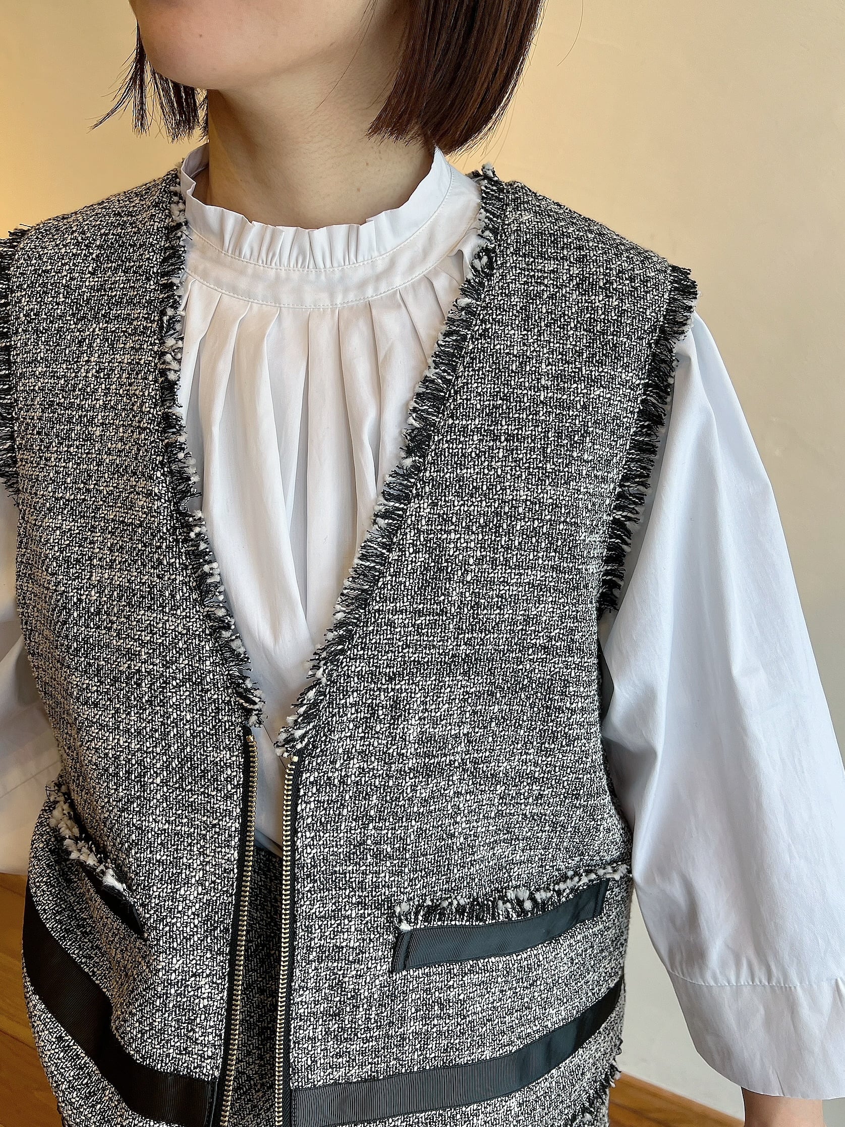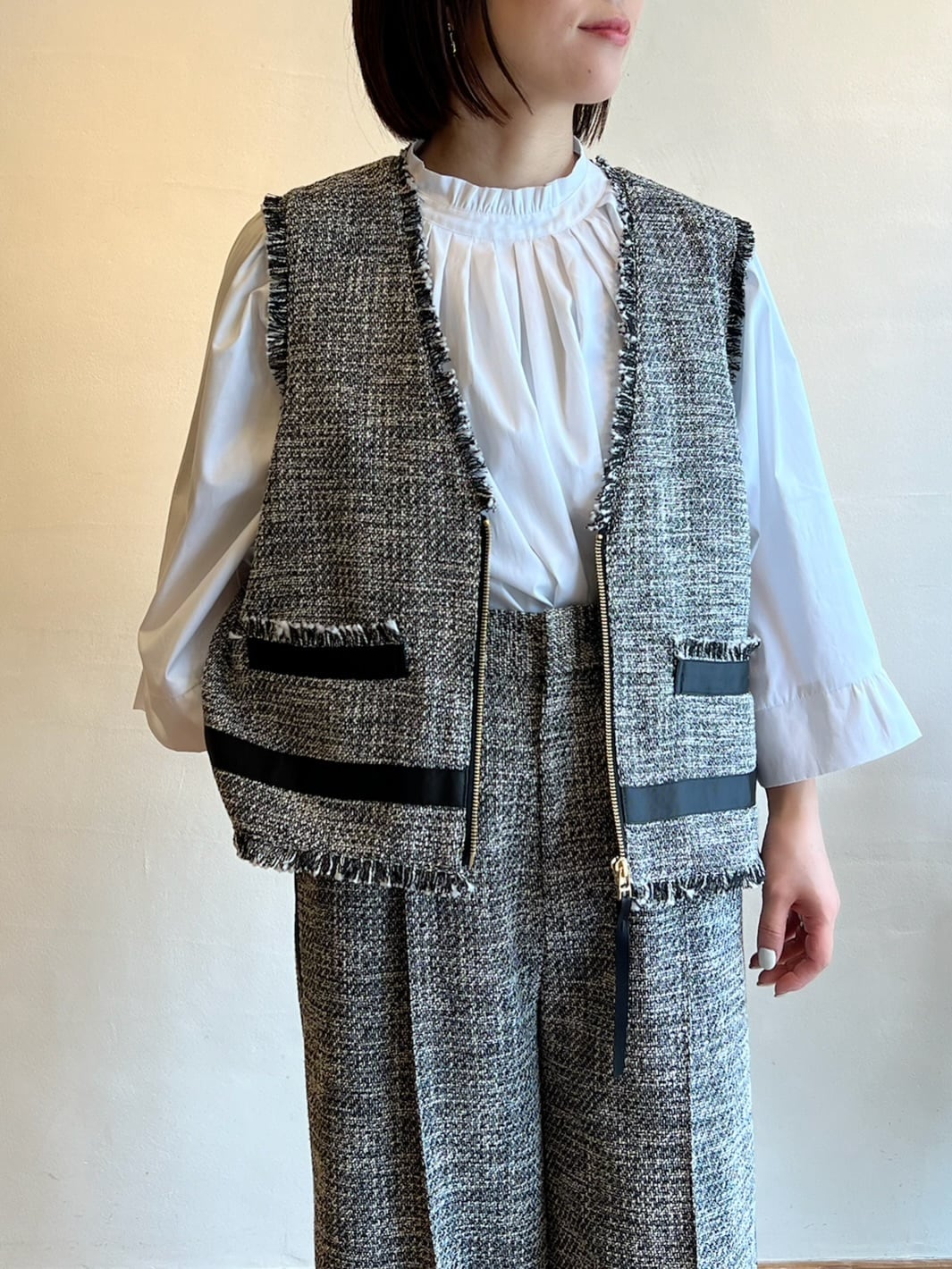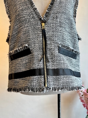 上品さと抜け感を両立する、ツイードジレ。表情豊かなモノトーンツイードに、フリンジディテールをあしらった存在感のある一枚。フロントのジップが程よいアクセントになり、きちんと感の中にモードな雰囲気をプラスします。裾やポケット部分に施したグログランテープが全体を引き締め、コーディネートを洗練された印象に。
