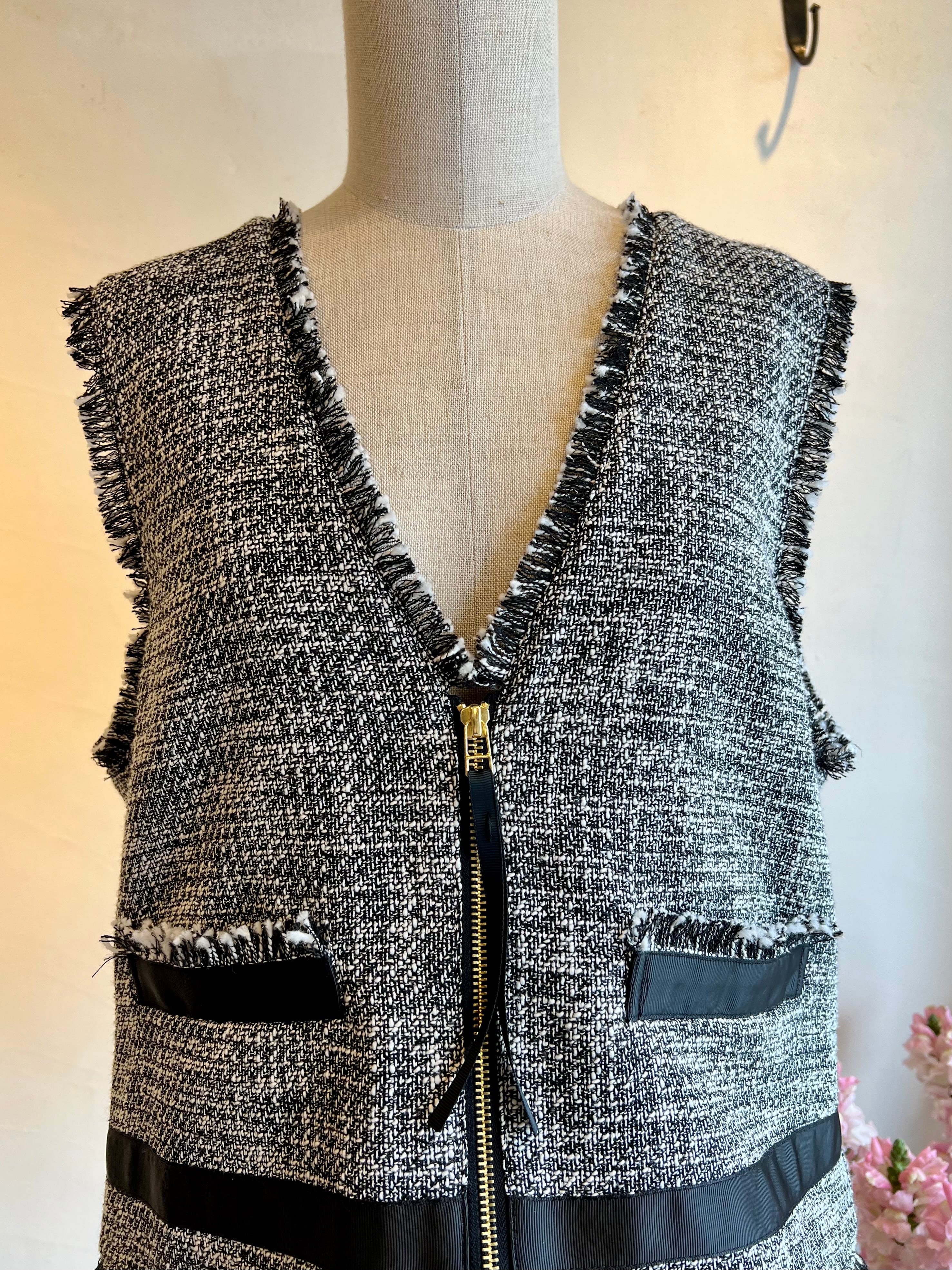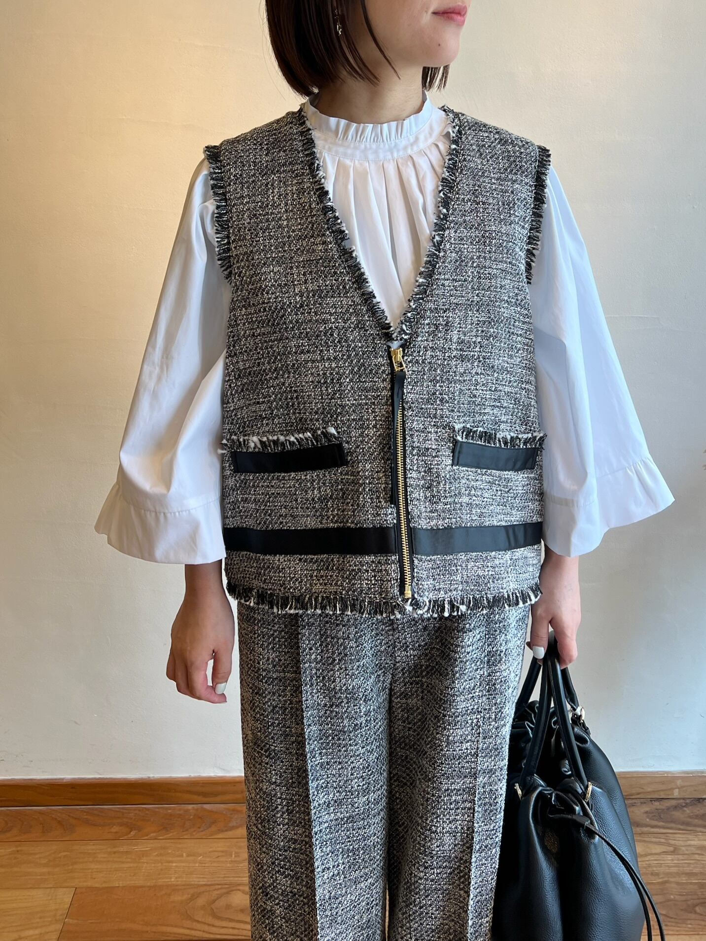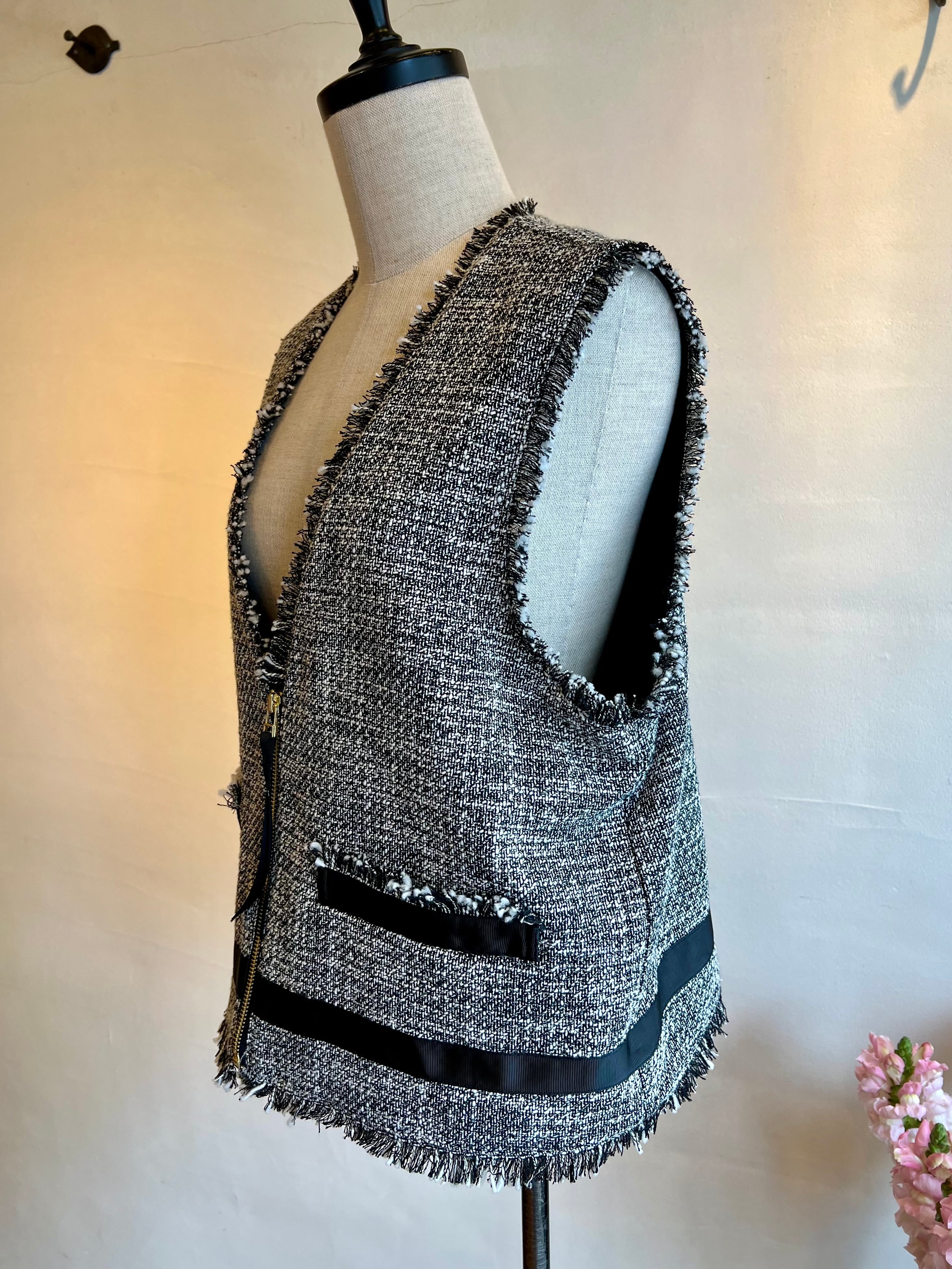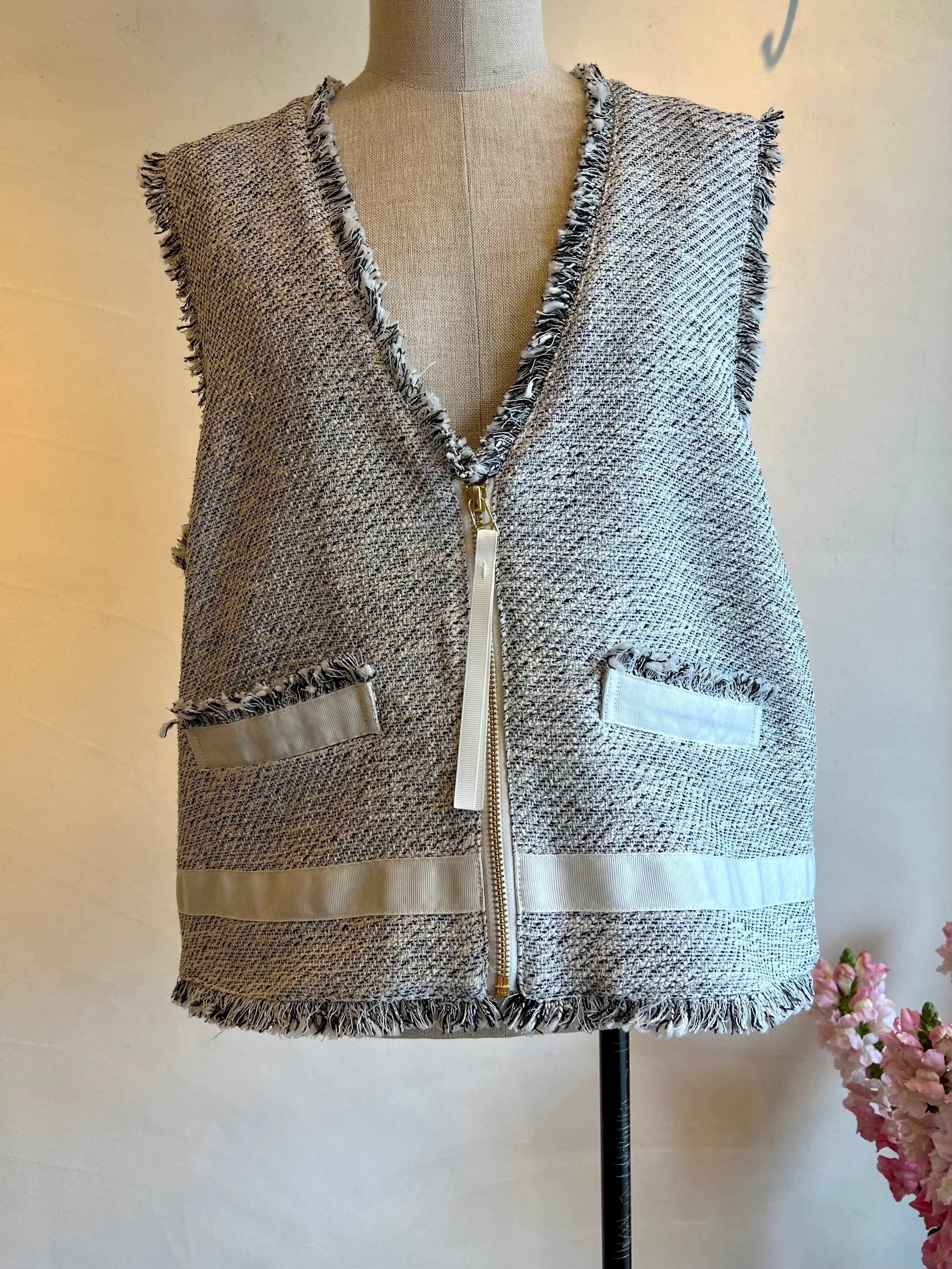 上品さと抜け感を両立する、ツイードジレ。表情豊かなモノトーンツイードに、フリンジディテールをあしらった存在感のある一枚。フロントのジップが程よいアクセントになり、きちんと感の中にモードな雰囲気をプラスします。裾やポケット部分に施したグログランテープが全体を引き締め、コーディネートを洗練された印象に。