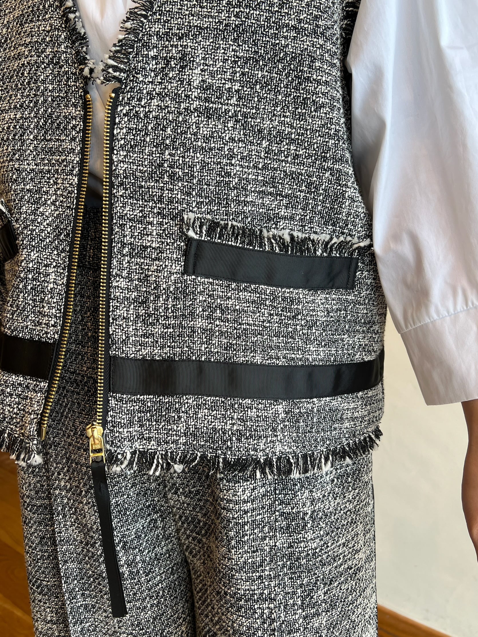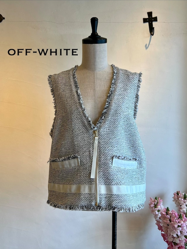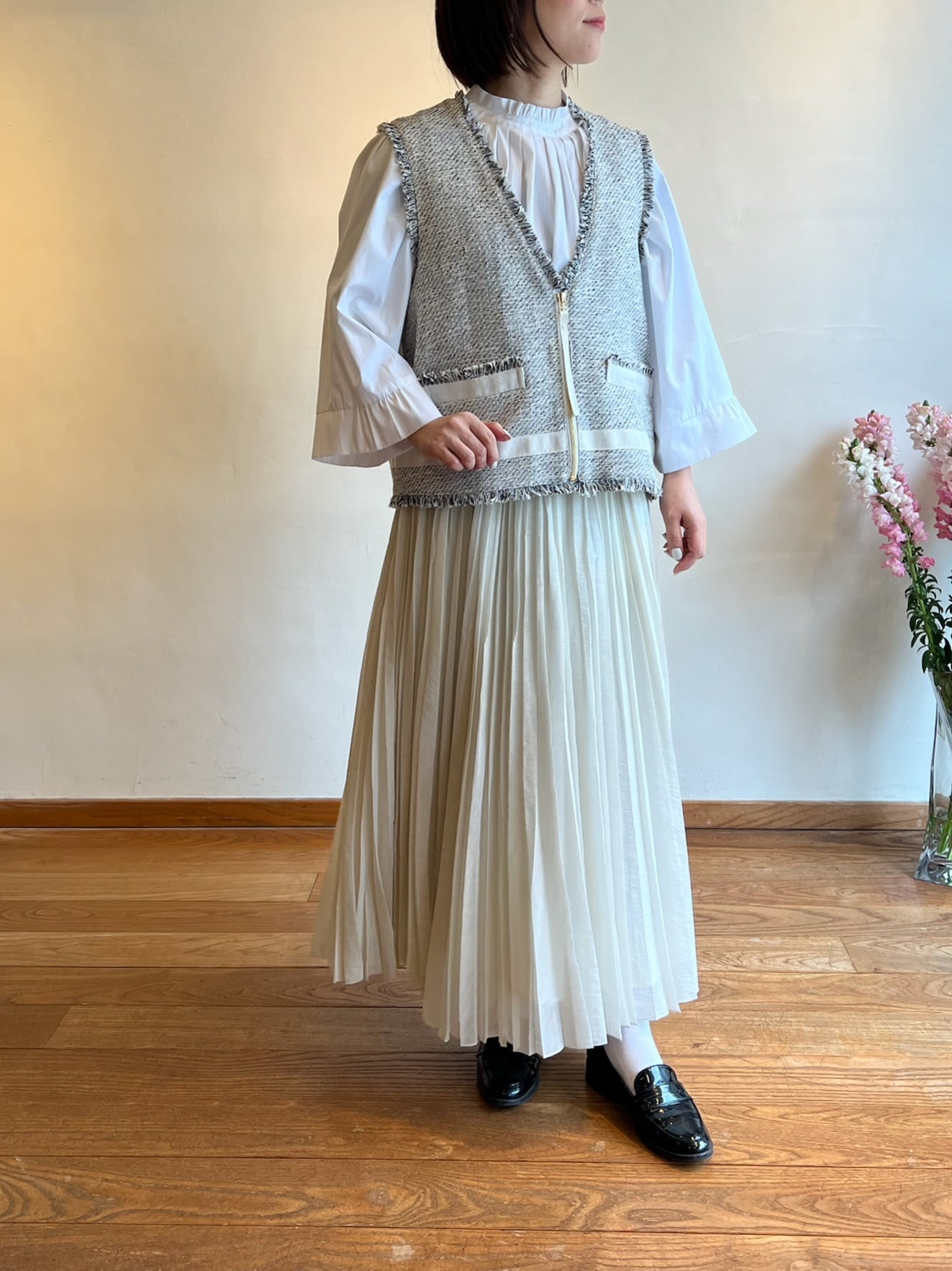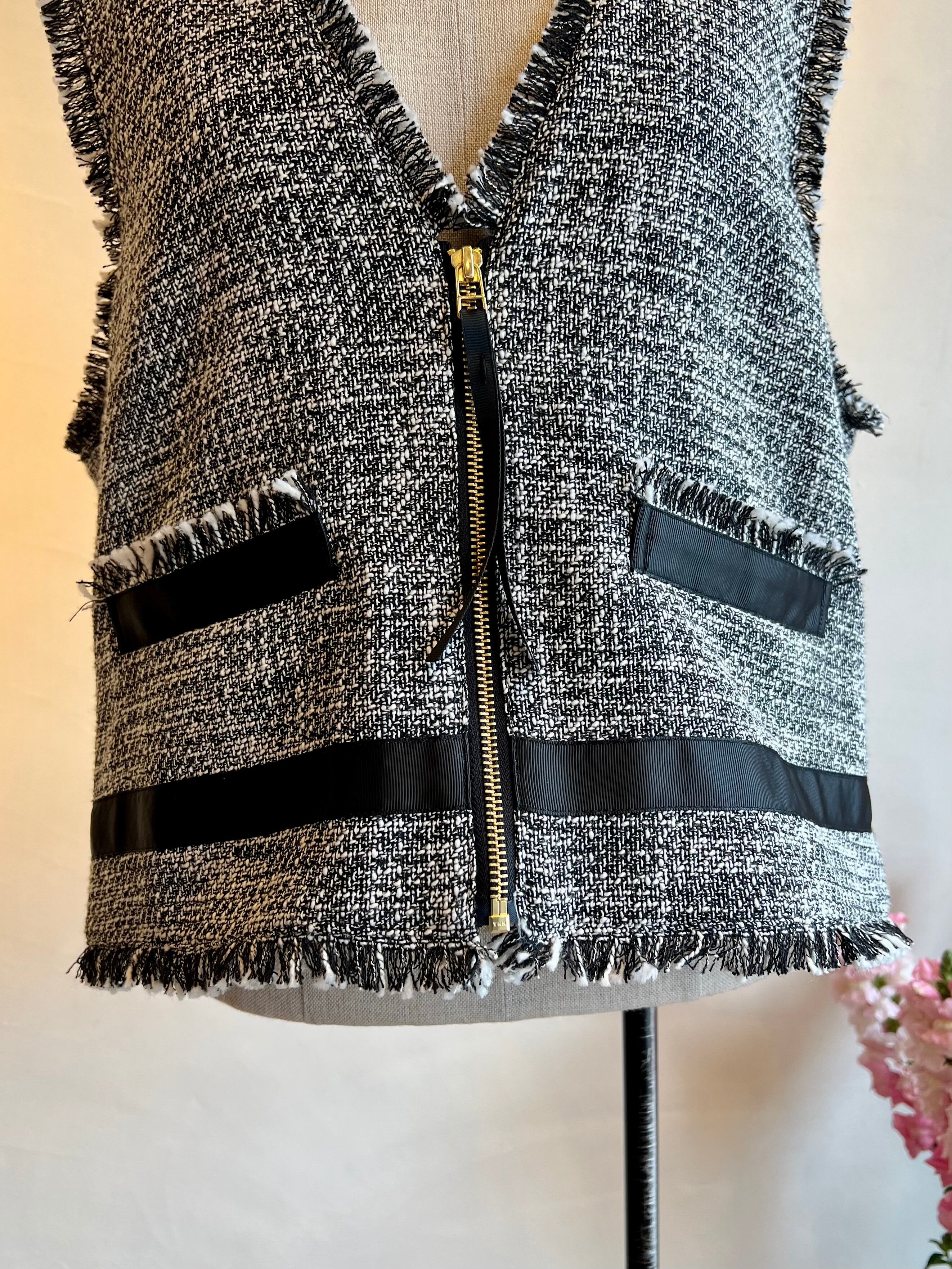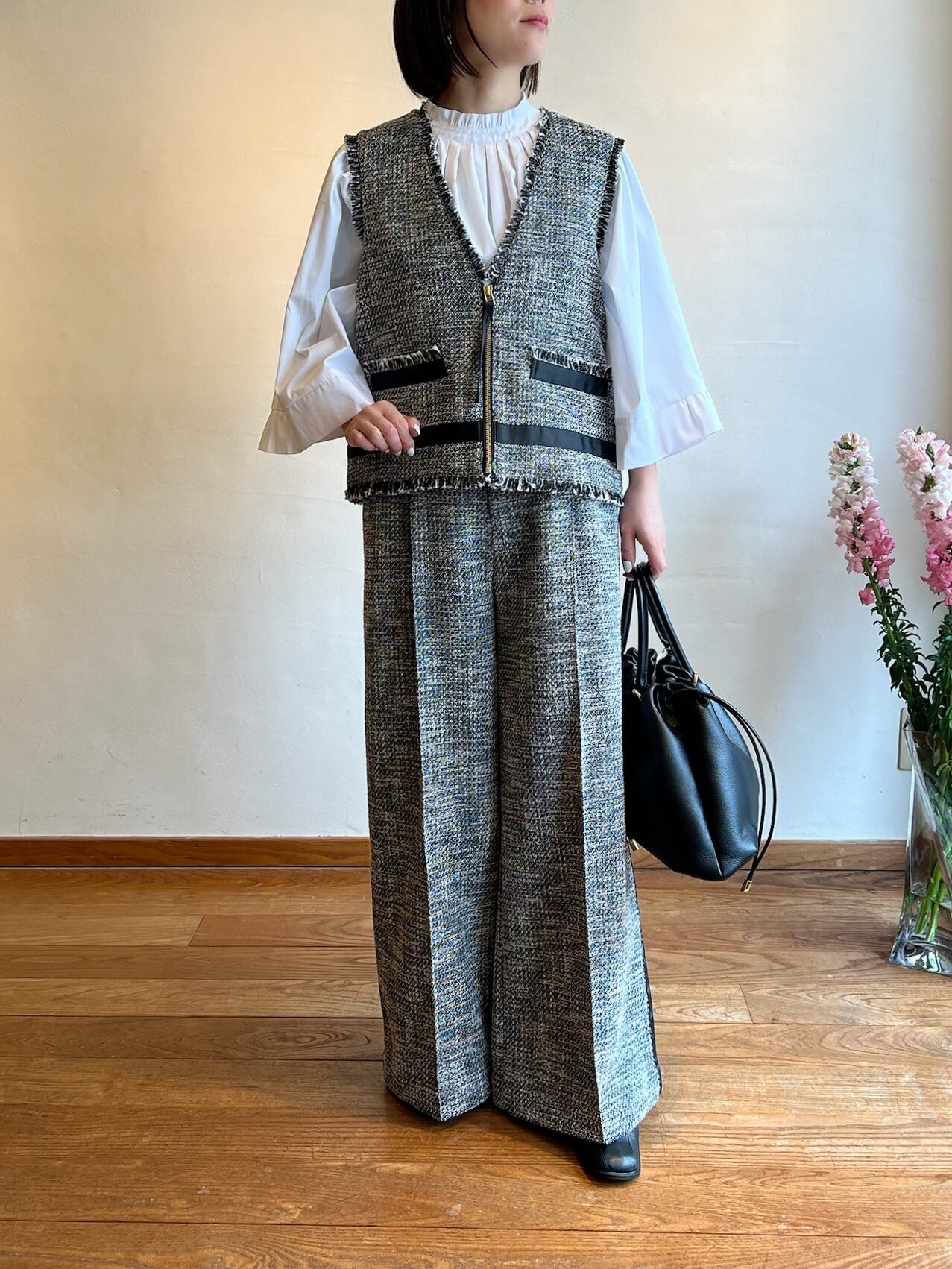 上品さと抜け感を両立する、ツイードジレ。表情豊かなモノトーンツイードに、フリンジディテールをあしらった存在感のある一枚。フロントのジップが程よいアクセントになり、きちんと感の中にモードな雰囲気をプラスします。裾やポケット部分に施したグログランテープが全体を引き締め、コーディネートを洗練された印象に。