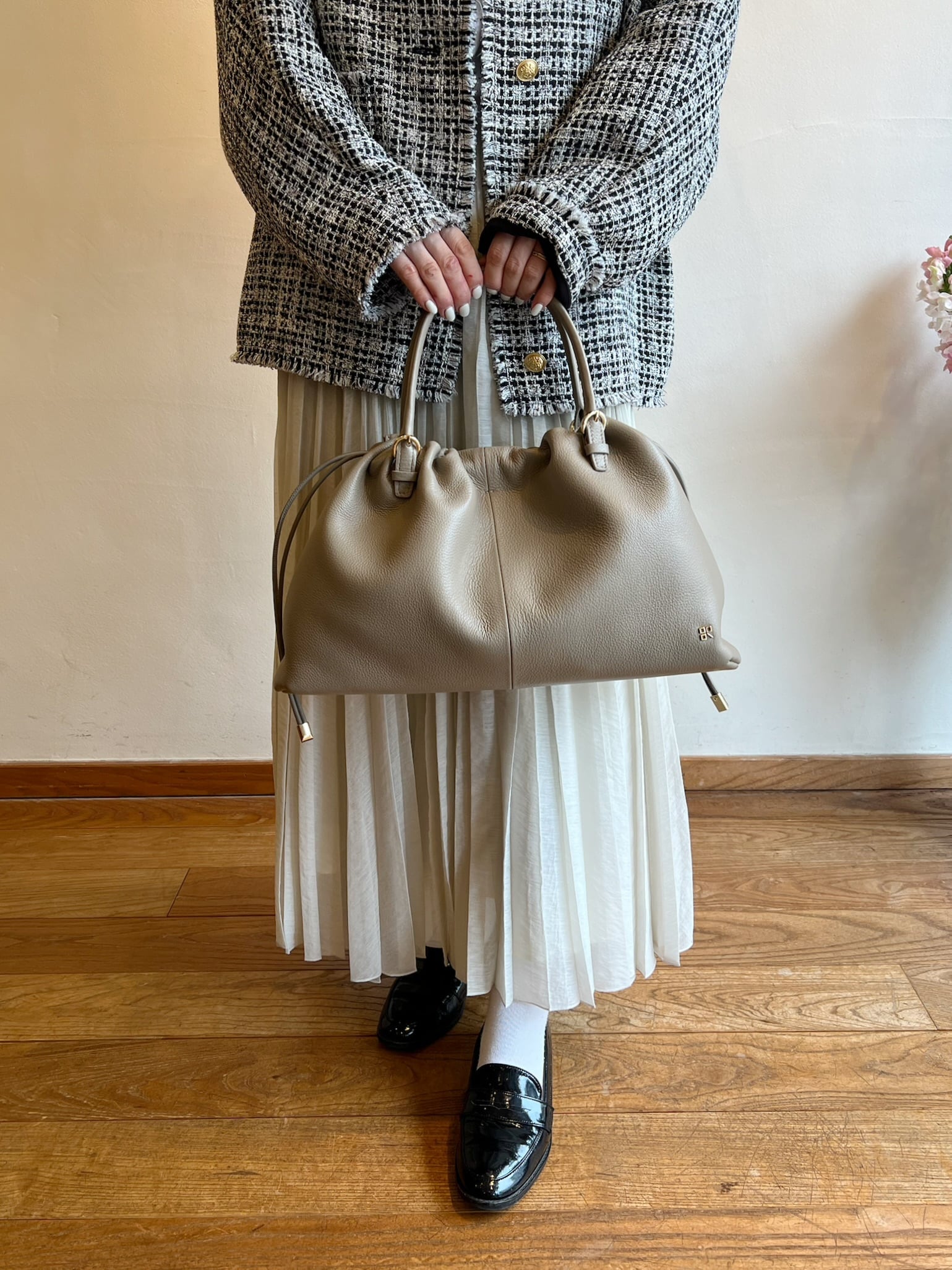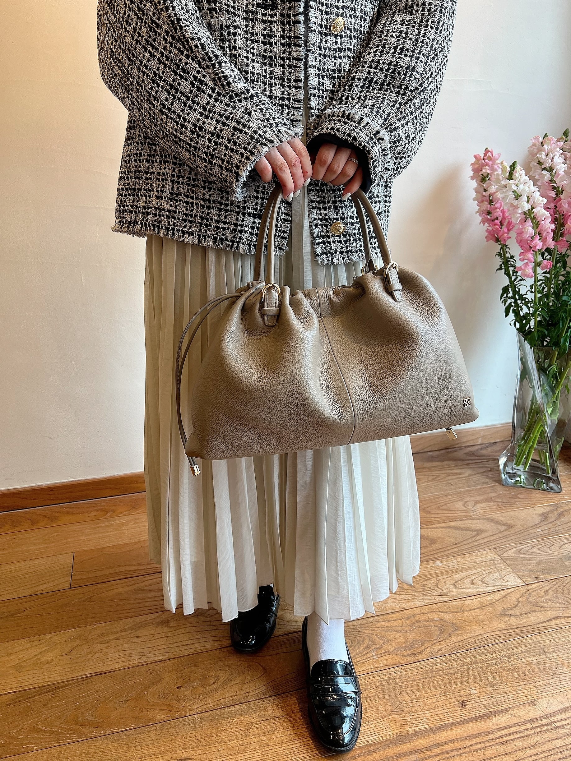 トレンド感のある横長シルエットのドローストリングトート。開口部にマグネットをつけているので巾着を絞らずスクエアフォルムでも持つことが可能です。手持ちハンドルと肩掛けできるロングハンドルがセットになっていて、スタイリングやお荷物に合わせて付け替えできる2way仕様。柔らかく自然なシボ感のカウシュリンクレザーは傷の目立ちにくさもポイント。A4ファイルも収納可能なサイズでお仕事バッグとしてもおすすめ。シンプルなデザインなのでスカーフやストラップをつけて自分好みのスタイルにアレンジを楽しむのも。