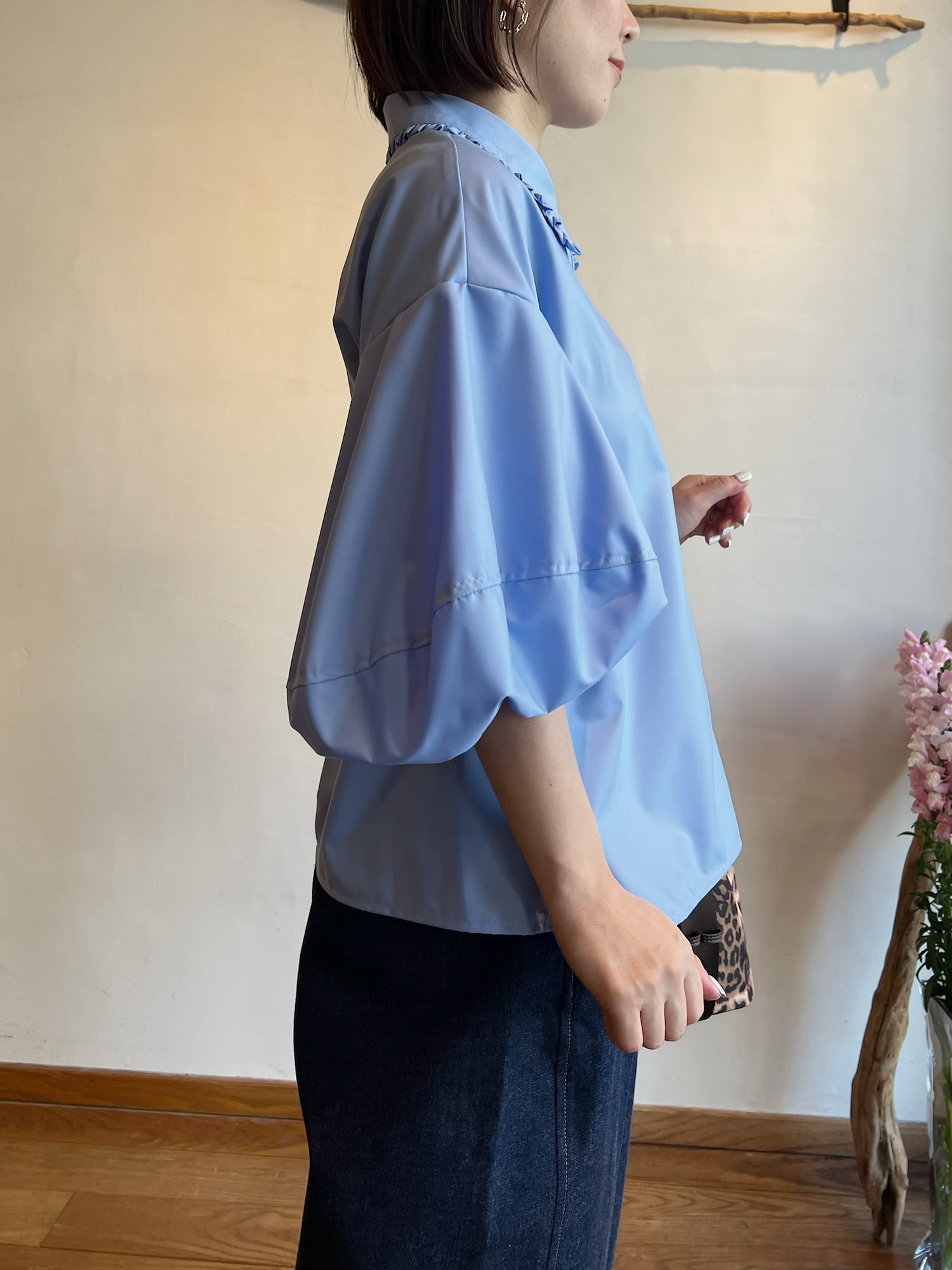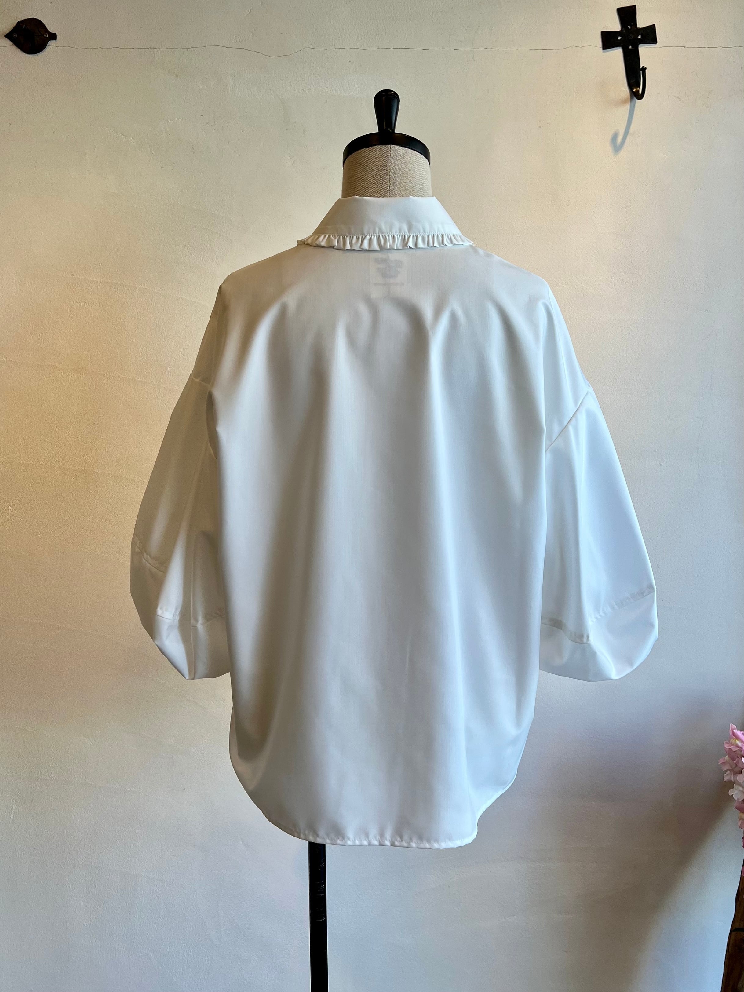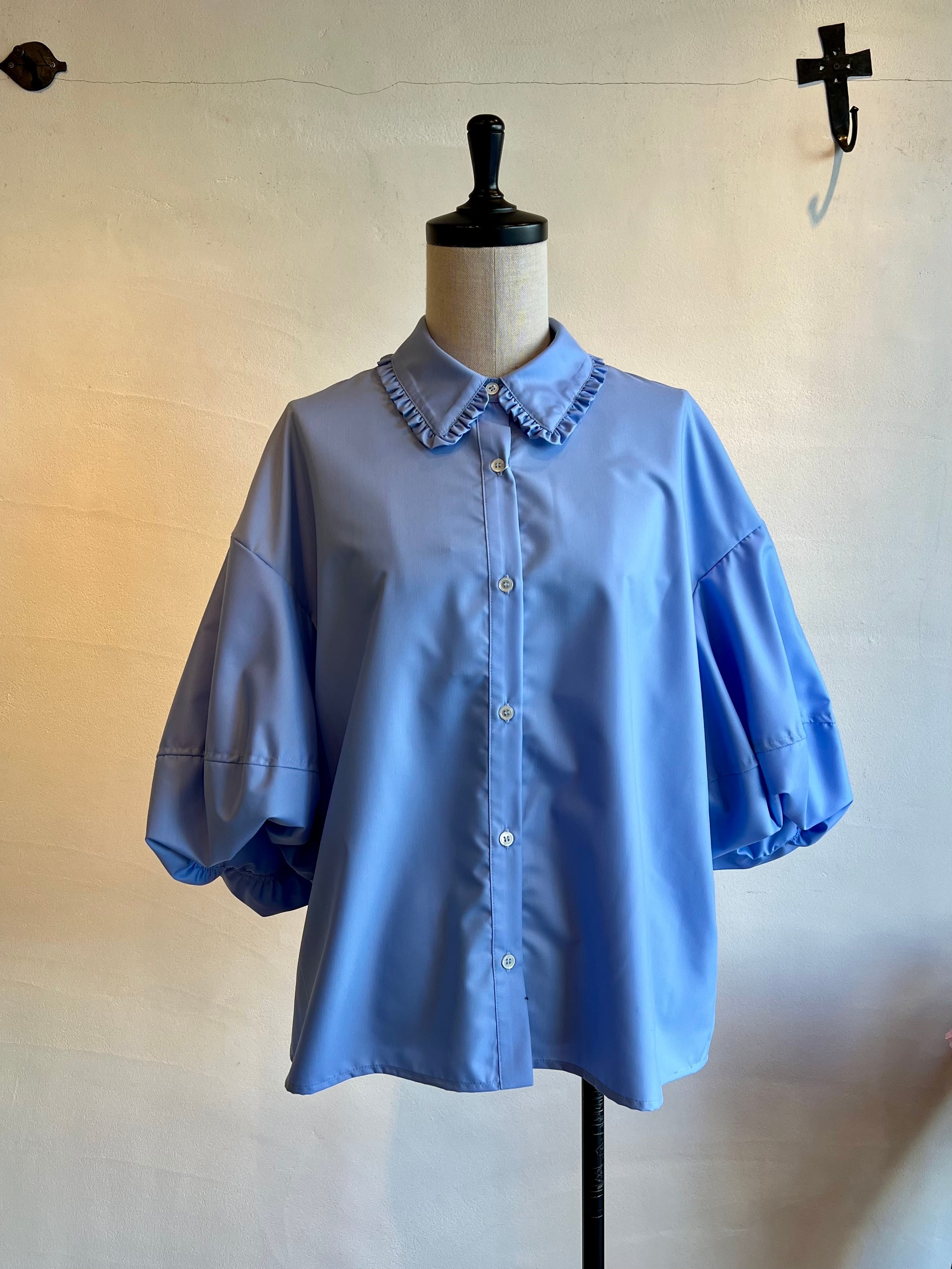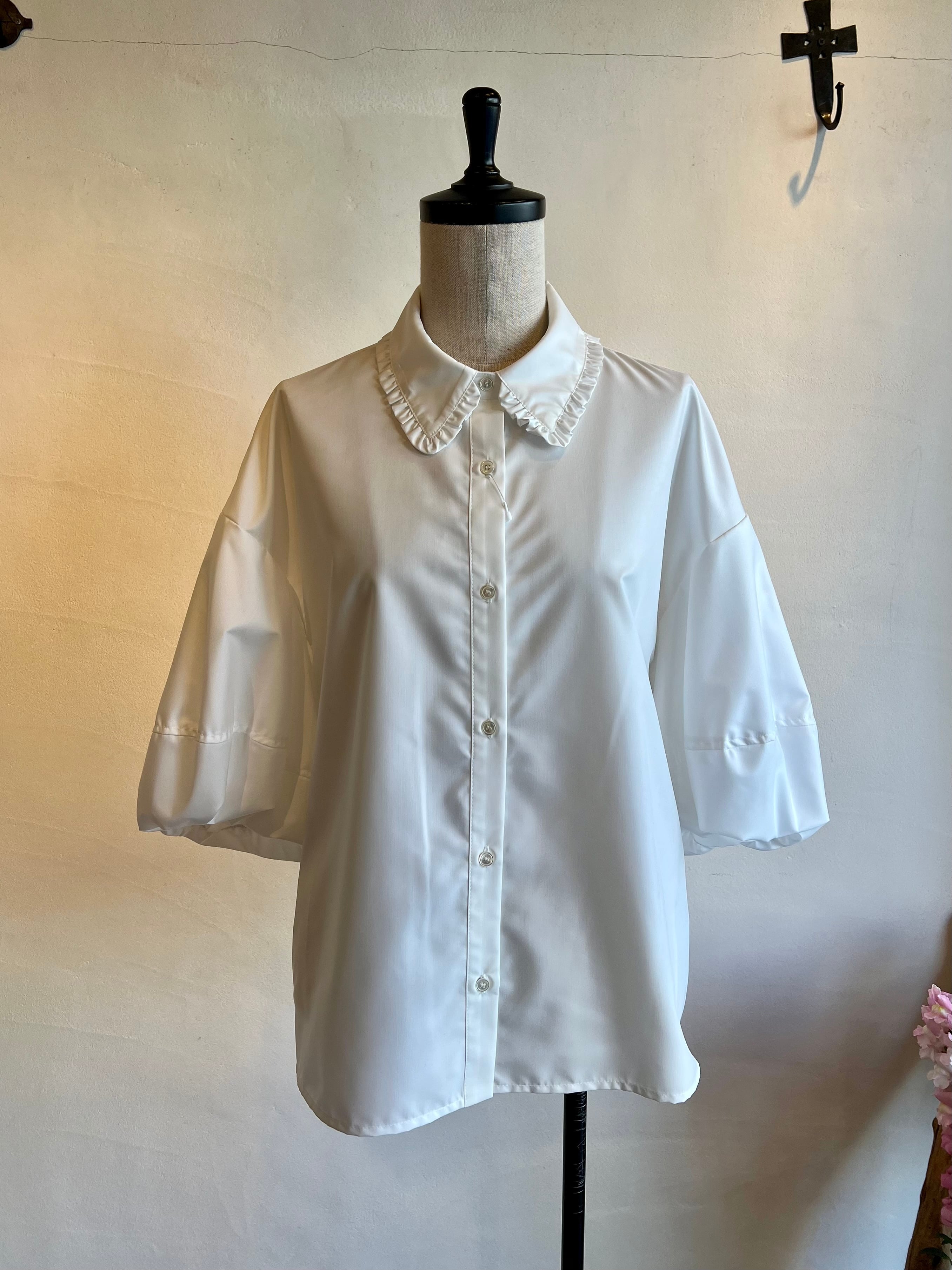 長めの袖丈で柔らかなシルエットが魅力です。ふわっとしたバルーンのお袖に襟に施されたさりげないフリルが女性らしく上品さをプラスしてくれます。ポリエステル100%のつやっとした質感でカジュアルにもフォーマルにも幅広くお使い頂けます。カジュアルにデニム合わせでもキレイめボトムでも相性◎