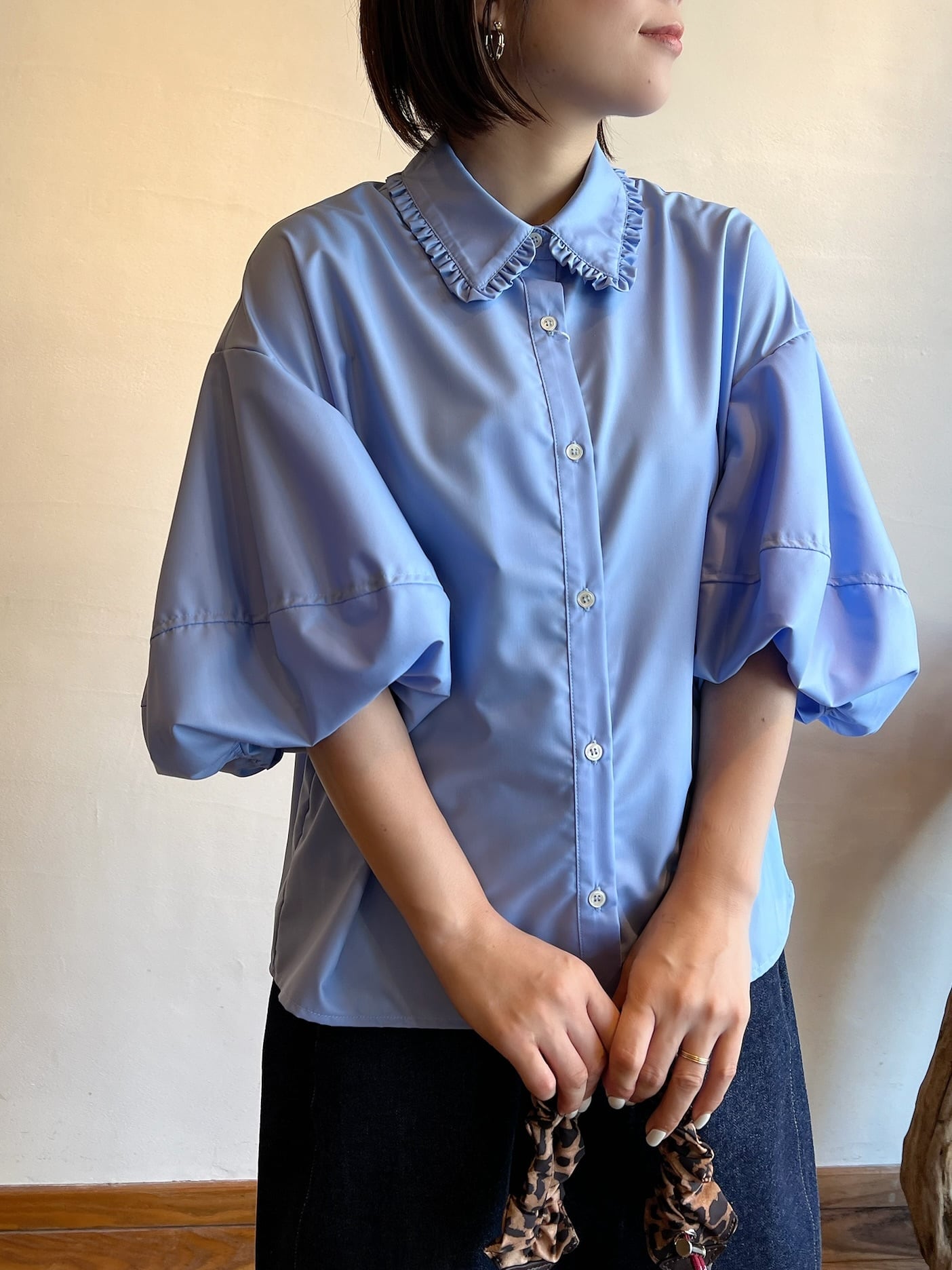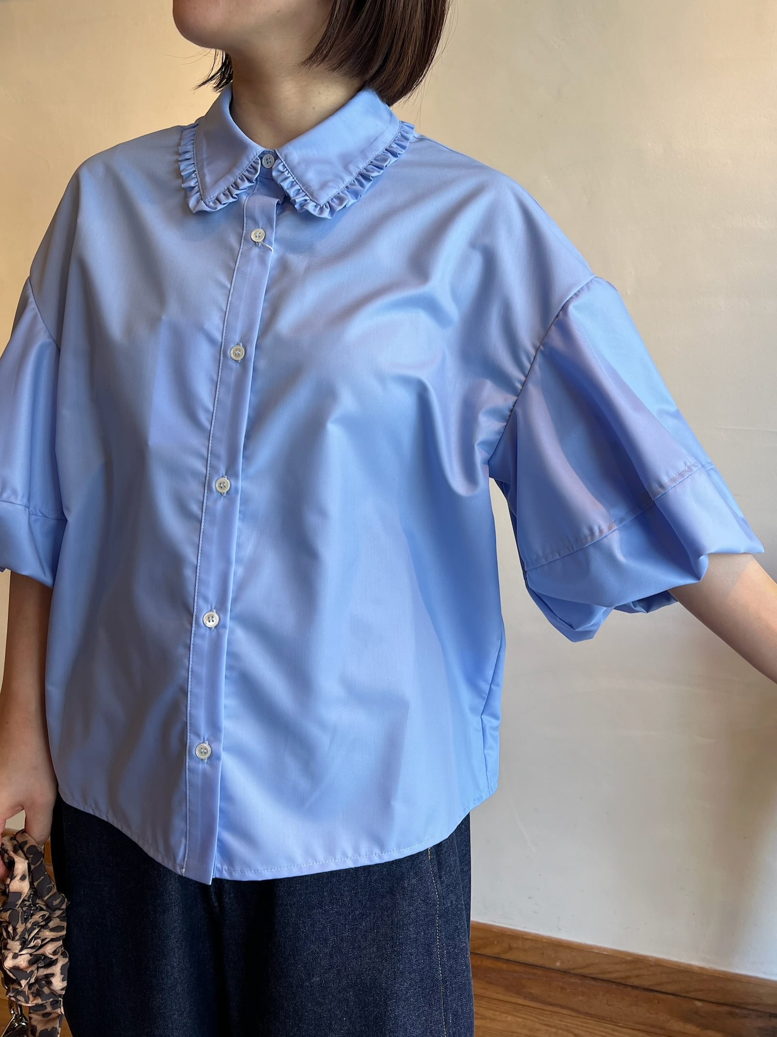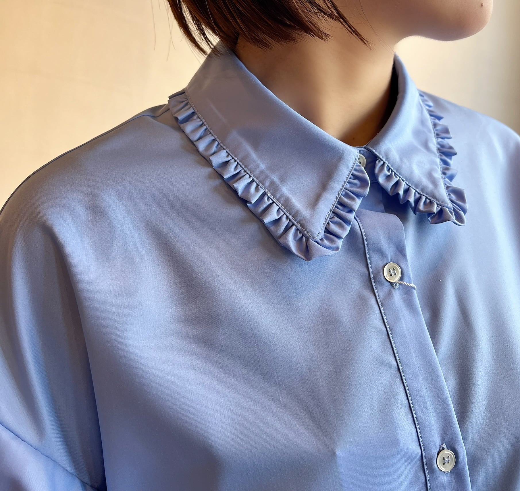 長めの袖丈で柔らかなシルエットが魅力です。ふわっとしたバルーンのお袖に襟に施されたさりげないフリルが女性らしく上品さをプラスしてくれます。ポリエステル100%のつやっとした質感でカジュアルにもフォーマルにも幅広くお使い頂けます。カジュアルにデニム合わせでもキレイめボトムでも相性◎