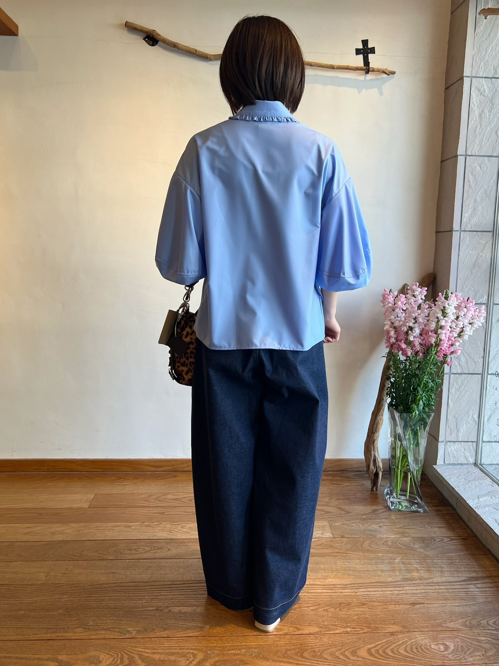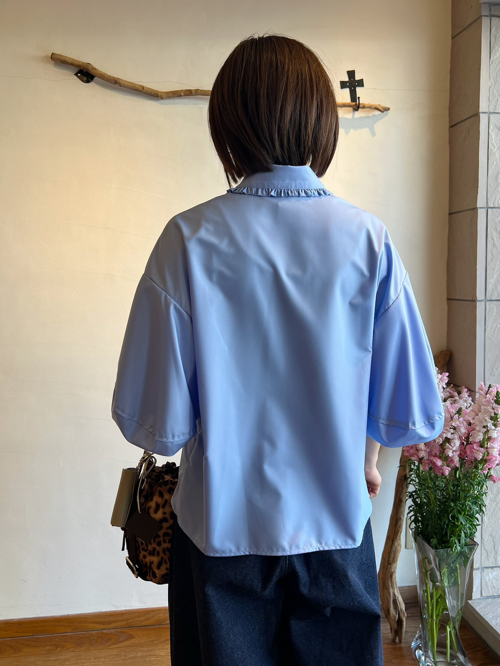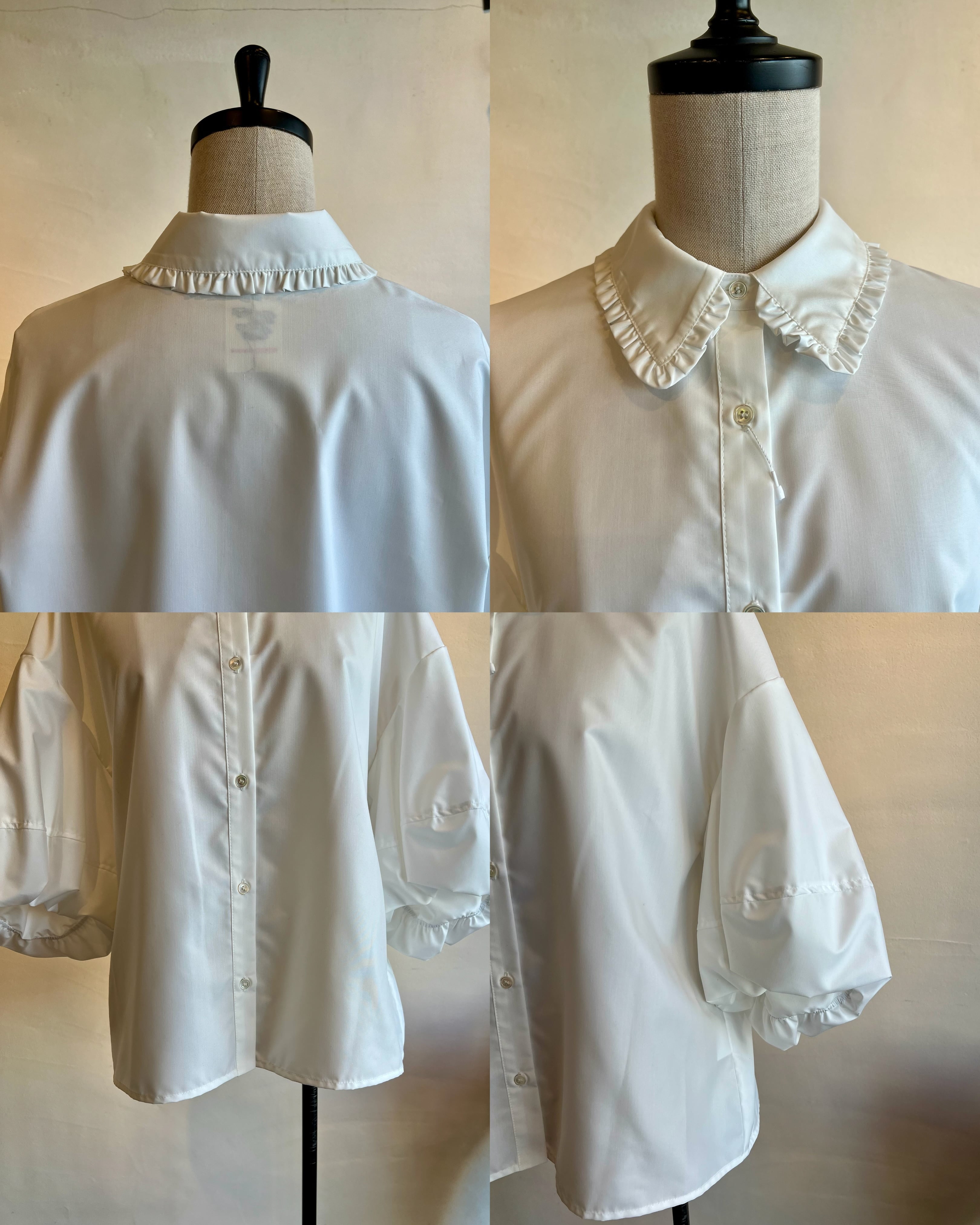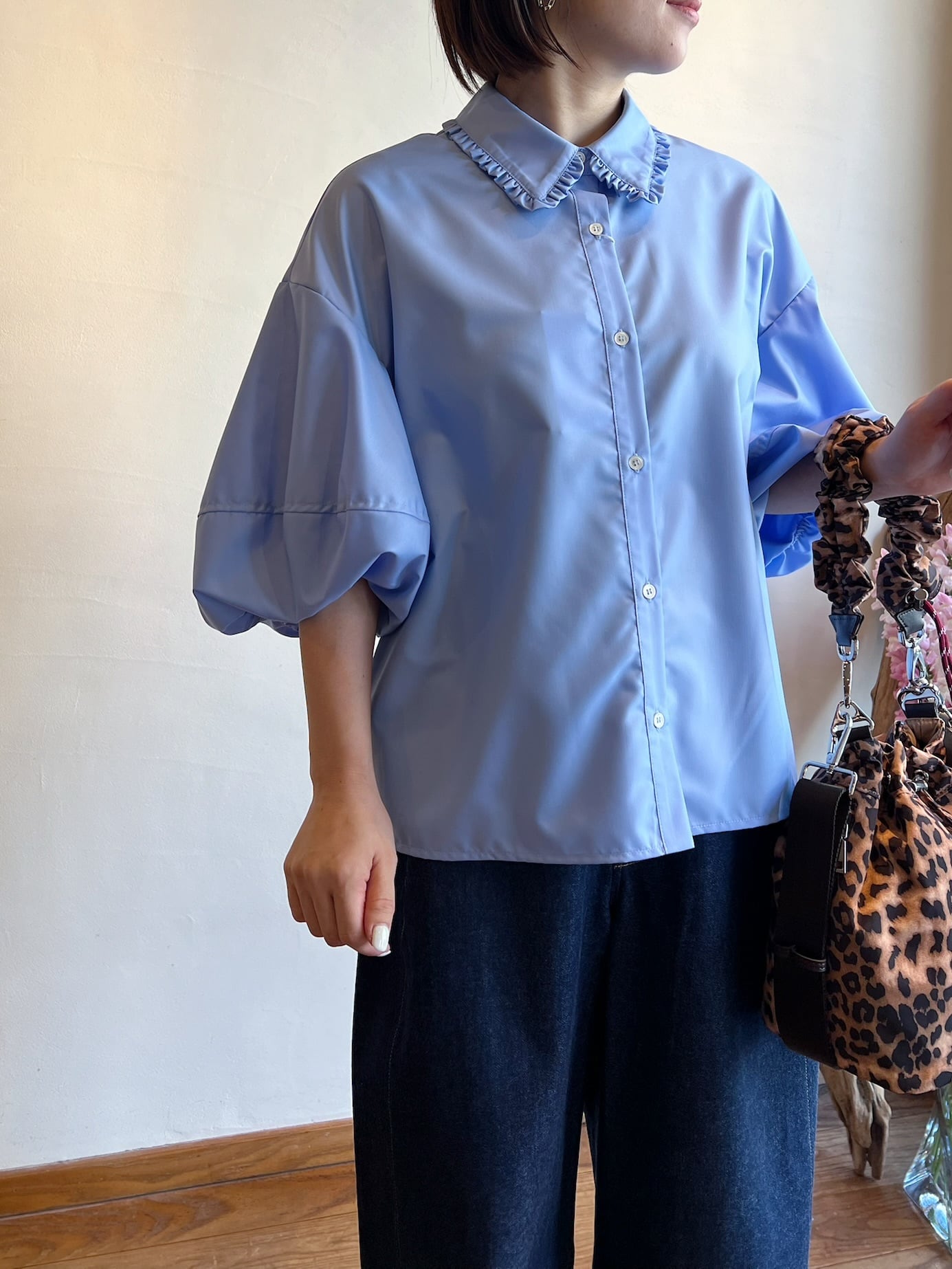 長めの袖丈で柔らかなシルエットが魅力です。ふわっとしたバルーンのお袖に襟に施されたさりげないフリルが女性らしく上品さをプラスしてくれます。ポリエステル100%のつやっとした質感でカジュアルにもフォーマルにも幅広くお使い頂けます。カジュアルにデニム合わせでもキレイめボトムでも相性◎