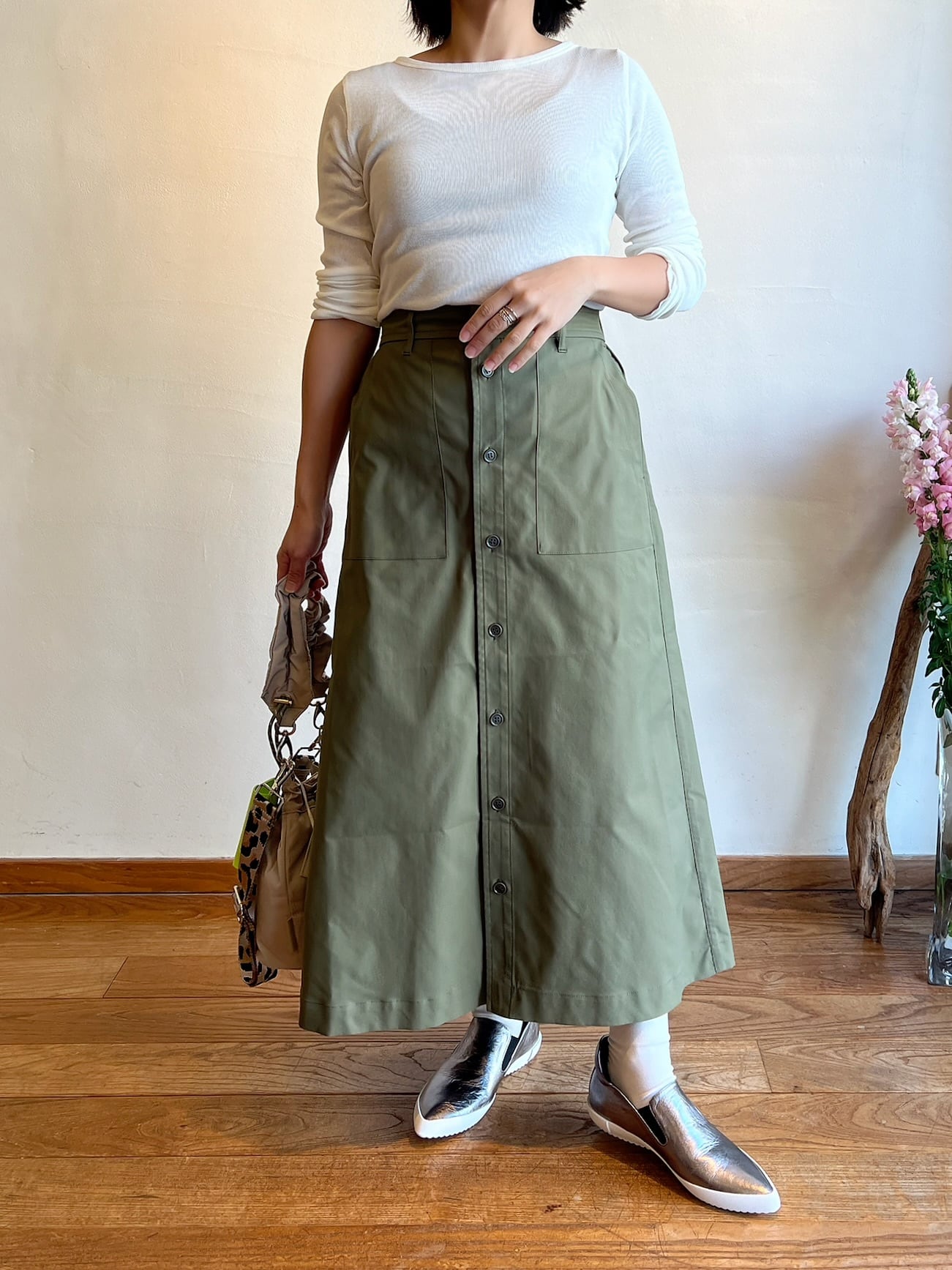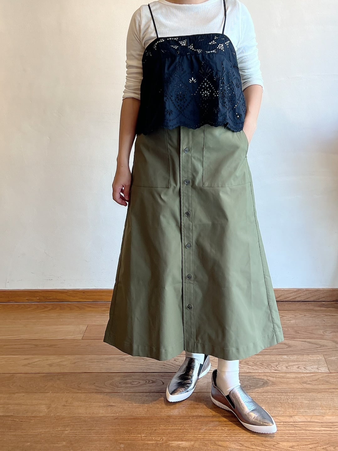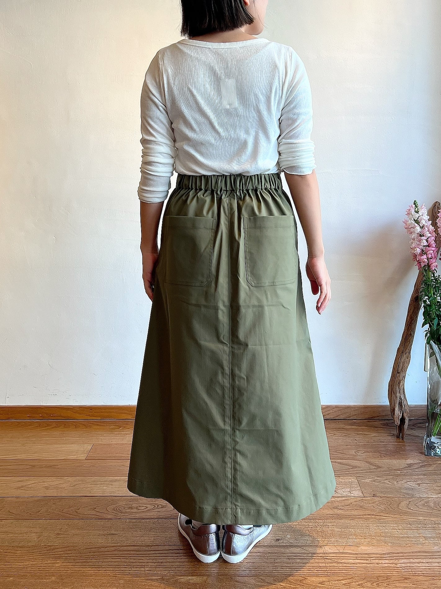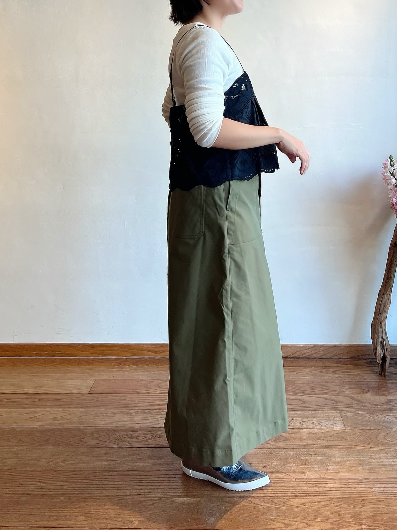 ハイテクストレッチの天然ライクなPEツイルを使用したAラインスカート。高品質な素材感は、カジュアルながらも上品な印象を与え、日常のスタイリングを格上げしてくれます.デザインは人気のベイカーズパンツのエッセンスを使ったカジュアルで使いやすいAラインスカート。