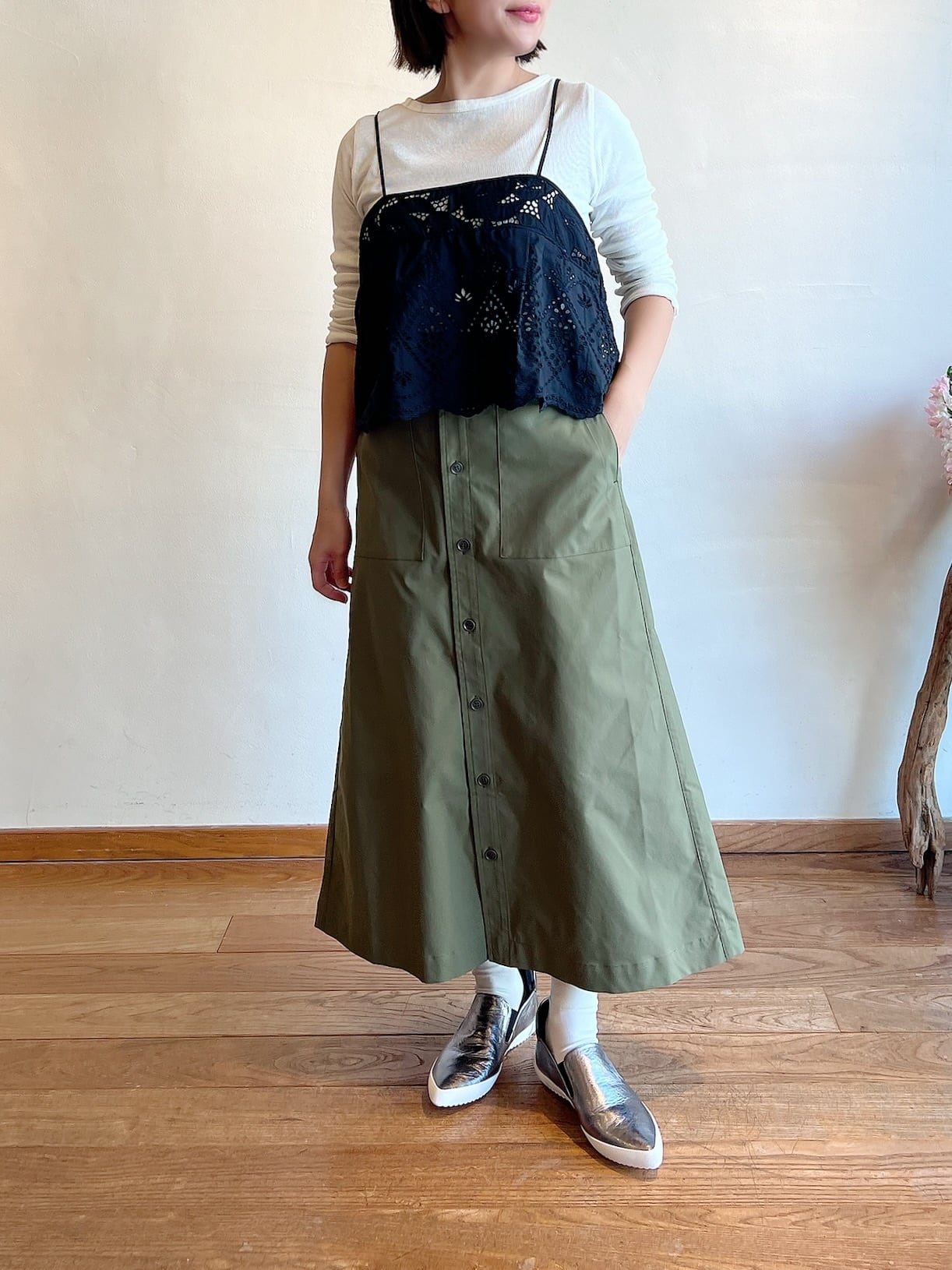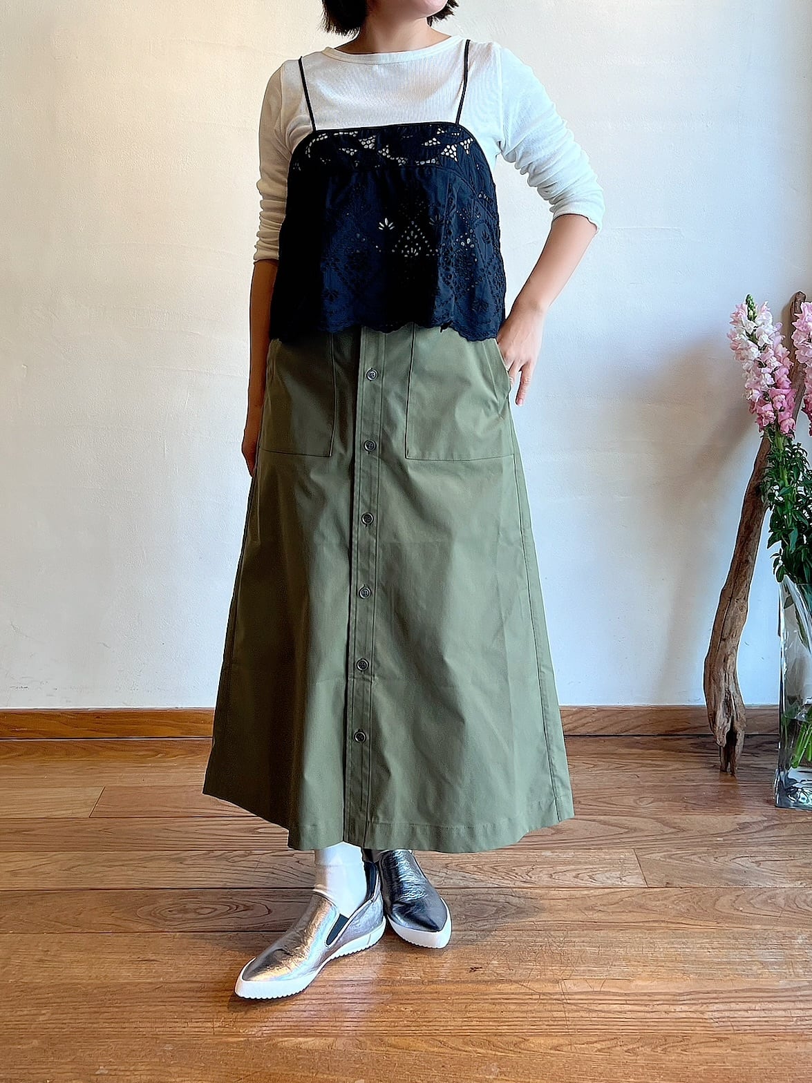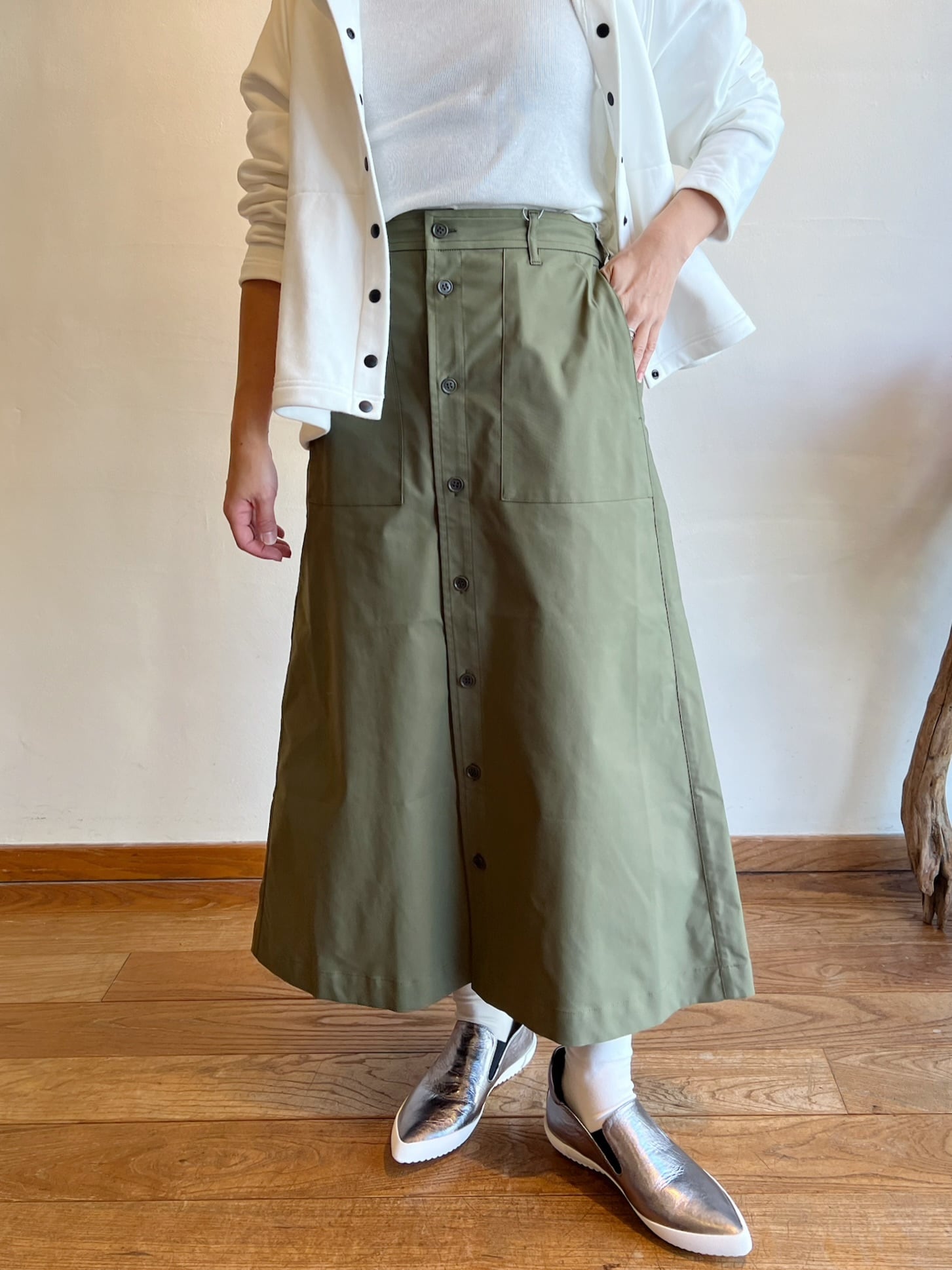 ハイテクストレッチの天然ライクなPEツイルを使用したAラインスカート。高品質な素材感は、カジュアルながらも上品な印象を与え、日常のスタイリングを格上げしてくれます.デザインは人気のベイカーズパンツのエッセンスを使ったカジュアルで使いやすいAラインスカート。