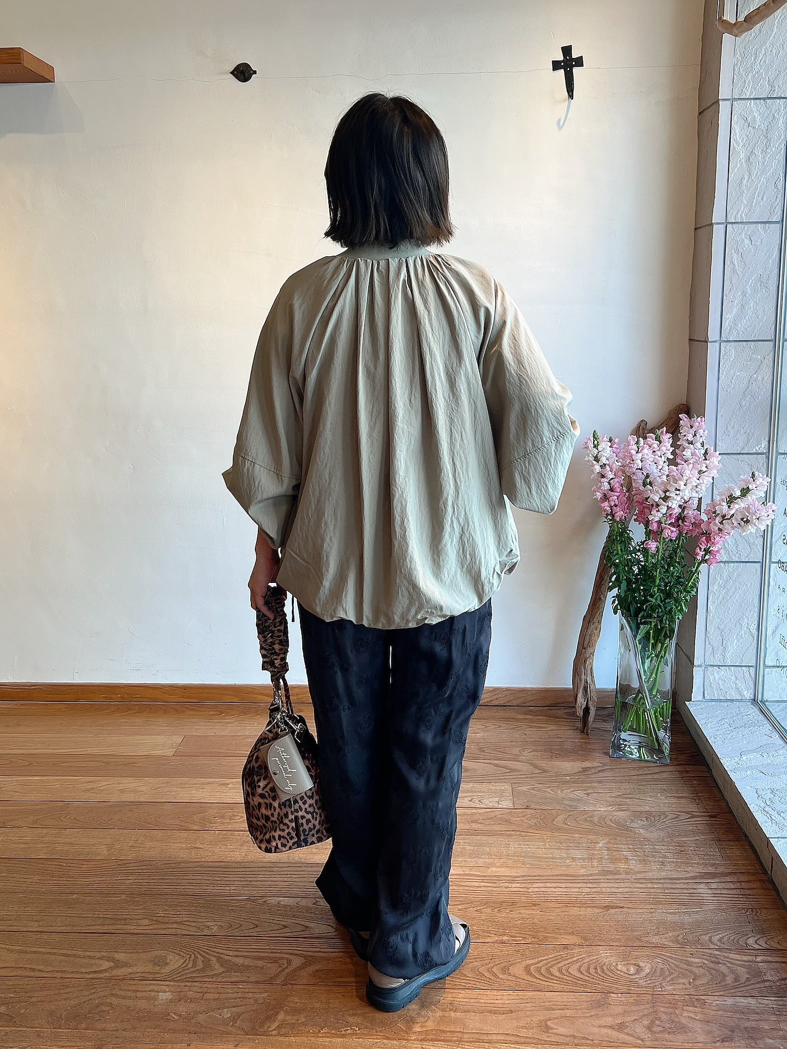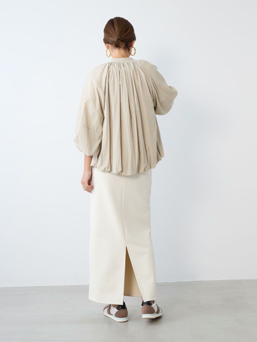 落ち感のある素材なのでたっぷりギャザーも張らずに身体に馴染みます。袖部分はたっぷりのギャザーと切替で立体感を出したバルーンスリーブで、たくし上げやすいように袖口はゴム仕様・袖は裏地なしの仕様です。裾部分はドロストで調整ができます。
