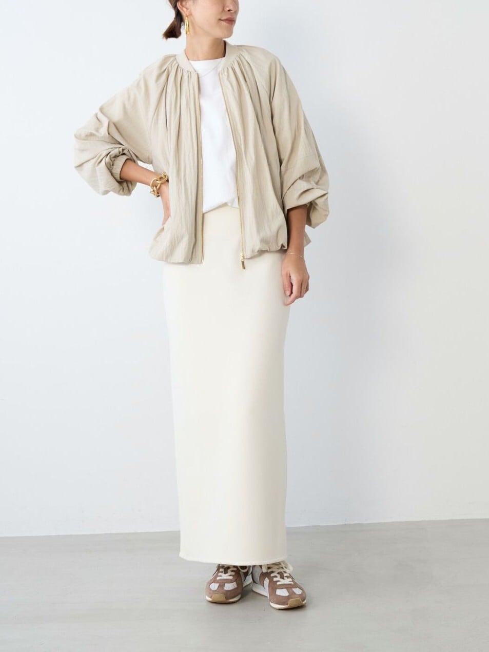 タイトスカートやワンピースなどを合わせ、大人レディな着こなしもおすすめ。足元はスニーカーで外したりパンプスで上品にまとめたりも。きれいめなパンツとも好相性で、洗練された大人のカジュアルスタイルが完成します。MA-1のカジュアルさにシアー素材の軽やかさや女性らしさが加わるため、様々なテイストのコーディネートが楽しめます。